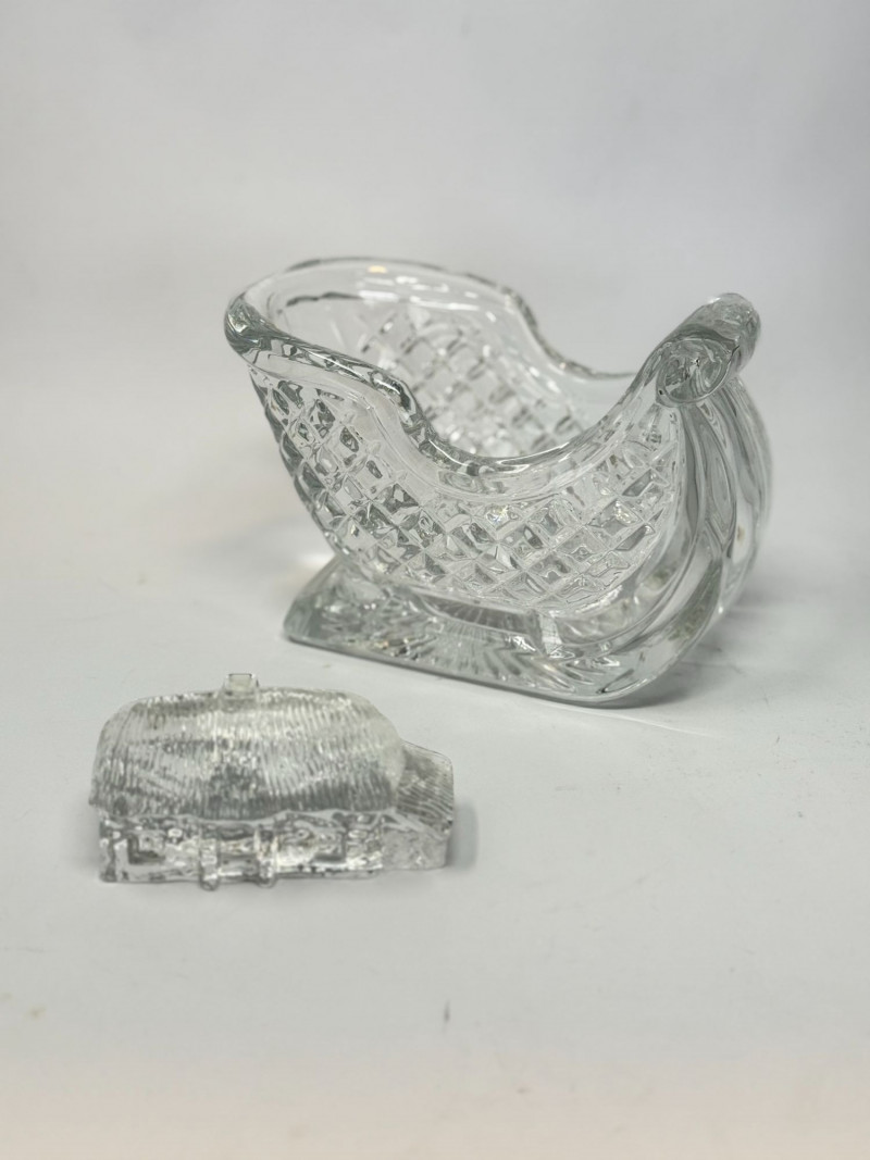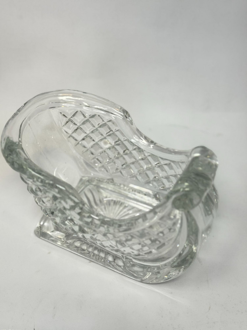 Charming vintage glass and crystal holiday décor set featuring a sleigh-shaped candy dish with a classic diamond-cut pattern and a small Waterford crystal cottage-style covered trinket dish. The sleigh is perfect for candy, nuts, or seasonal display, while the detailed Waterford cottage piece adds a collectible Irish crystal touch with fine craftsmanship and intricate texture. Great for holiday decorating, gift giving, or collectors of vintage crystal. Condition: Approx Dimensions: Historical Note & Estimated Value: Estimated value: $40–$90