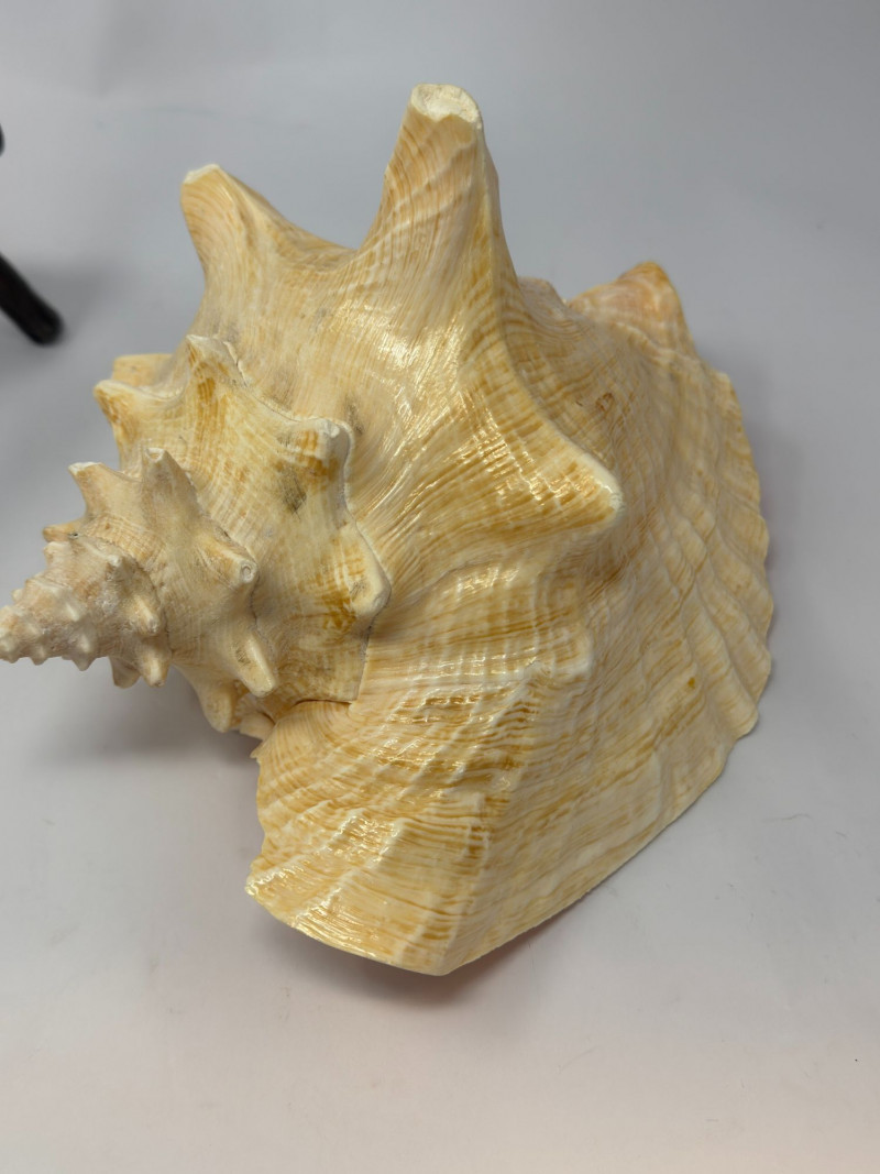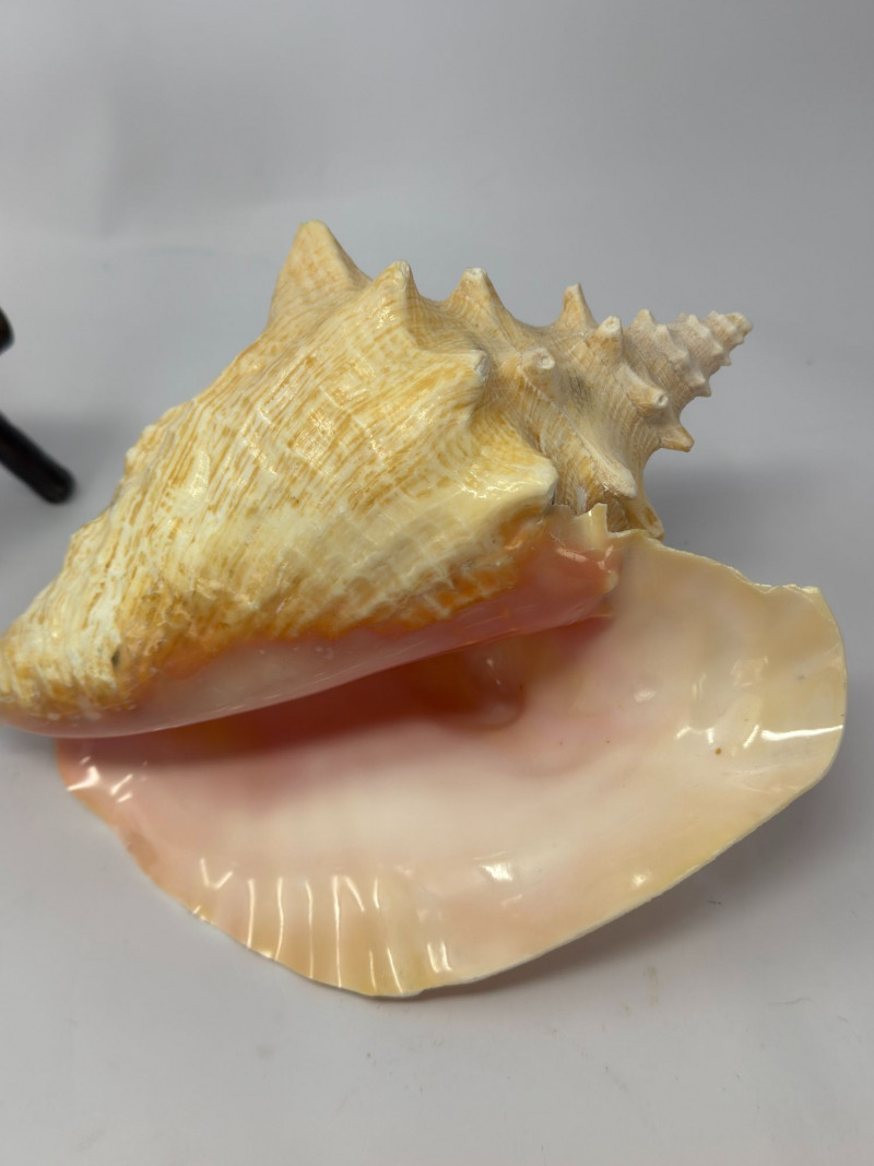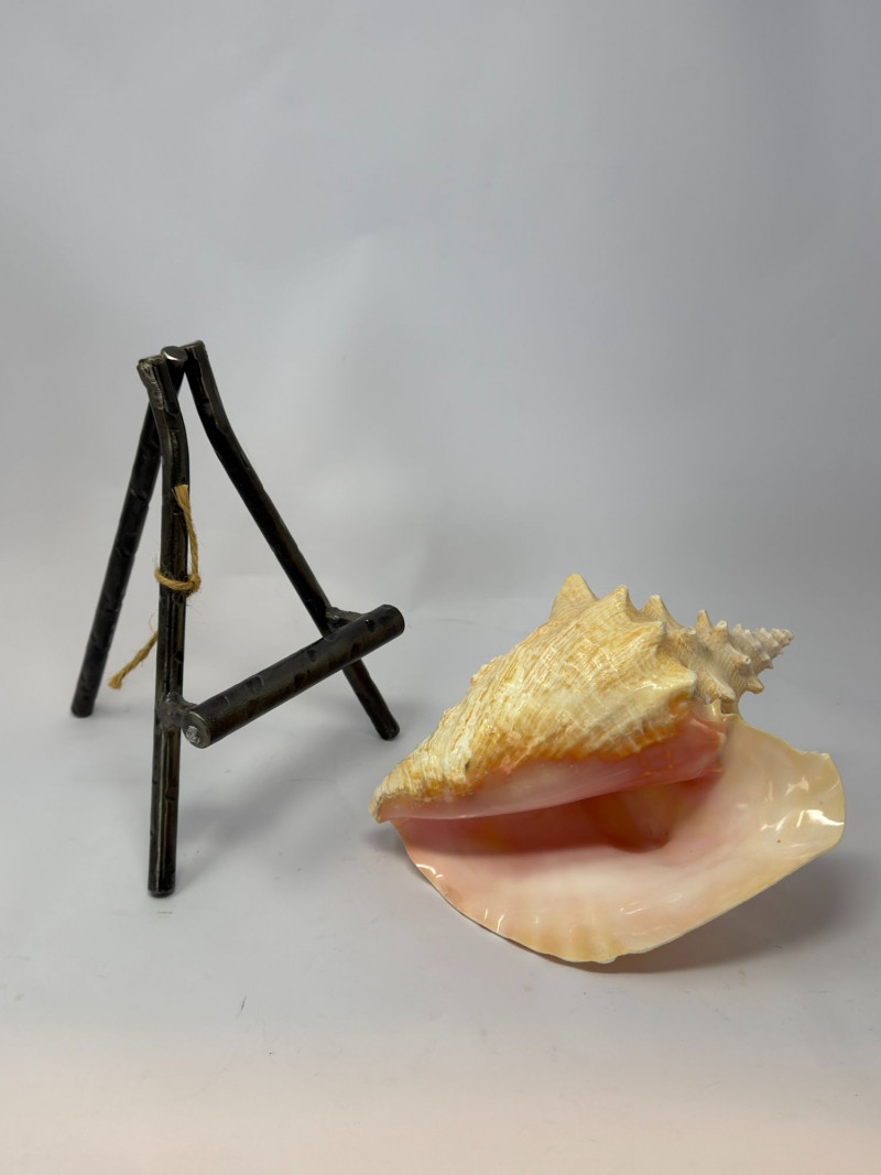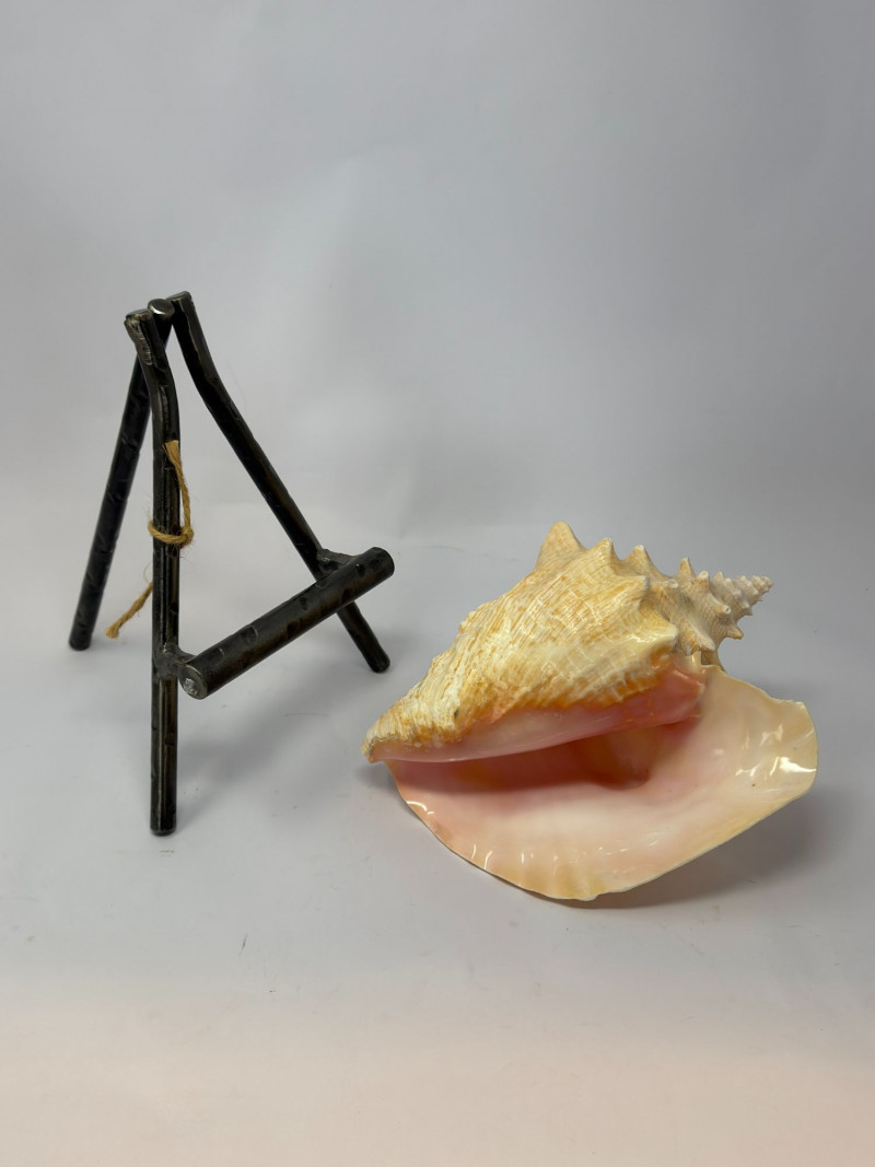 Vintage coastal décor set featuring a large natural conch seashell paired with a small metal A-frame tabletop display easel. The shell showcases beautiful peach and cream tones with a glossy pink interior and textured exterior. The included metal easel is a simple, functional A-frame style, commonly used to display plates, shells, or small artwork. It adds versatility, allowing the shell to be styled upright for display. Perfect for beach house décor, coastal styling, or curio shelf display. Condition: Approx Dimensions: Historical Note: