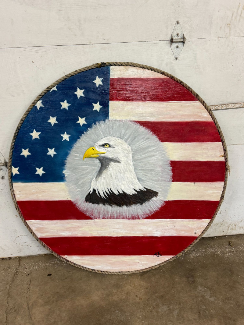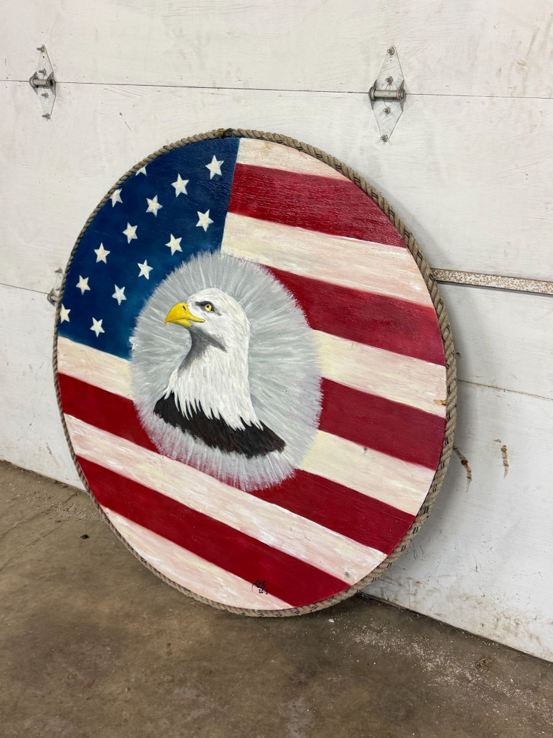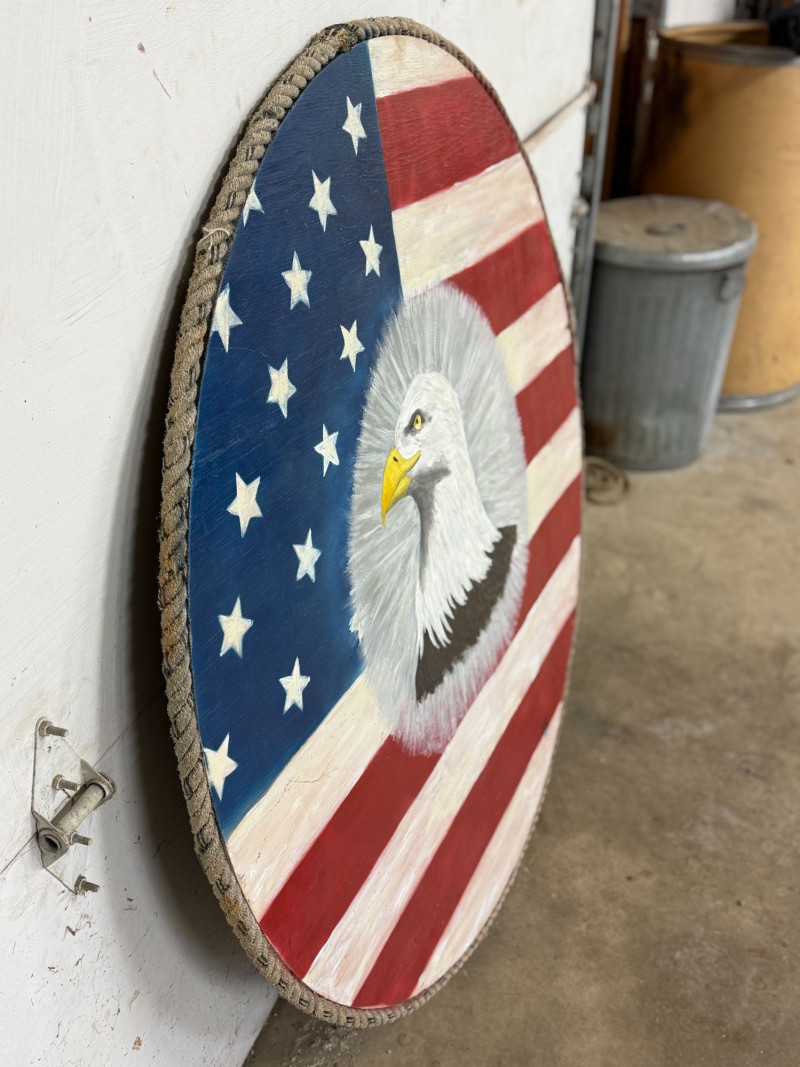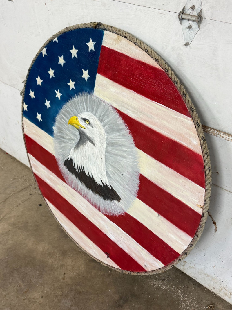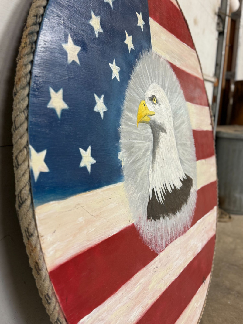 Large-scale hand-painted wooden wall art featuring a bold American flag with a detailed bald eagle centerpiece. This round piece makes a strong visual statement, especially at its oversized scale, and is framed with a rustic rope edge for added texture. Signed and dated “Becker’s Woodcrafts 2015” on the back, giving it a unique handmade, artisan quality. Ideal for patriotic décor, garages, man caves, cabins, or statement gallery walls. Condition: Approx Dimensions: Historical Note: