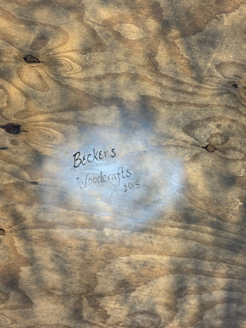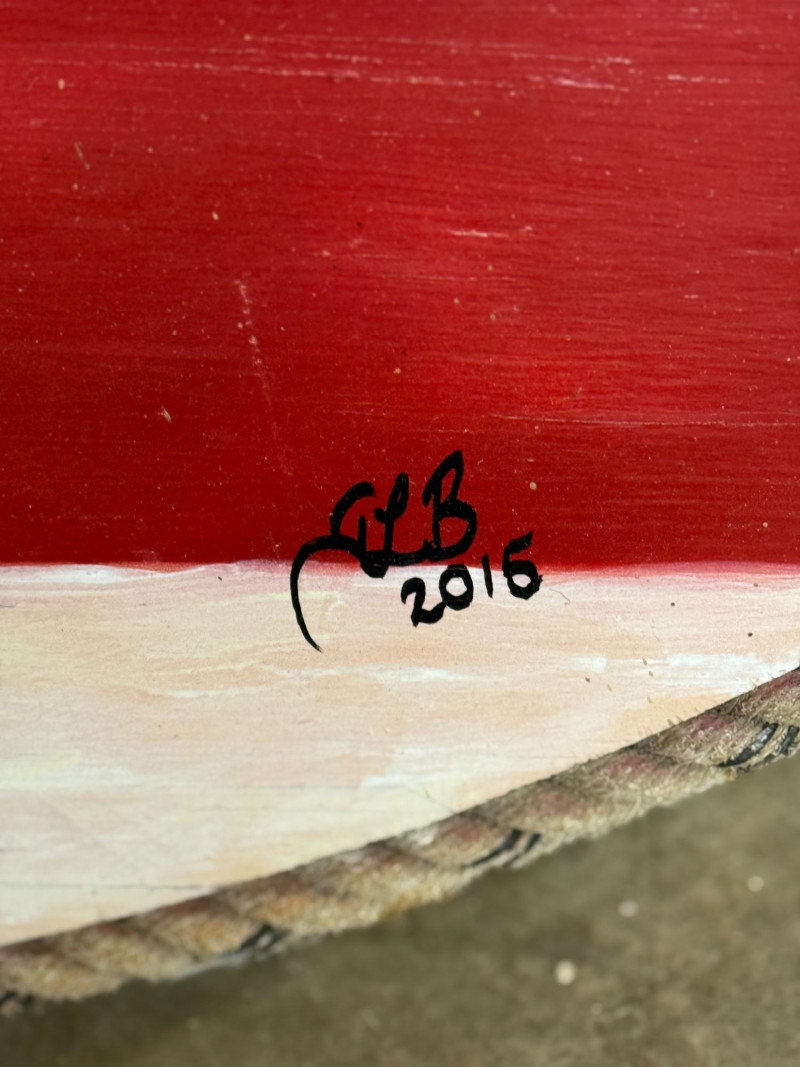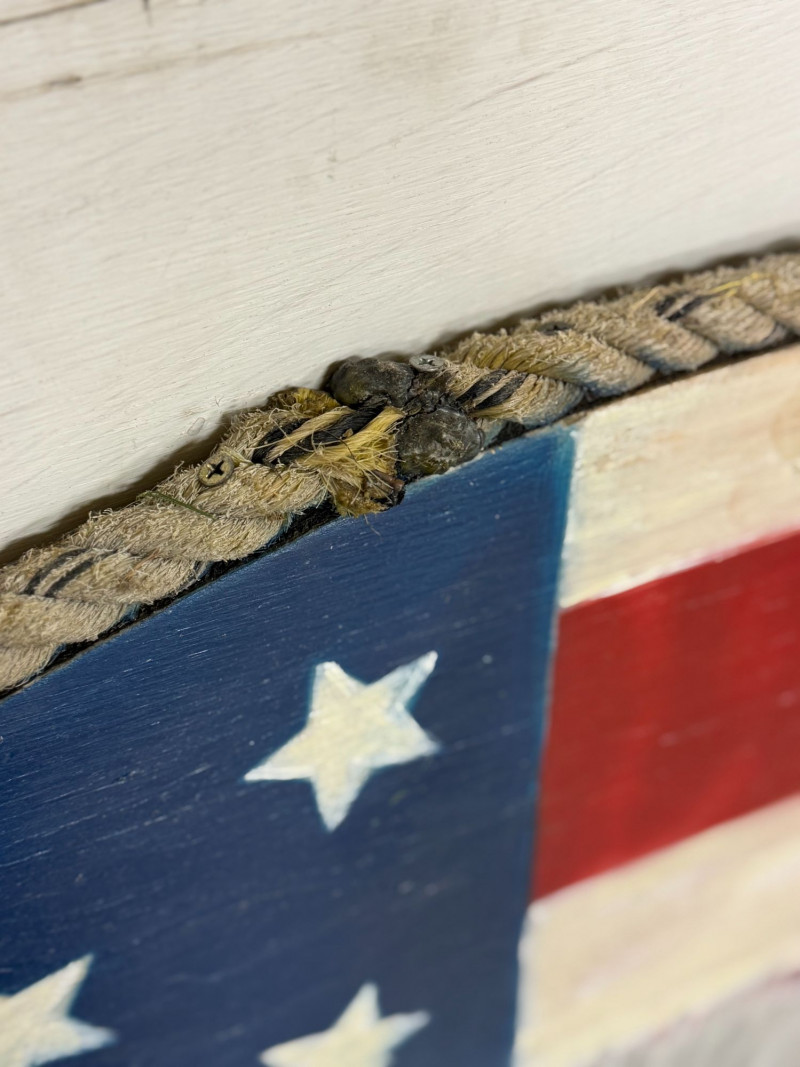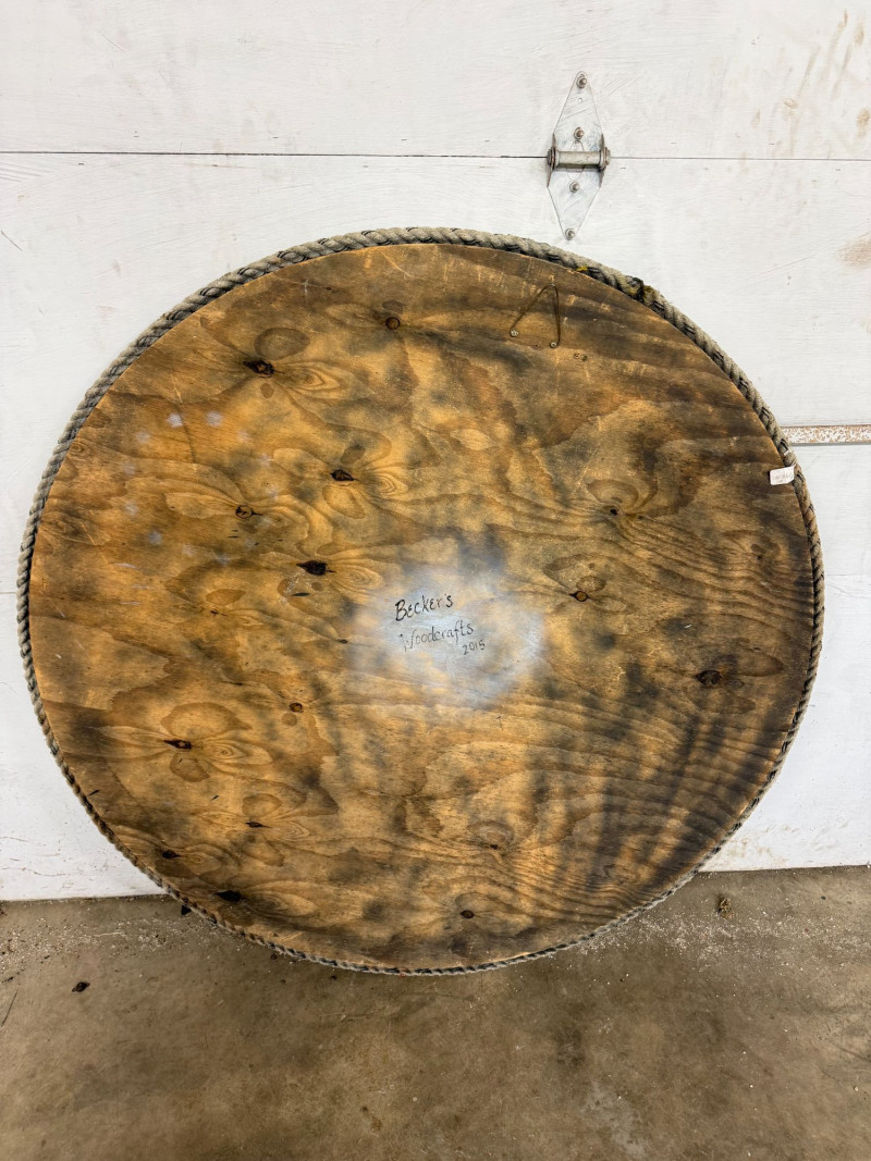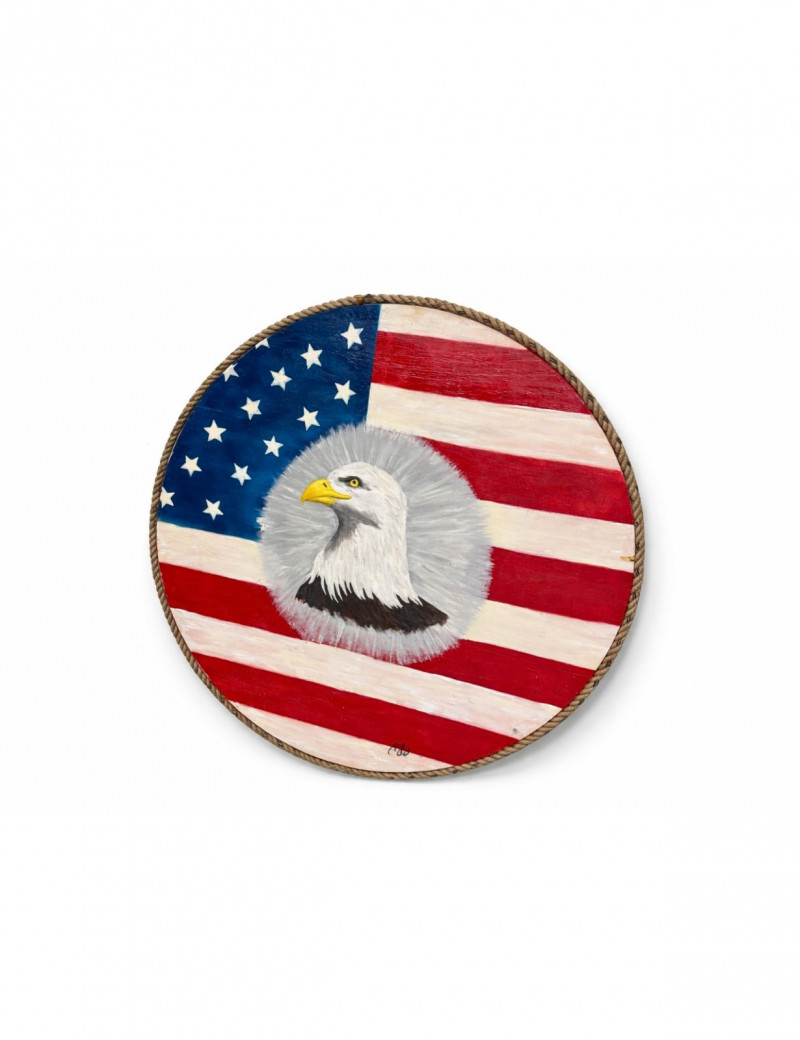 Large-scale hand-painted wooden wall art featuring a bold American flag with a detailed bald eagle centerpiece. This round piece makes a strong visual statement, especially at its oversized scale, and is framed with a rustic rope edge for added texture. Signed and dated “Becker’s Woodcrafts 2015” on the back, giving it a unique handmade, artisan quality. Ideal for patriotic décor, garages, man caves, cabins, or statement gallery walls. Condition: Approx Dimensions: Historical Note: