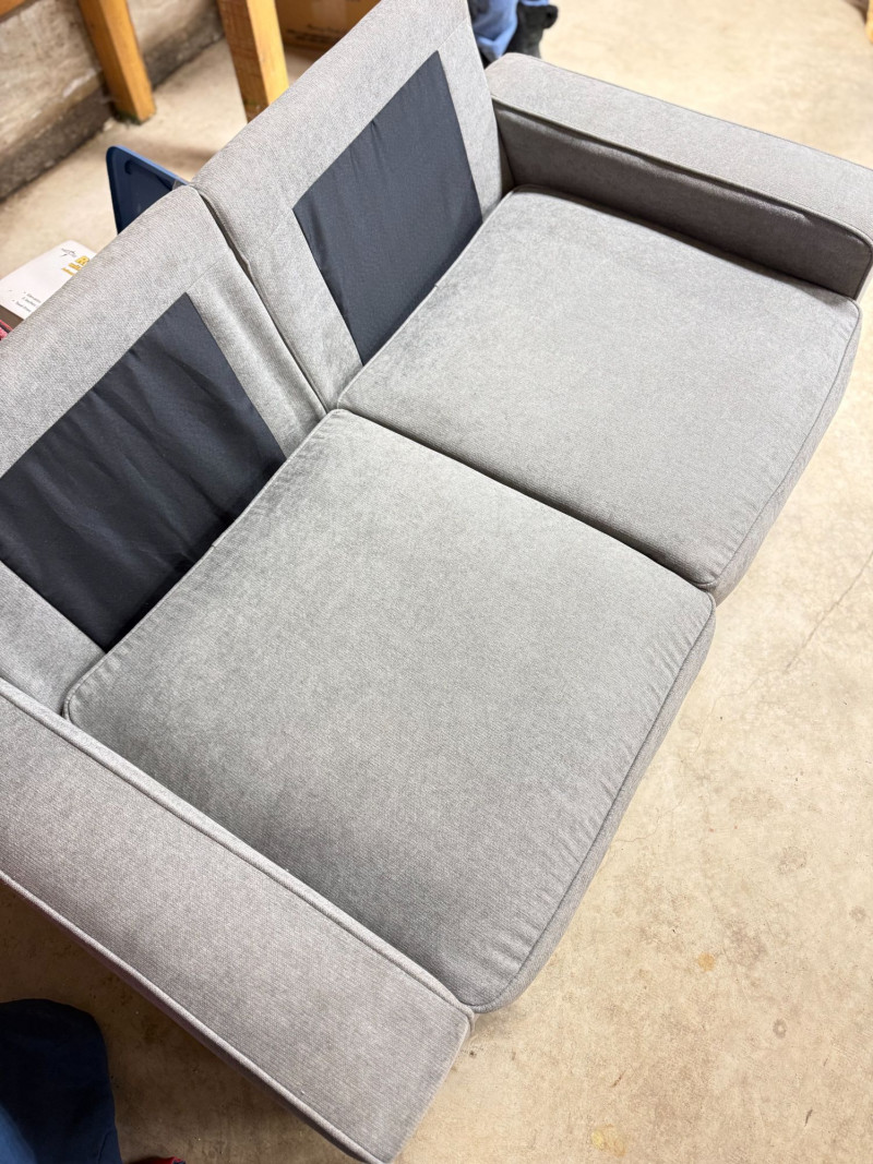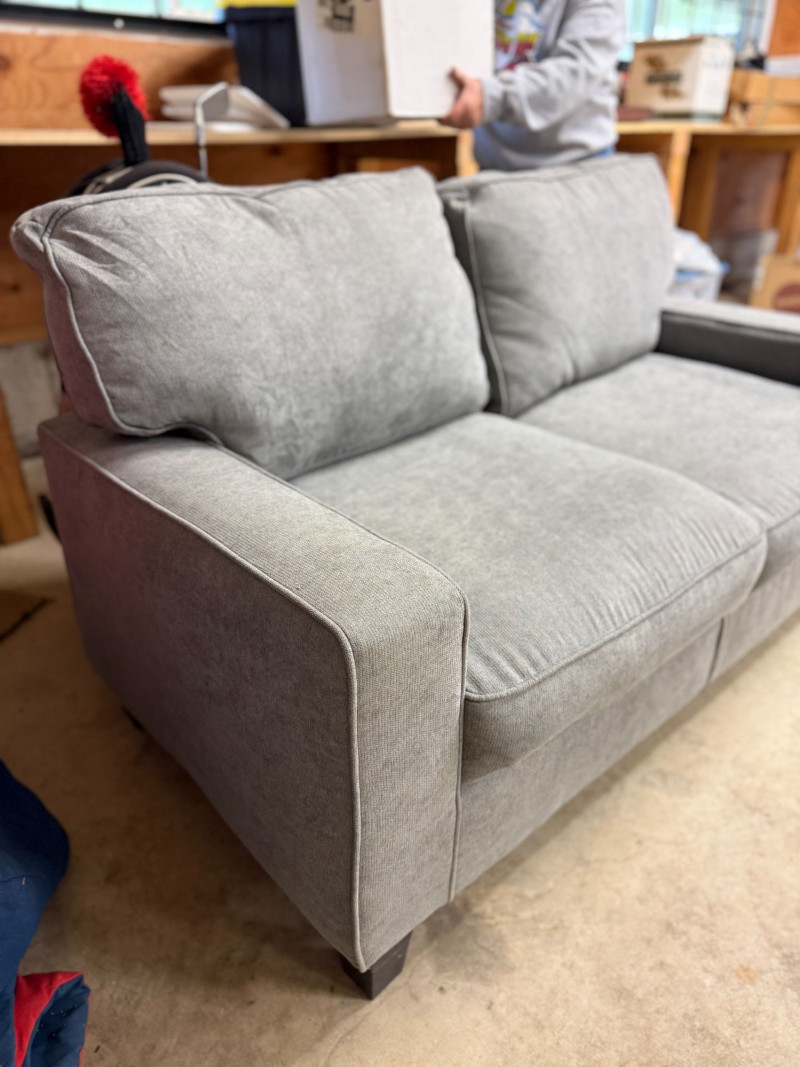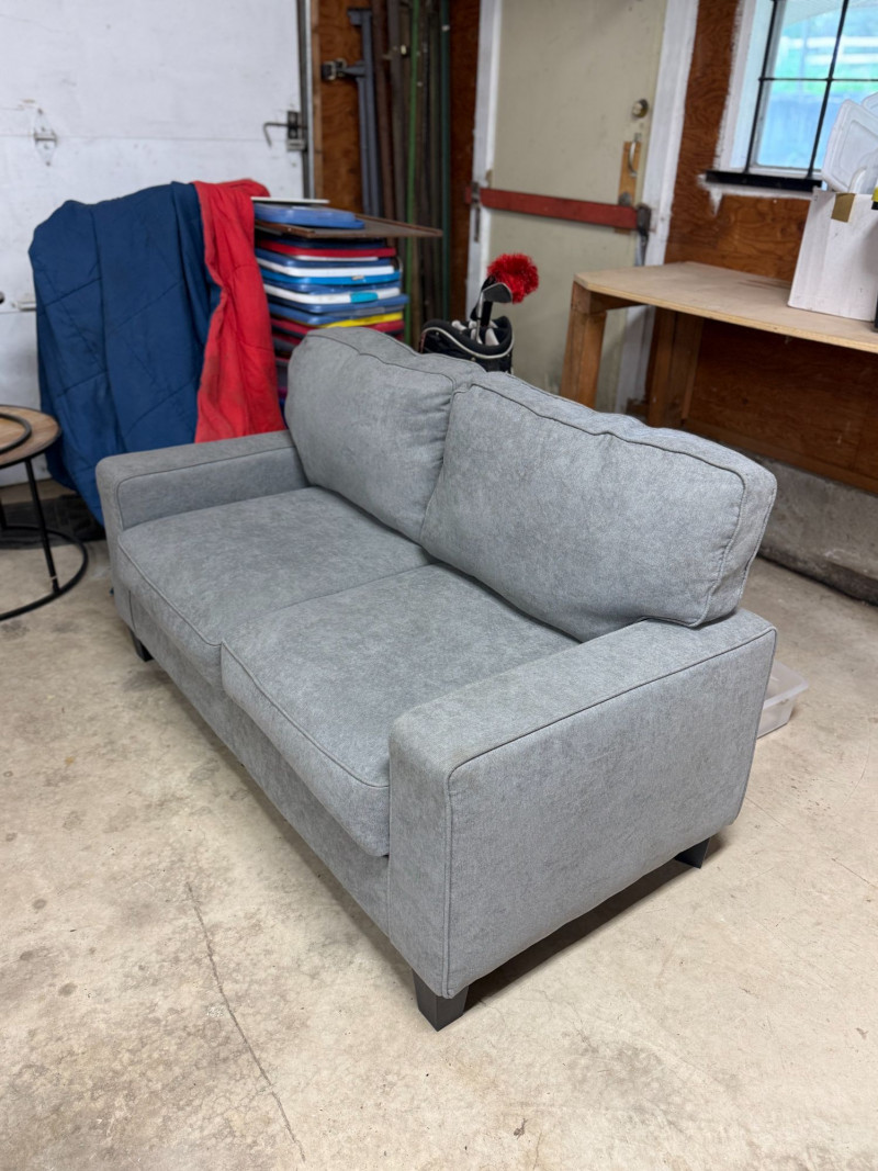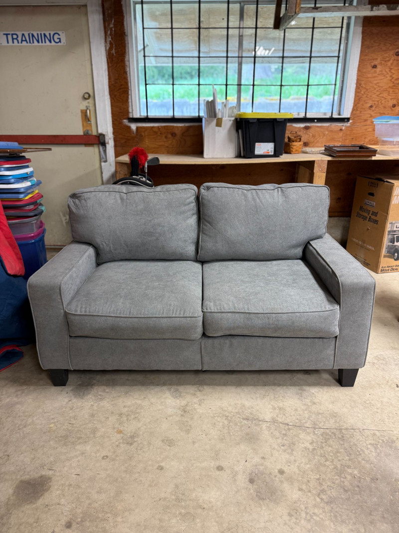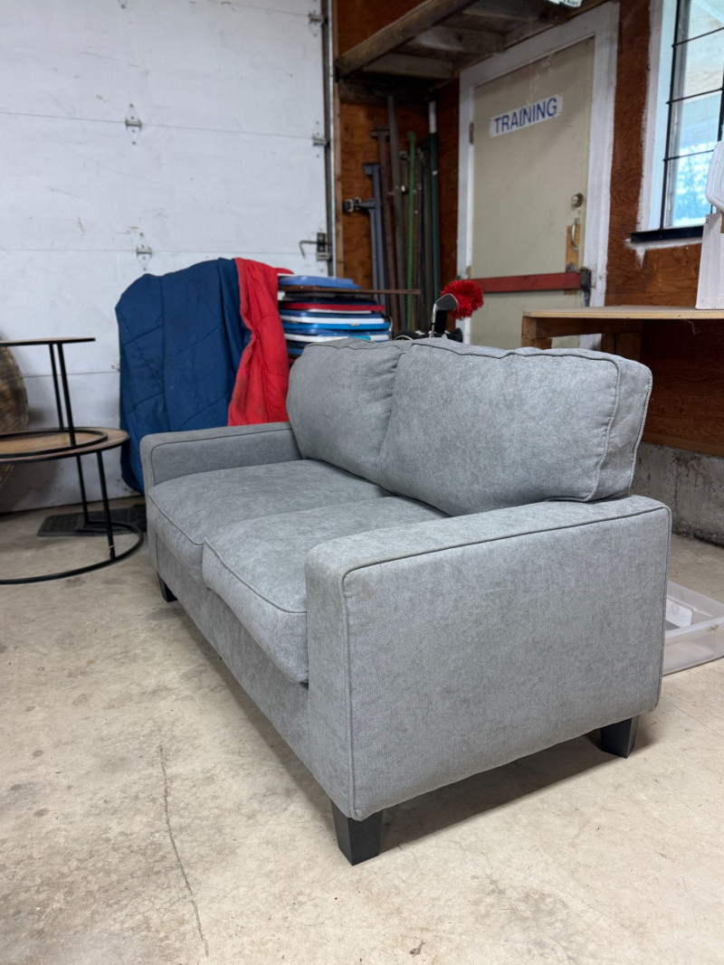 Modern gray loveseat by Ebern Designs featuring clean lines, recessed arms, and plush cushioned seating. Upholstered in a soft, neutral gray fabric that easily complements a variety of interior styles from contemporary to minimalist. Compact 61” width makes it perfect for apartments, offices, or smaller living spaces while still offering comfortable seating for two. Simple, versatile design with dark tapered legs. Condition: Approx Dimensions: Historical Note & Estimated Value: Estimated value: $250–$400 (retail ~$500)