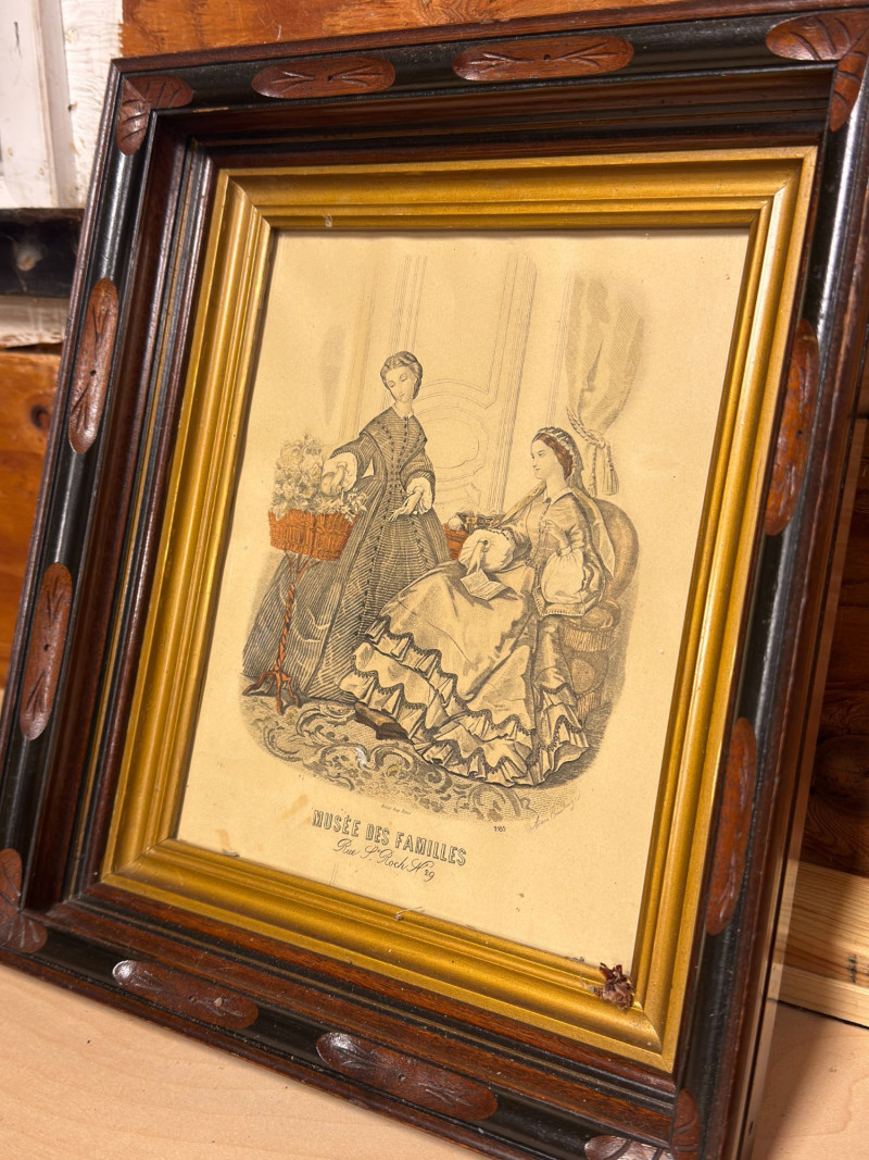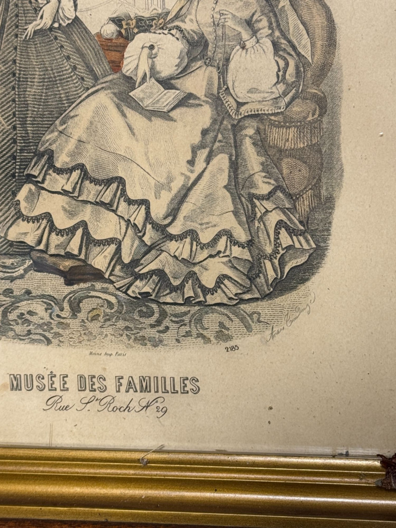 Musée des Familles was a 19th-century French publication known for literature and illustrated fashion plates. Prints like these were often repurposed and framed in the late 19th to early 20th century for decorative use.