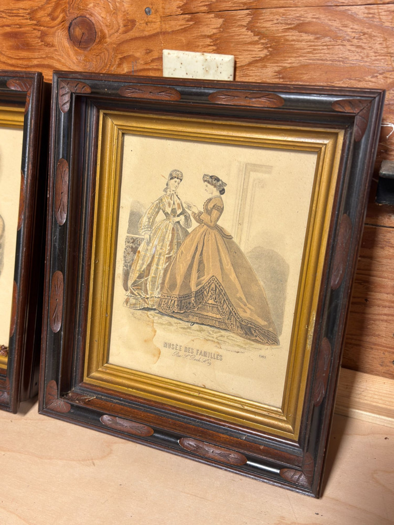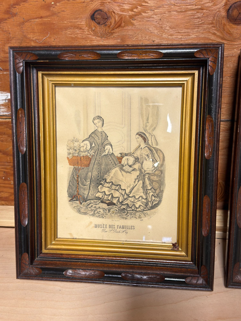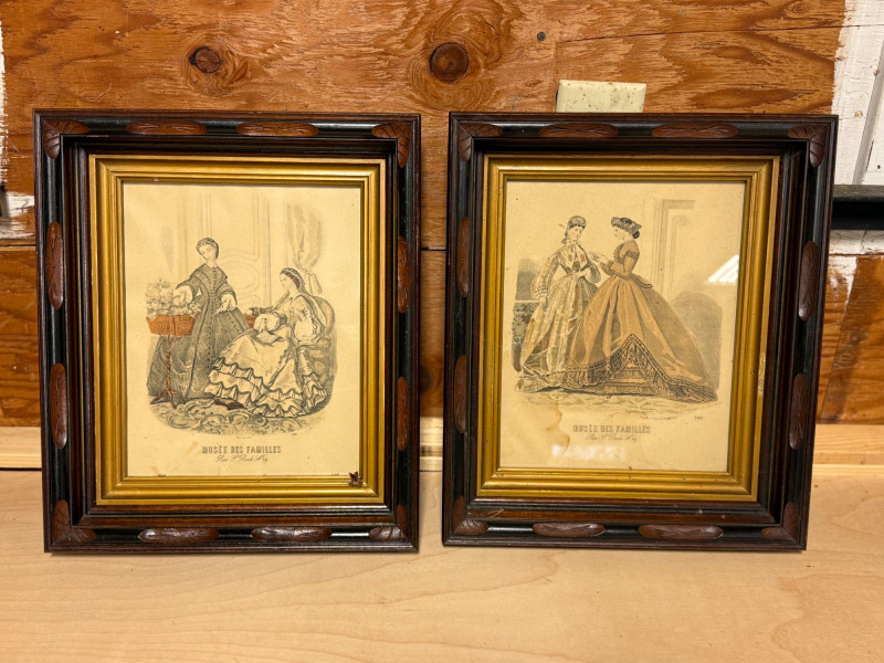 Beautiful pair of antique-style framed prints featuring 19th-century French fashion illustrations from Musée des Familles. These detailed engravings depict Victorian-era women in elaborate period dresses, capturing the elegance and style of the time. Each print is housed in an ornate, dark wood frame with carved decorative accents and a gold-tone inner border, giving them a classic, timeless look perfect for traditional, vintage, or eclectic interiors. The prints include visible publication text “Musée des Familles – Rue St Roch No. 29” along the bottom, adding authenticity and charm. Intricate linework and composition make these especially appealing for collectors of fashion history or European decor. Condition: Approx Dimensions: Historical Note & Estimated Value: Estimated value: $80–$180