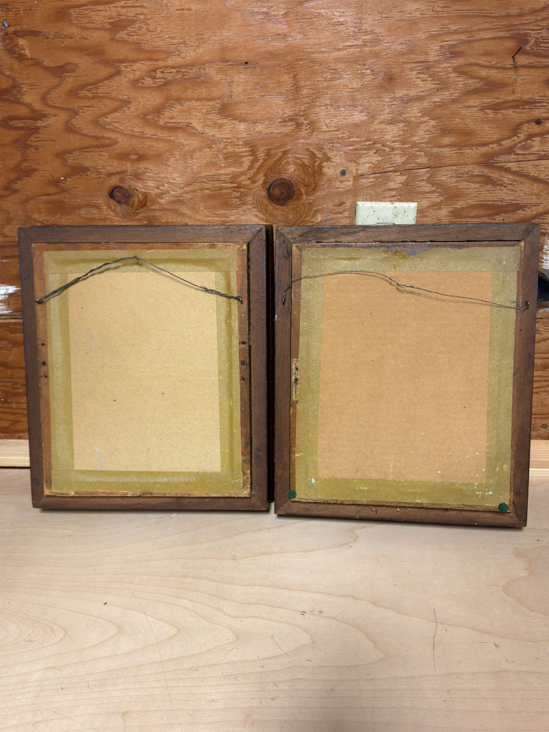 Good vintage condition. Frames show some wear consistent with age including minor scuffs and backing wear. Prints have age-related toning and light imperfections visible in photos, adding to their antique character.