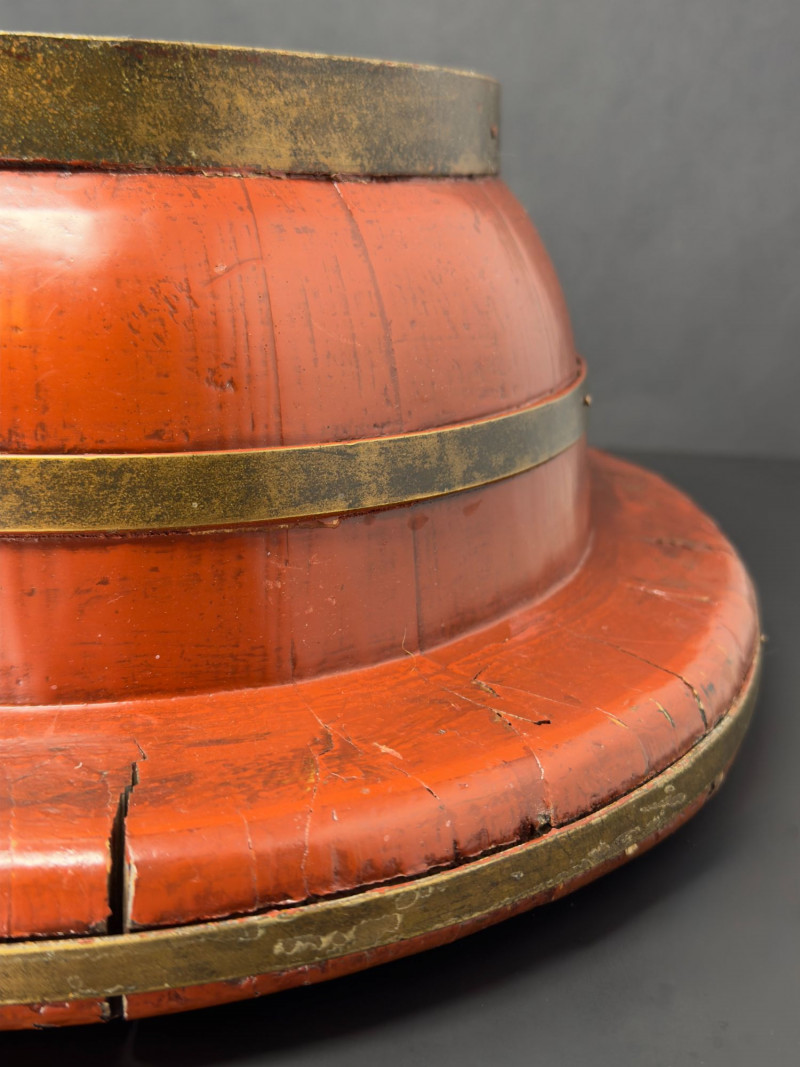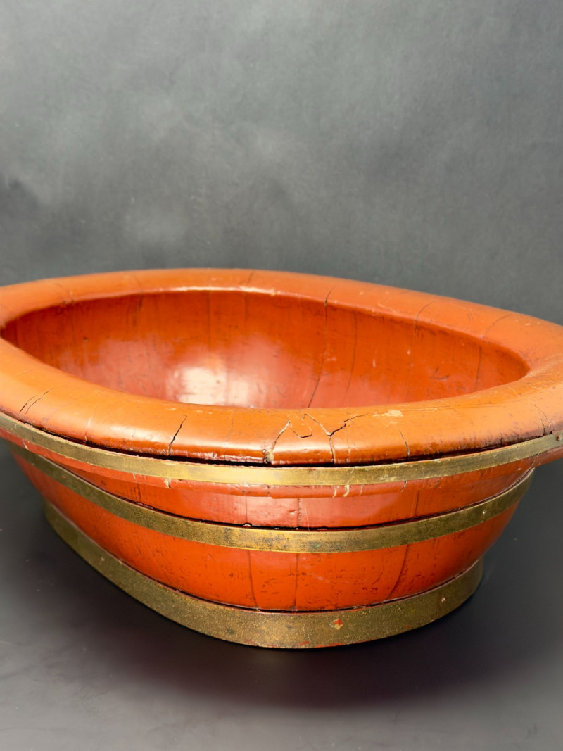 19th Century Chinese Lacquered Wood Basin — Peachwood with Bronze Bands This substantial antique Chinese basin is crafted from peachwood and finished in a rich red lacquer, reinforced with forged bronze bands. The form features a wide, rounded rim and stepped profile, giving the piece both visual weight and architectural presence. The lacquered surface displays a deep, time-earned patina, while the bronze bands provide contrast and structural integrity. Originally intended as a functional basin, this piece now serves equally well as a decorative object, centerpiece, or sculptural accent in a curated interior. Type: Large basin / bowl Approximate Measurements: Measurements are approximate and provided for reference. Condition: Historical Note: Value Context: