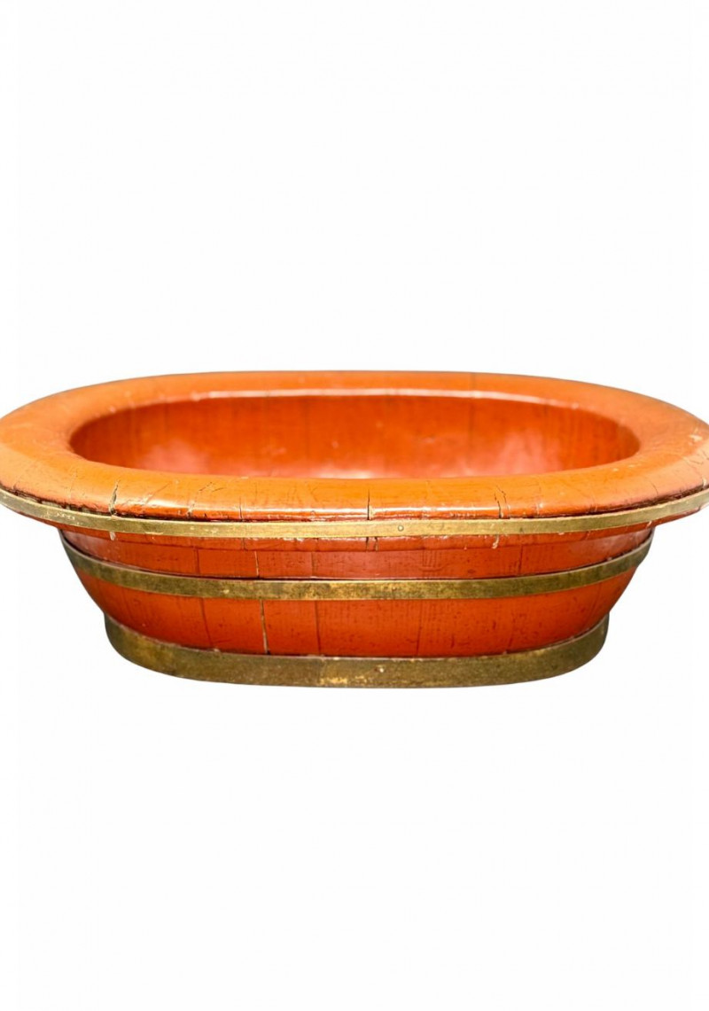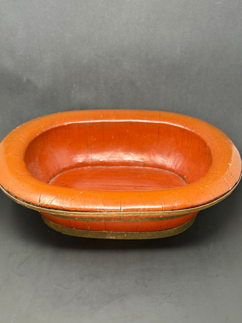 Lacquered wooden basins such as this were commonly produced in China during the 19th century for domestic and ceremonial use. Peachwood was favored for its durability, while red lacquer symbolized prosperity and protection. Bronze reinforcement added both strength and decorative refinement.