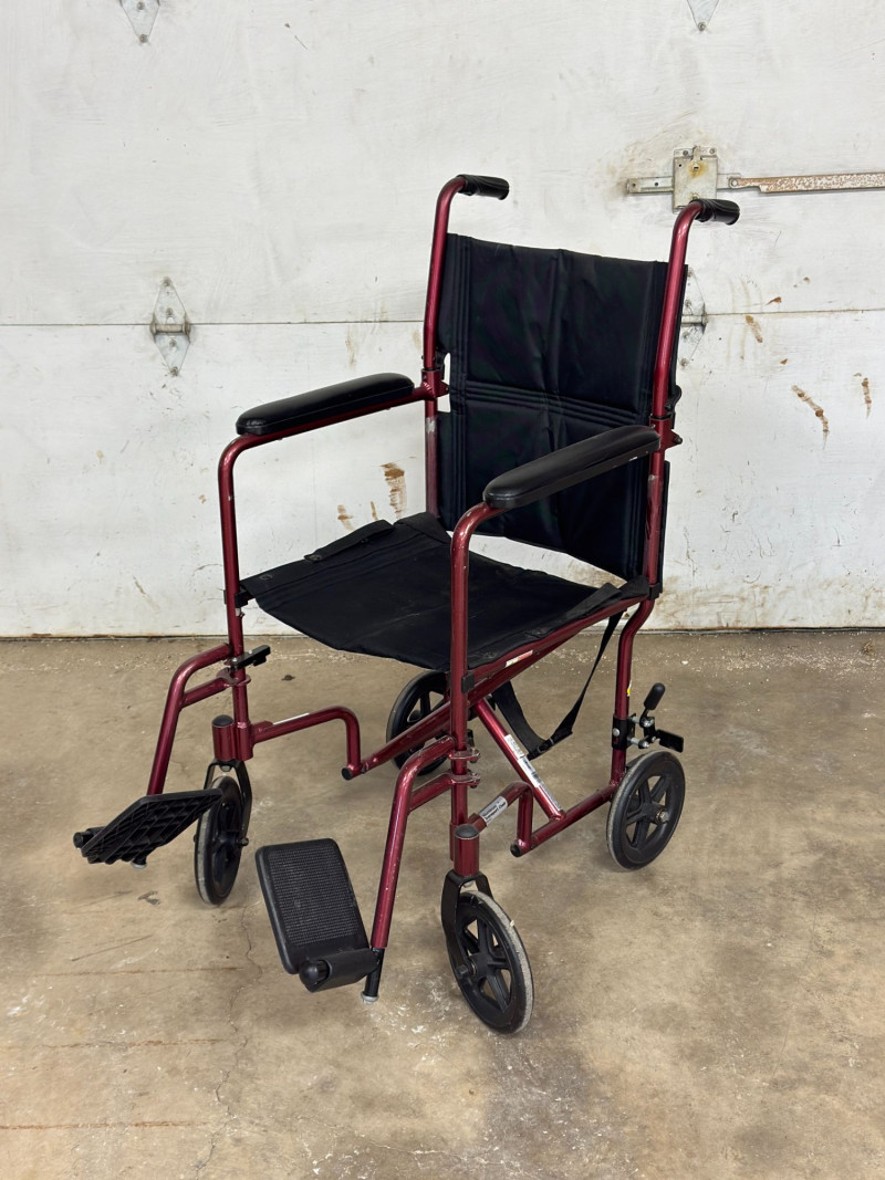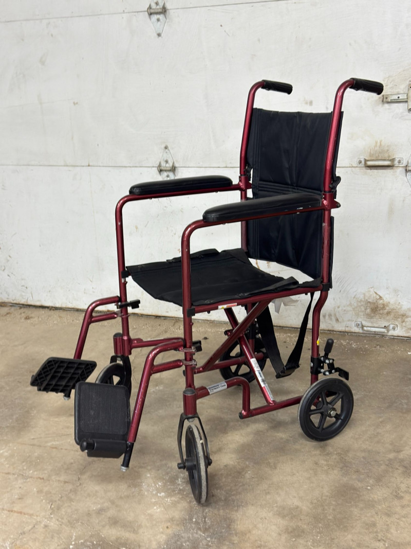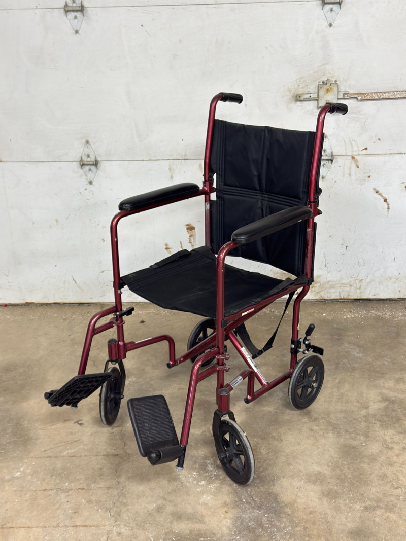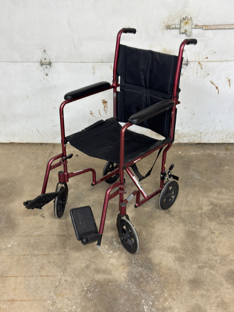 Practical and easy-to-use lightweight transport wheelchair, designed for assisted mobility and travel. This chair features a compact folding frame, making it ideal for transport, storage, and everyday use. Equipped with padded armrests, a supportive sling seat and back, and swing-away footrests for easy entry and exit. The smaller rear wheels indicate this is a transport-style chair, intended to be pushed by a caregiver rather than self-propelled. The durable metal frame has a clean red finish, giving it a nice look while remaining sturdy and reliable. Condition: Key Features: Estimated Value:
