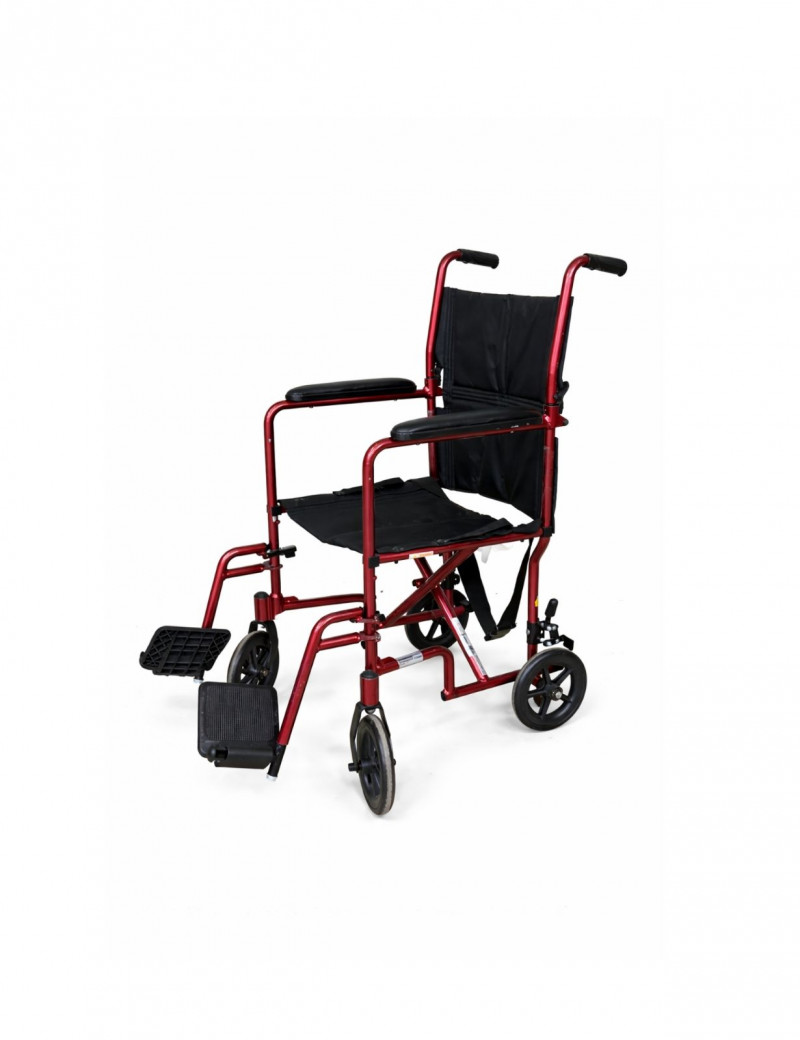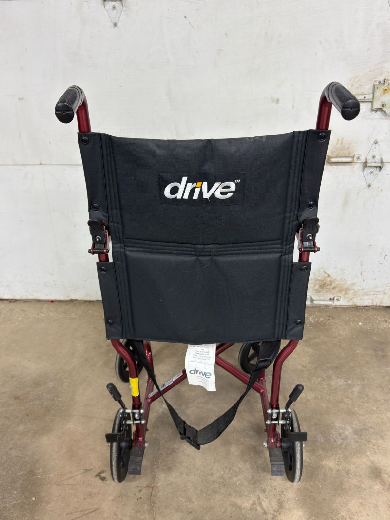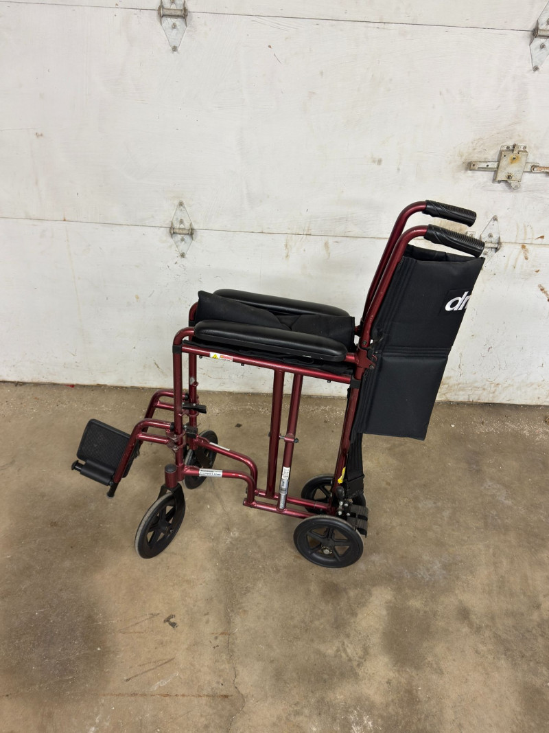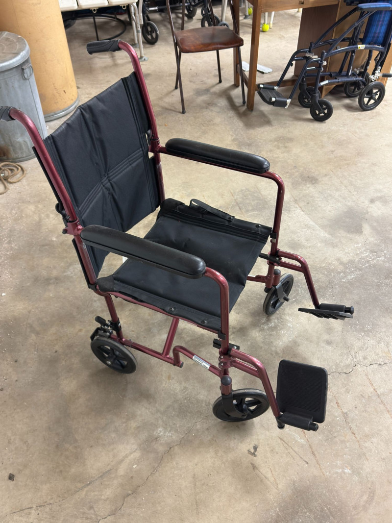 Practical and easy-to-use lightweight transport wheelchair, designed for assisted mobility and travel. This chair features a compact folding frame, making it ideal for transport, storage, and everyday use. Equipped with padded armrests, a supportive sling seat and back, and swing-away footrests for easy entry and exit. The smaller rear wheels indicate this is a transport-style chair, intended to be pushed by a caregiver rather than self-propelled. The durable metal frame has a clean red finish, giving it a nice look while remaining sturdy and reliable. Condition: Key Features: Estimated Value: