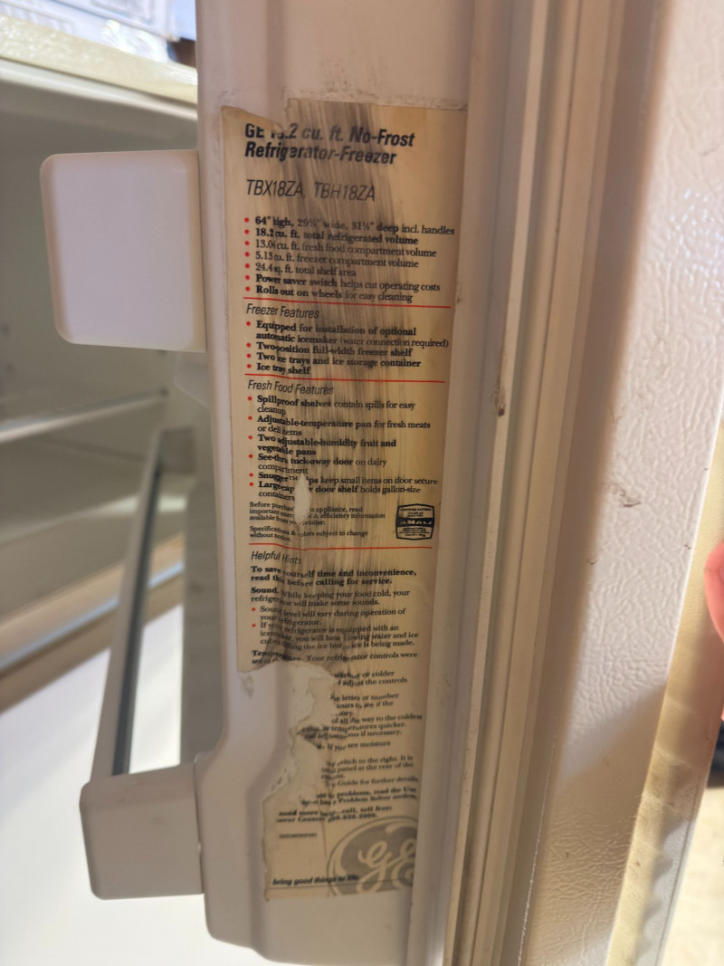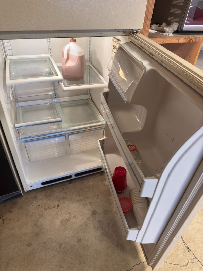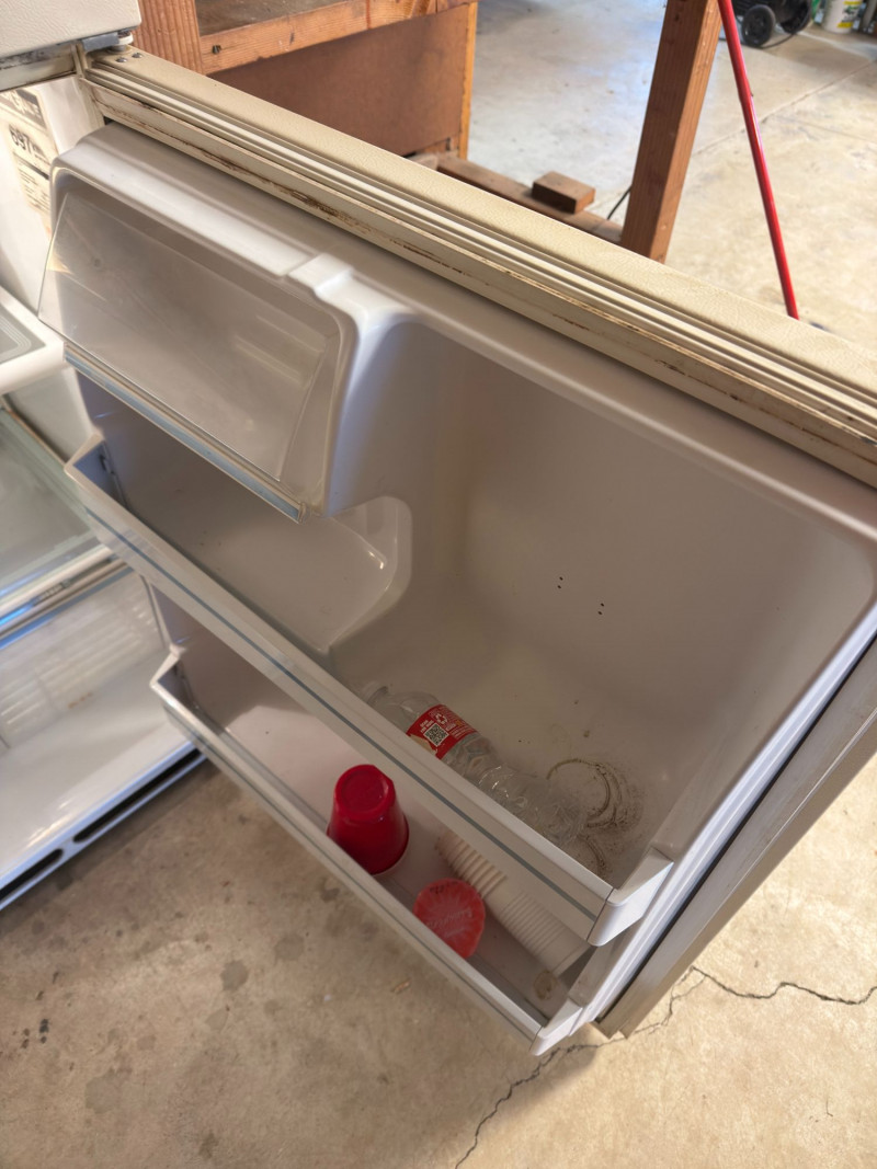 Vintage GE top freezer refrigerator in a classic cream/off-white finish. Fully functional and clean inside, making it a great option for a garage, basement, shop, or secondary fridge. Interior includes adjustable glass shelves, crisper drawers, and a top freezer compartment. Simple, durable older build—these older units are known for reliability. Condition: Features: Approx Size: Notes: Pricing Insight: