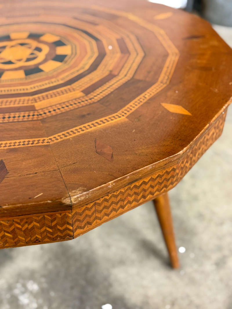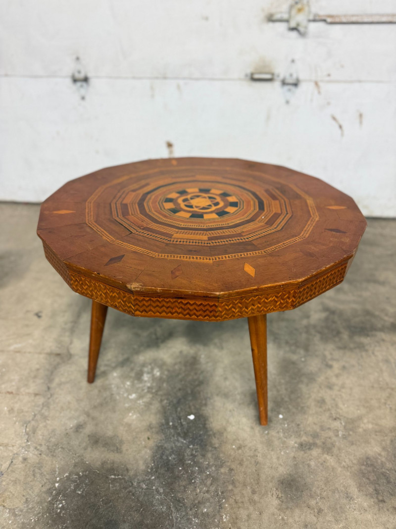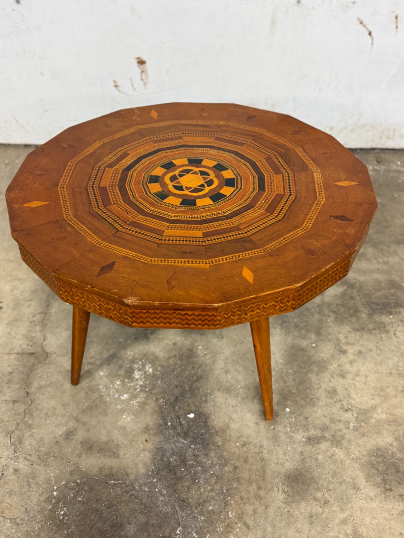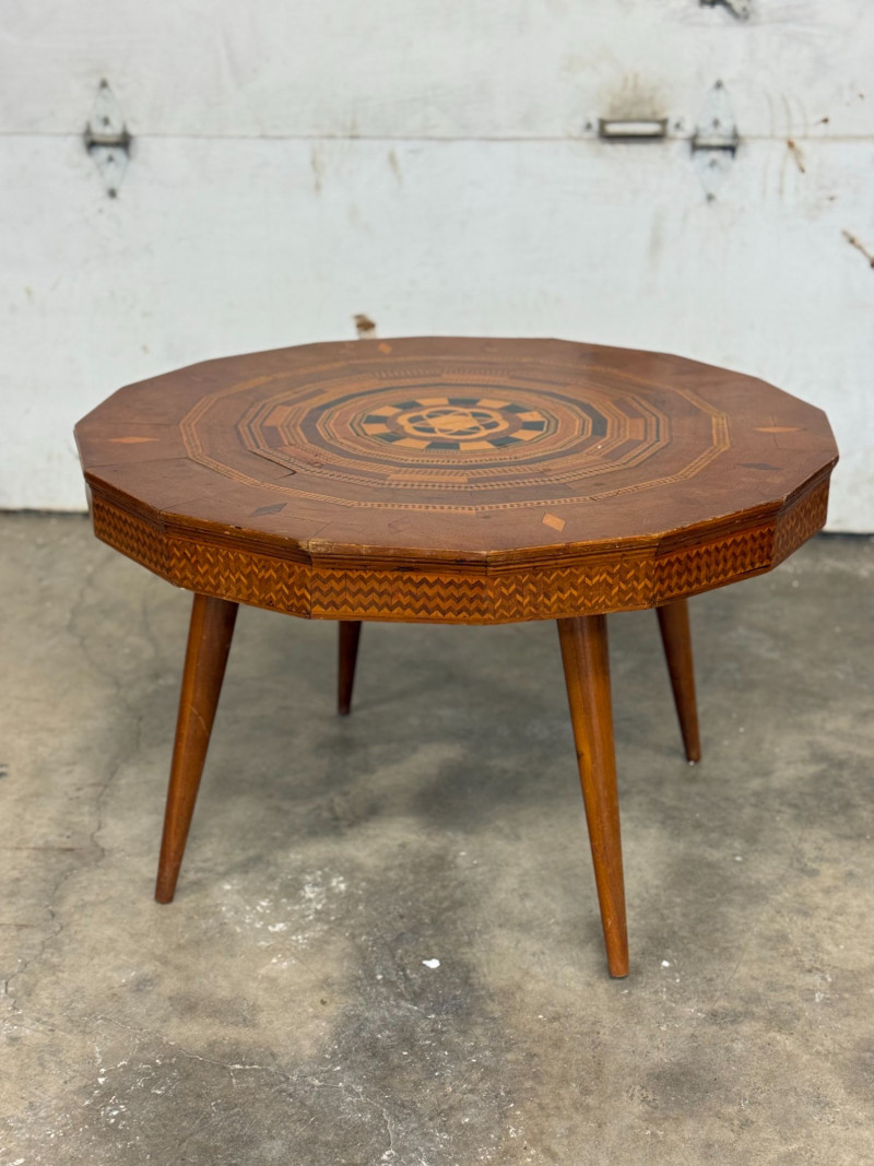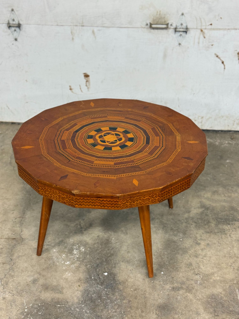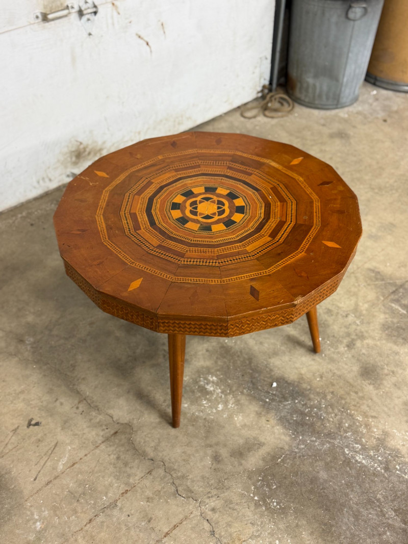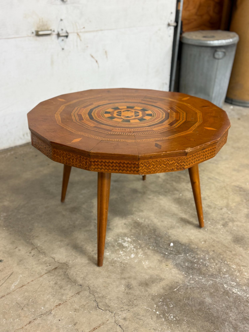 Unique vintage handmade coffee table featuring intricate hand-laid wood inlay work, often referred to as prison art or tramp art style craftsmanship. Each geometric segment and pattern was individually cut and placed by hand, creating a detailed radial design with rich wood tones and contrast throughout. This is a one-of-a-kind piece with real character and history—perfect for collectors of folk art, rustic decor, or statement furniture. Dimensions: Condition: Structurally solid and ready to use. Style: