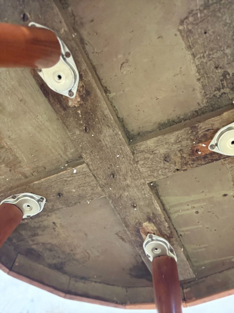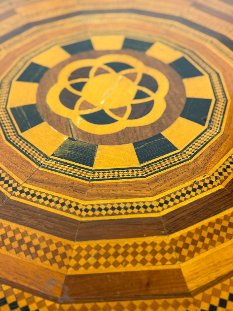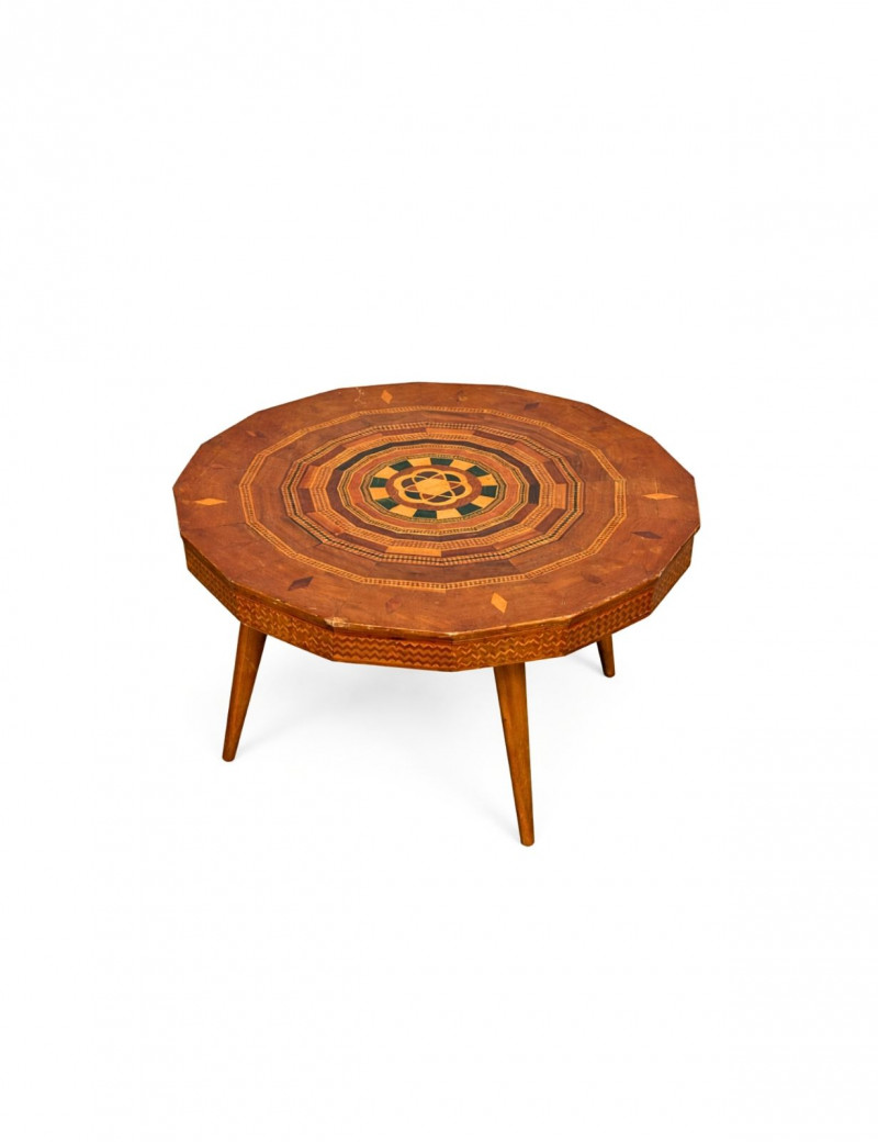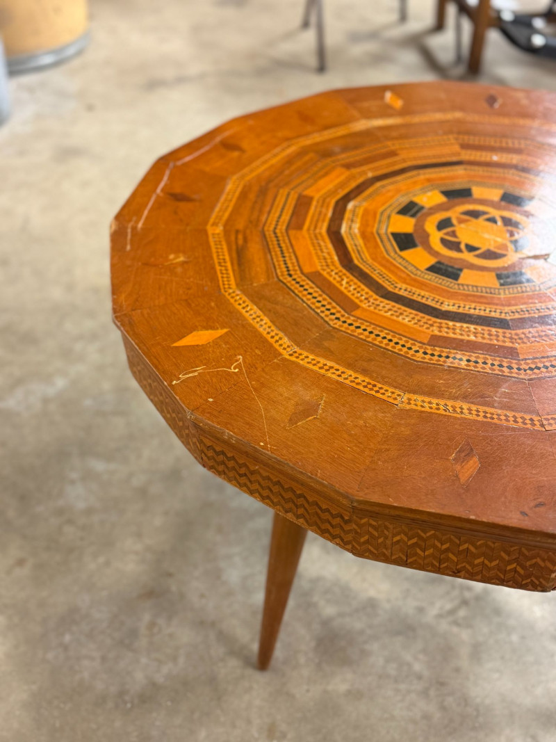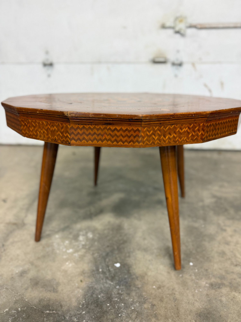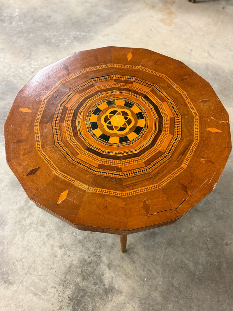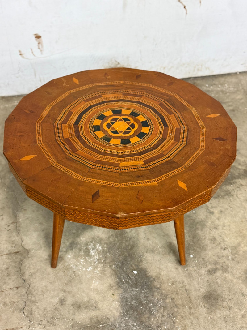 Unique vintage handmade coffee table featuring intricate hand-laid wood inlay work, often referred to as prison art or tramp art style craftsmanship. Each geometric segment and pattern was individually cut and placed by hand, creating a detailed radial design with rich wood tones and contrast throughout. This is a one-of-a-kind piece with real character and history—perfect for collectors of folk art, rustic decor, or statement furniture. Dimensions: Condition: Structurally solid and ready to use. Style: