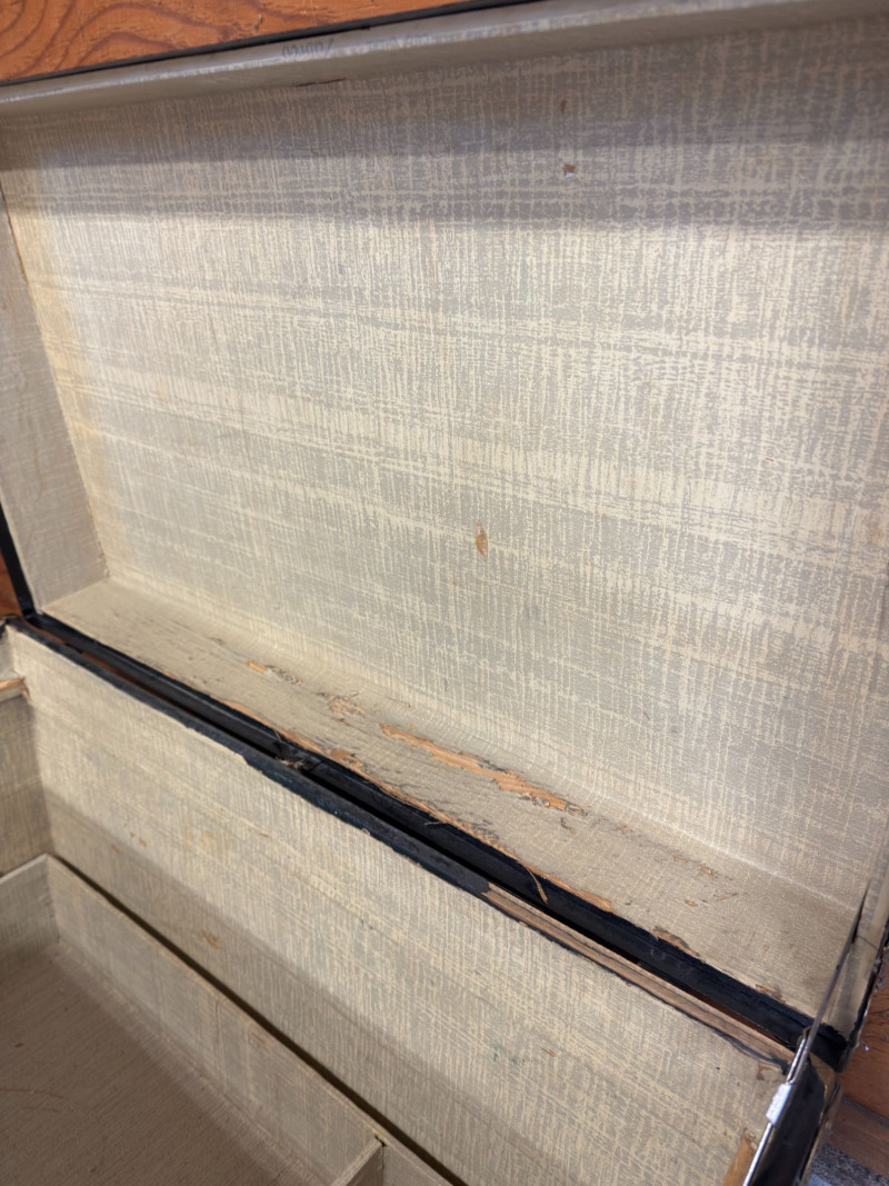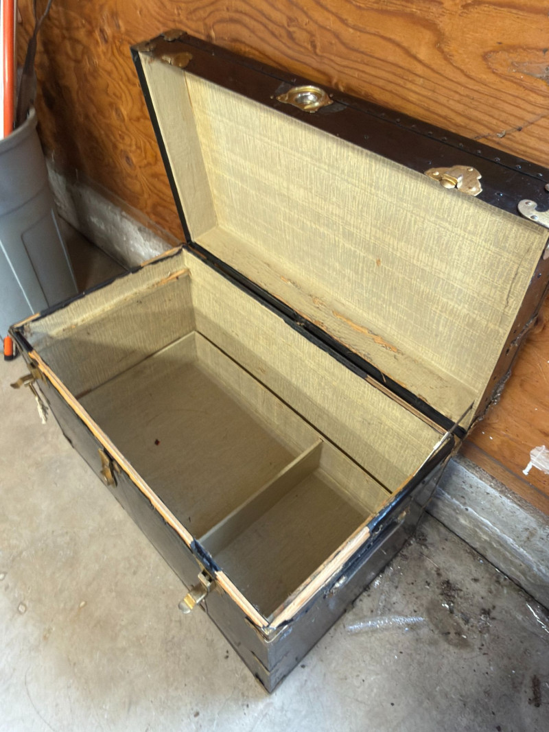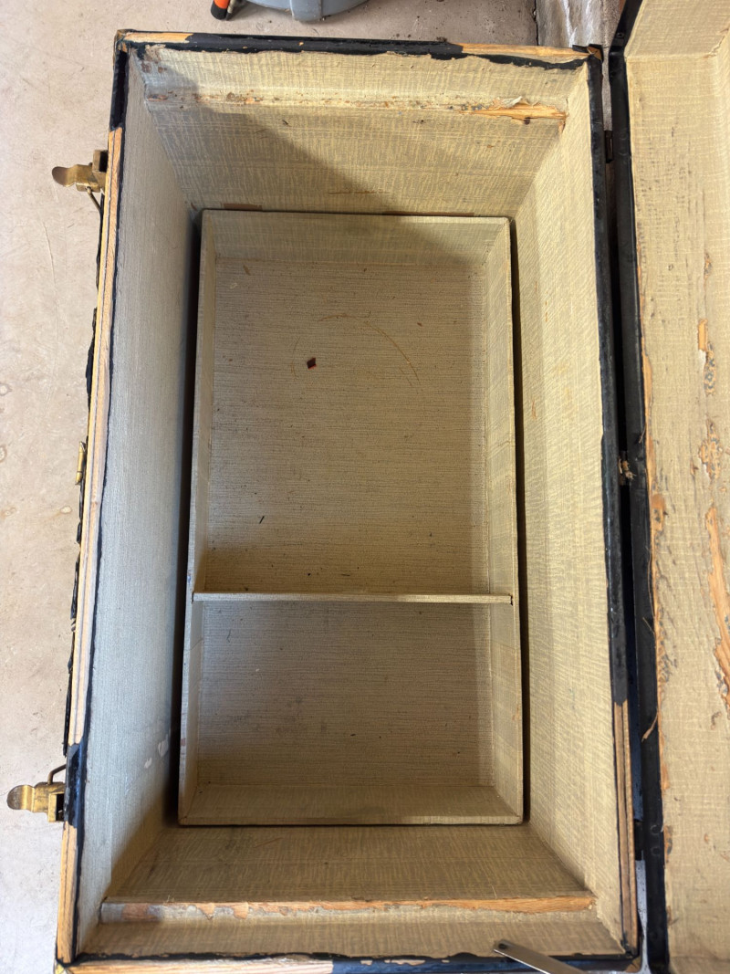 Vintage black steamer trunk / storage chest featuring original brass hardware, latches, and corner guards. Solidly built with a wood frame and metal exterior, this piece has great character and patina from age. Interior is lined and includes a small divided compartment for storage. Perfect for: Features: Condition: Structurally solid and functional