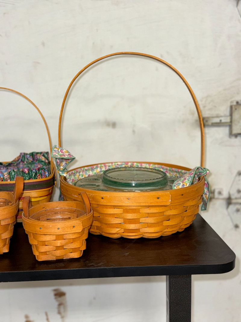 Beautiful Longaberger basket collection set featuring multiple coordinating baskets, including a standout handled serving basket with fitted glass insert. This set combines classic American craftsmanship with functional design, perfect for entertaining or display. The larger basket includes a sturdy swing handle and a decorative pressed glass dish insert, ideal for serving, potlucks, or centerpiece use. Additional smaller baskets and fabric liners add versatility for storage, organization, or seasonal décor. A warm, timeless set that fits perfectly into farmhouse, traditional, or cottage-style interiors. Features: Condition: Approx Measurements: Historical Note & Estimated Value: Estimated value: $75–$150 for the set