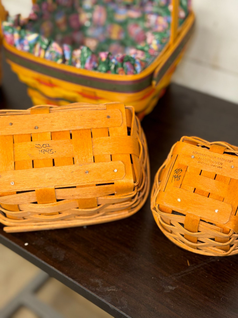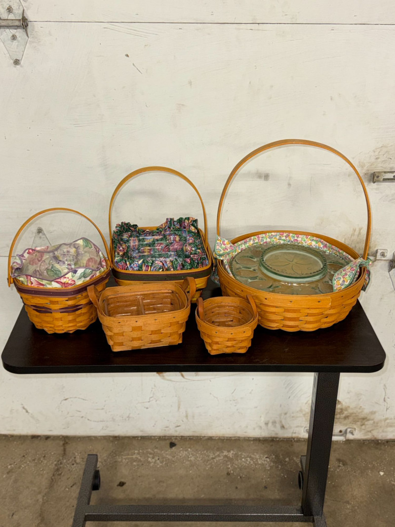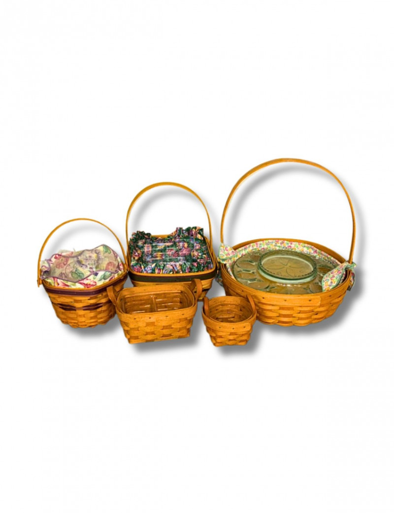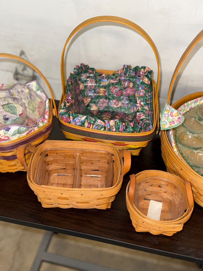 Longaberger baskets are highly collectible American-made pieces known for their craftsmanship and utility. Sets with original liners and specialty inserts like glass dishes are especially desirable among collectors and decorators.