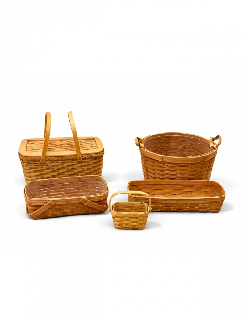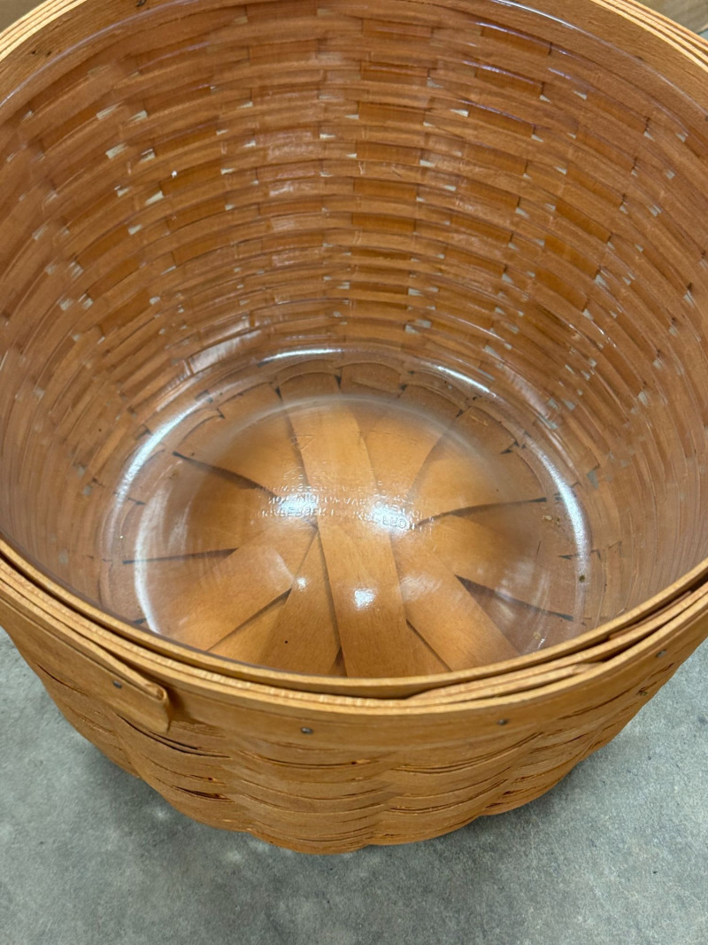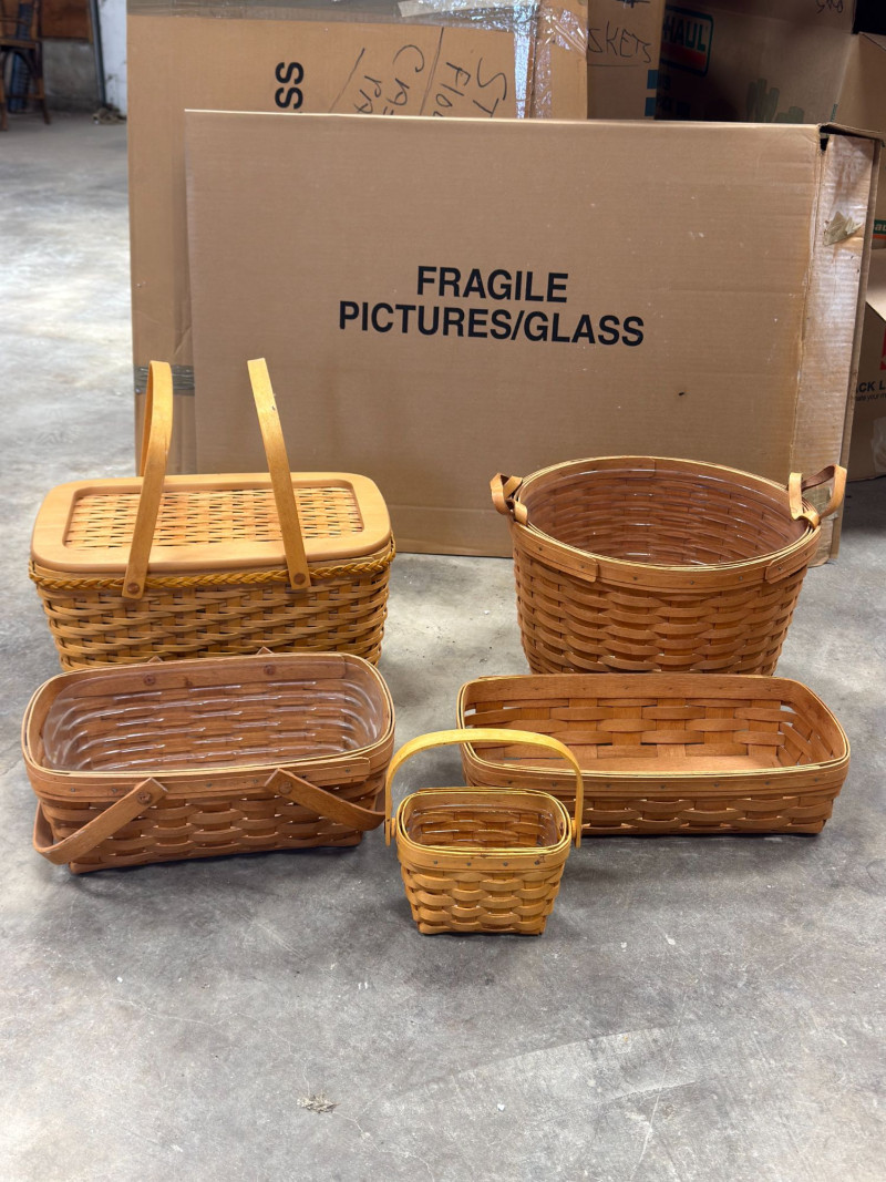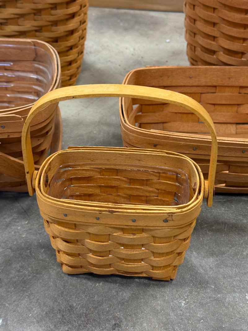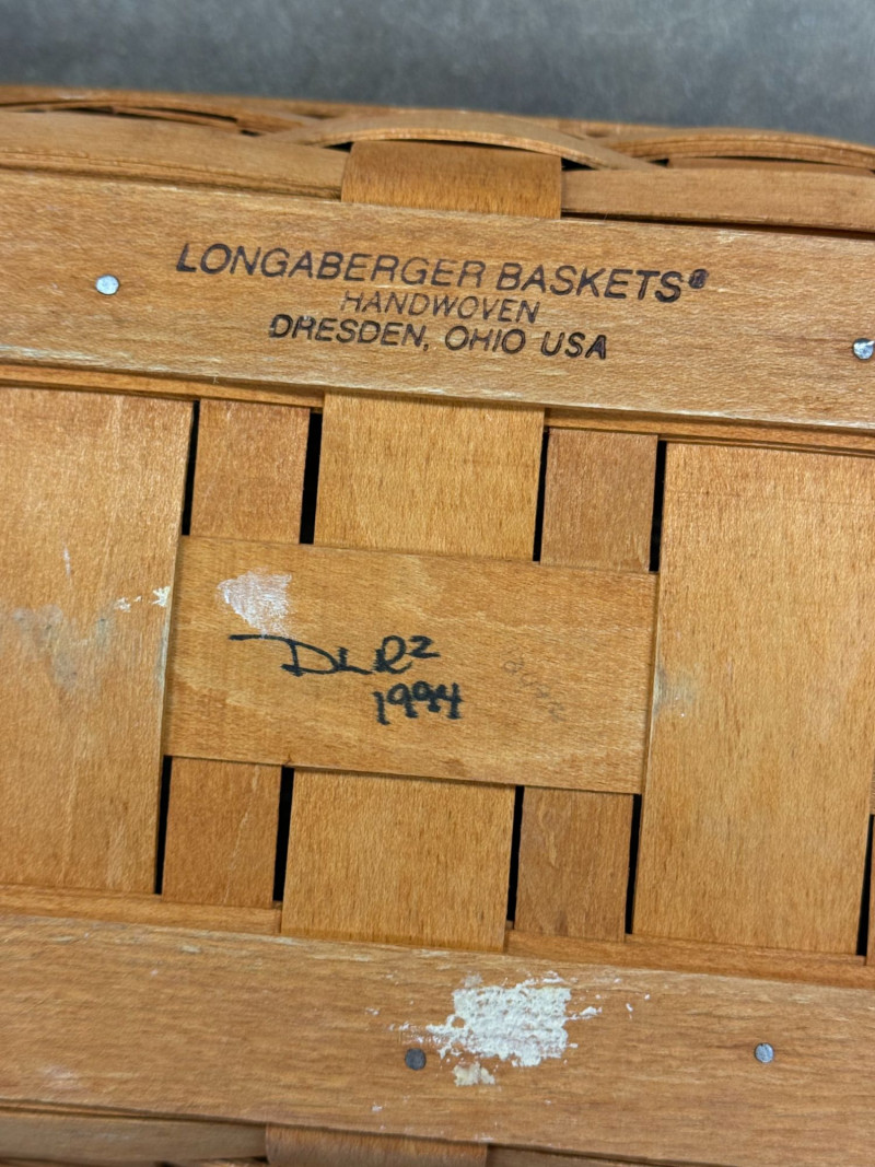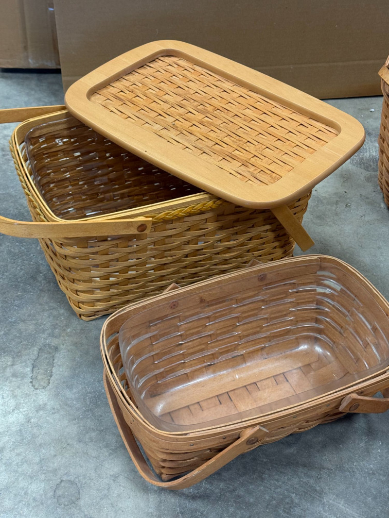 Longaberger baskets are iconic American-made collectibles known for quality craftsmanship and durability. Dated pieces from the 1990s are especially popular among collectors, particularly when sold as coordinated sets with accessories like lids and inserts.