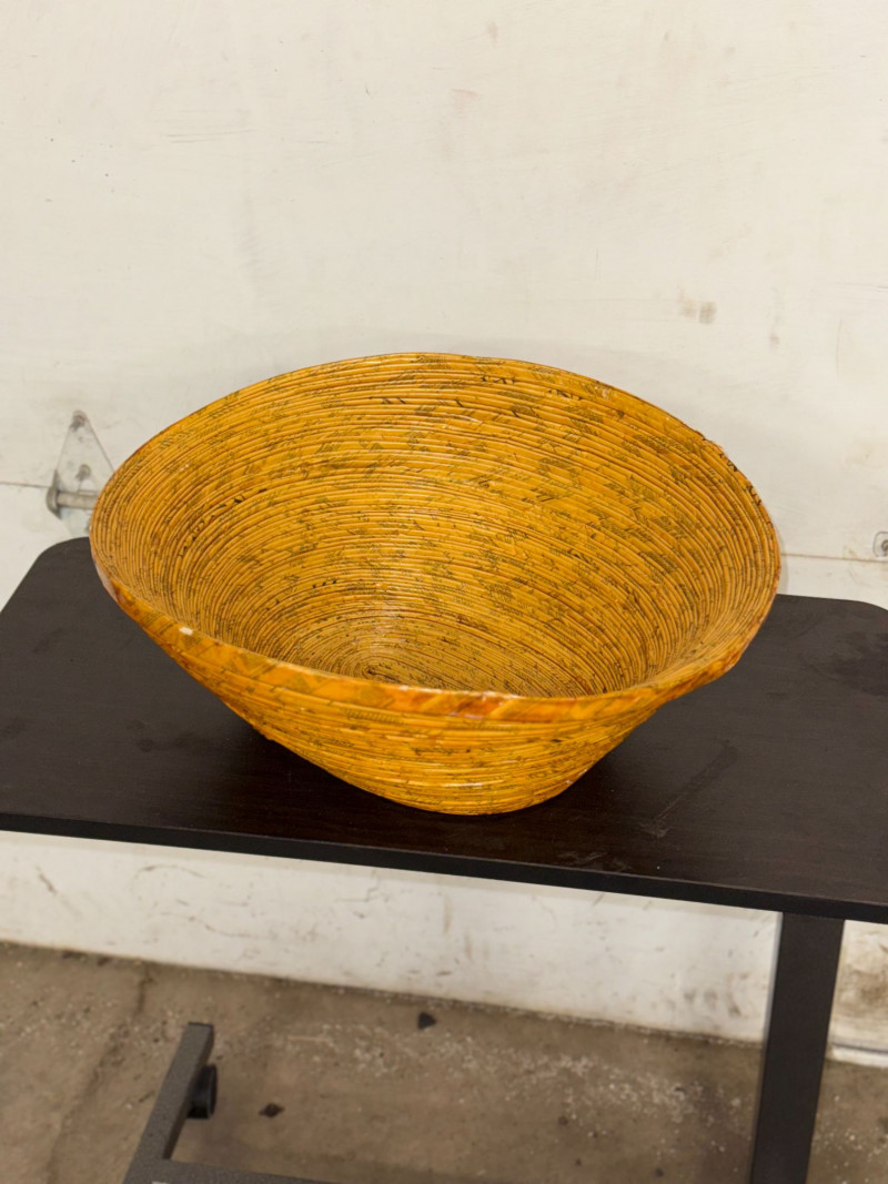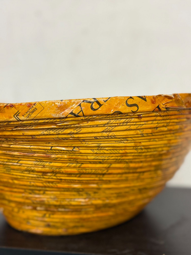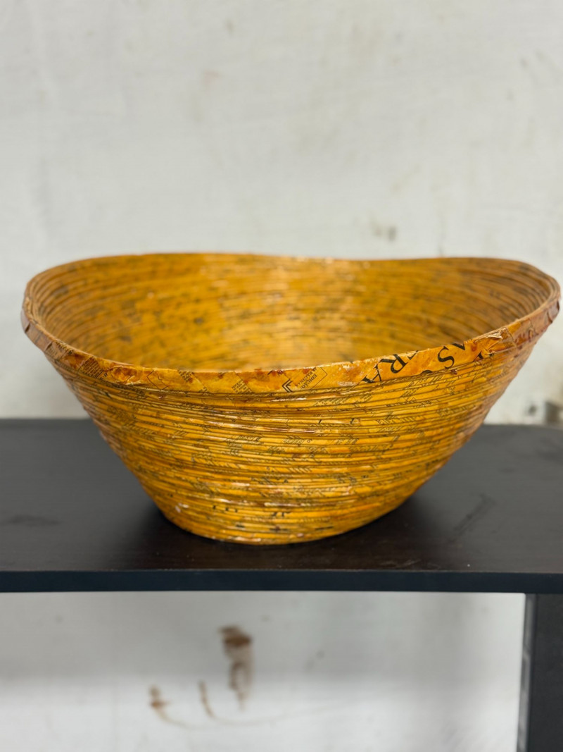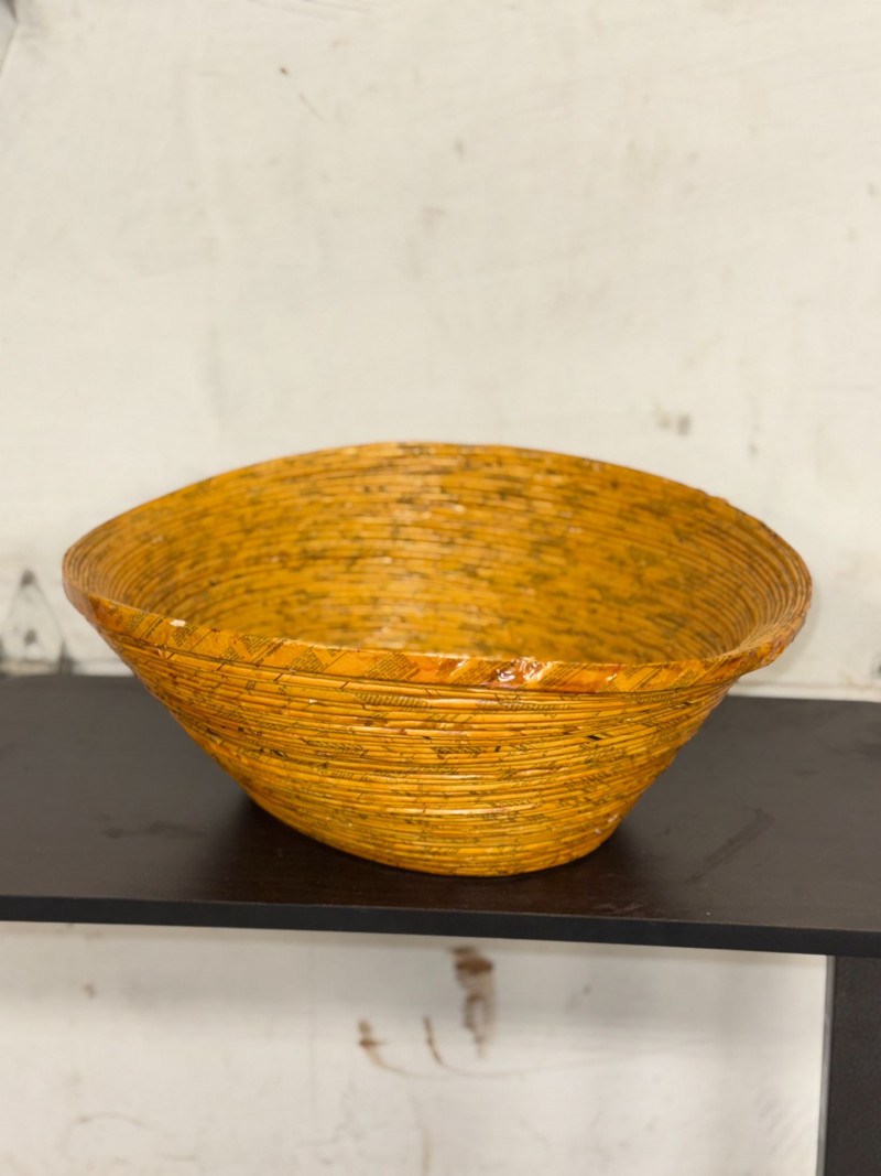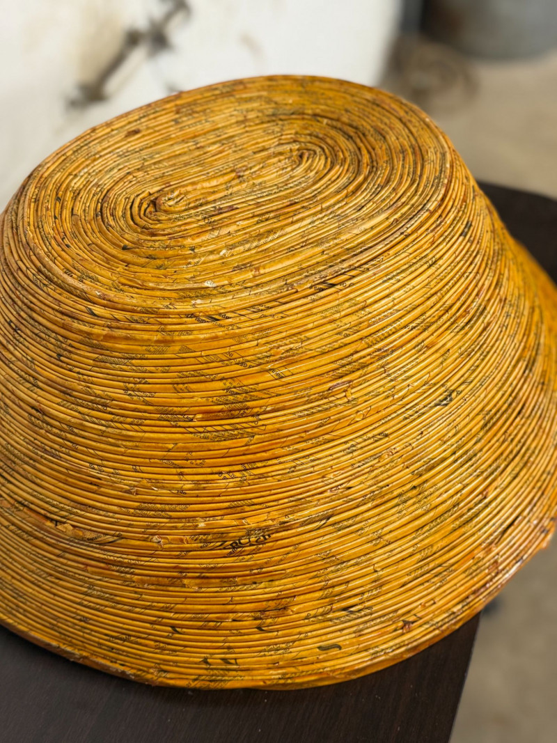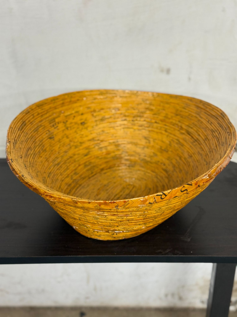 Unique vintage coiled paper basket bowl crafted from tightly wound strips of printed paper, giving it a distinctive newspaper-like appearance. The layered coil construction creates a sturdy yet lightweight form, with warm amber tones and visible text fragments adding character and texture. This piece has a strong folk art feel, blending function and handmade artistry. Perfect as a decorative bowl, centerpiece, or conversation piece in eclectic, rustic, or bohemian interiors. Features: Condition: Approx Measurements: Historical Note & Estimated Value: