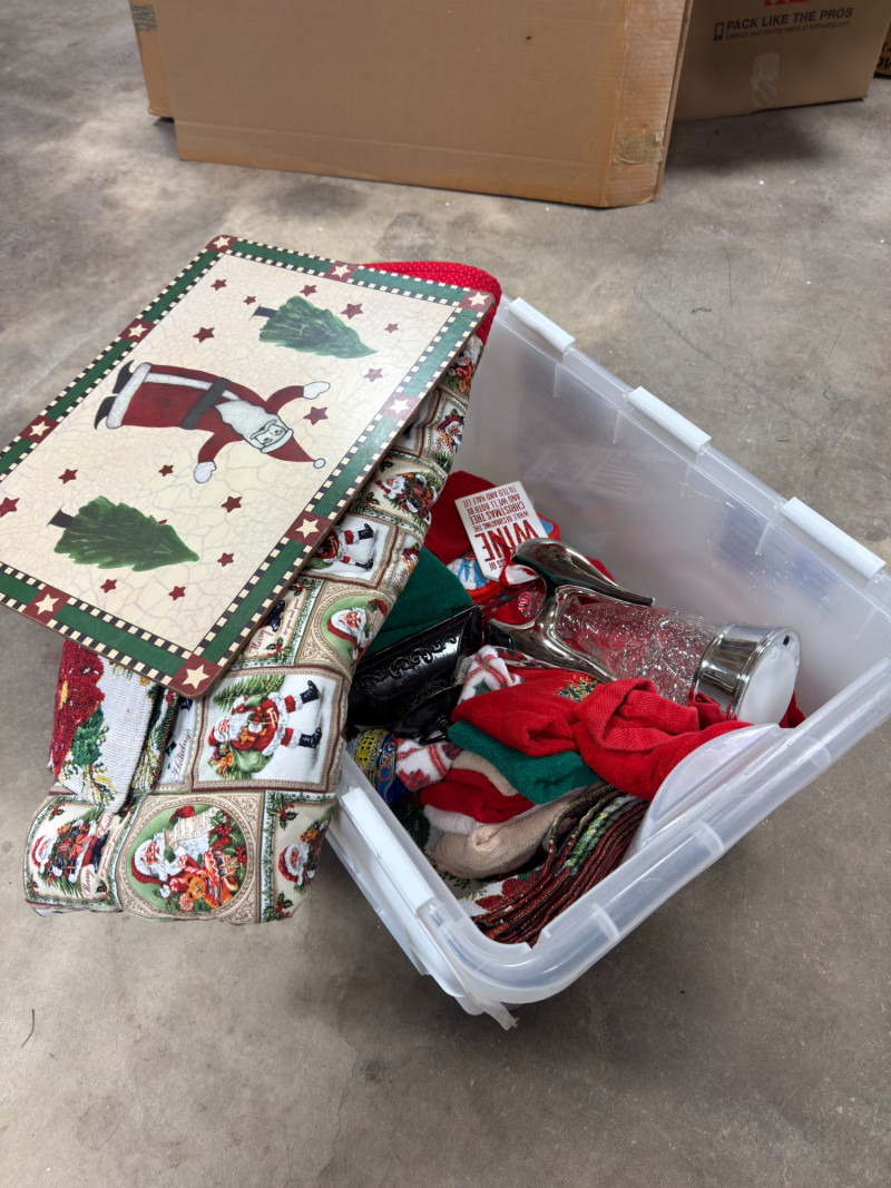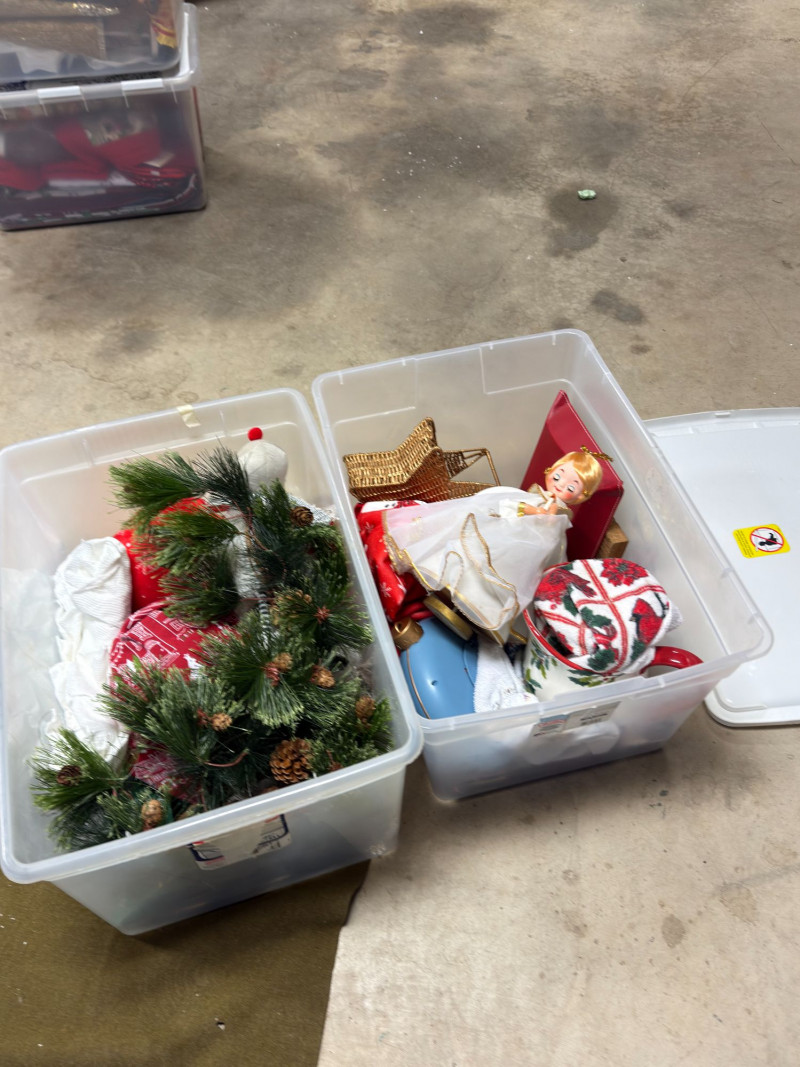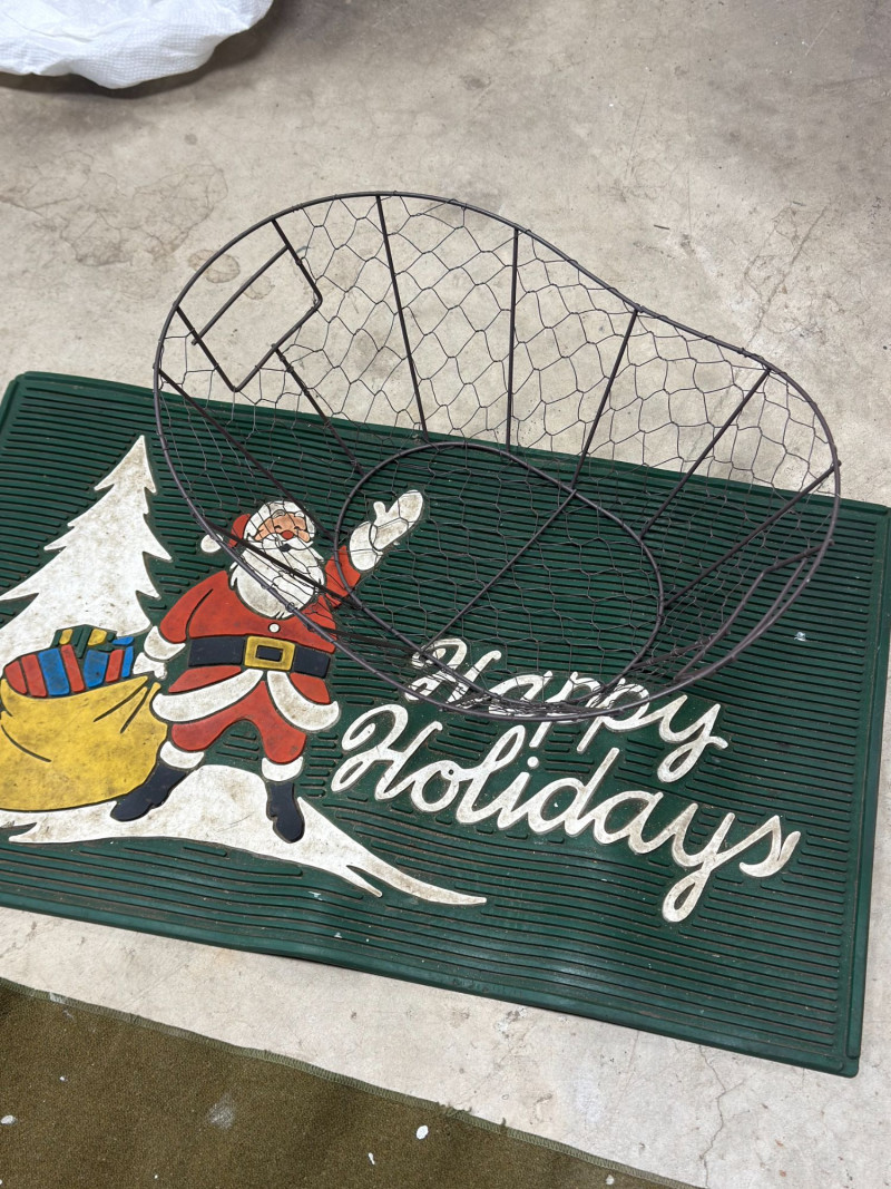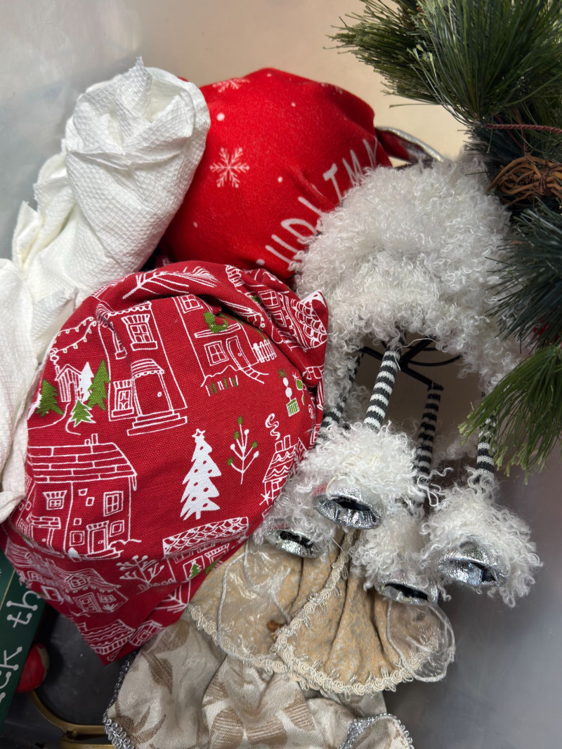 Festive vintage Christmas décor mystery lot featuring a cozy mix of holiday textiles, décor pieces, and seasonal accents. This assortment includes holiday linens, decorative pillows, a Christmas-themed mug, and classic décor items like a “Happy Holidays” mat and wire display basket. Perfect for adding warmth and charm to holiday decorating, this lot leans into nostalgic, homey Christmas styling with a mix of functional and decorative pieces. Great for resale, seasonal staging, or creating a layered holiday look. Features: Condition: Approx Measurements: Historical Note & Estimated Value: Estimated value: $40–$120 for the lot