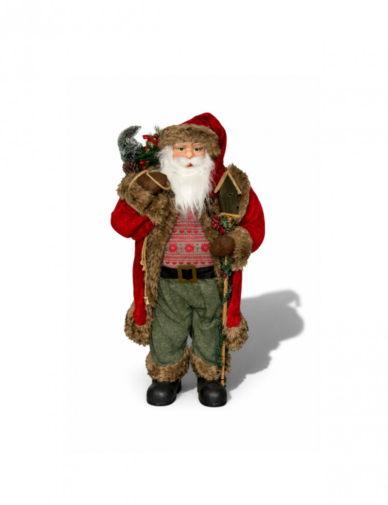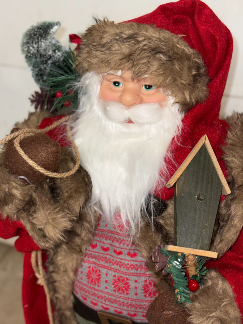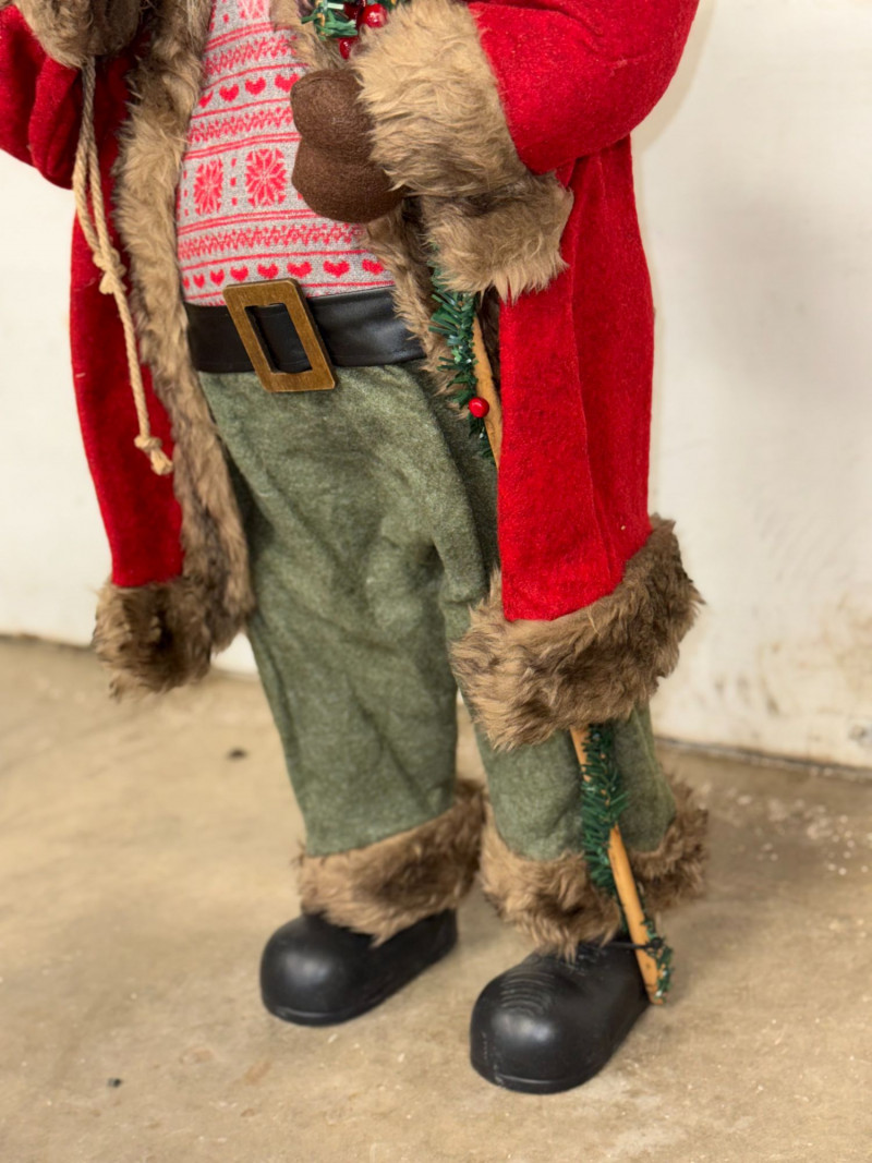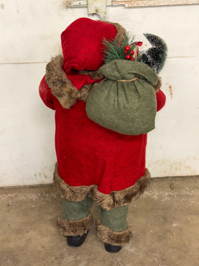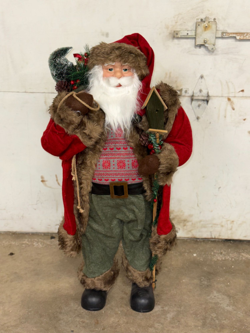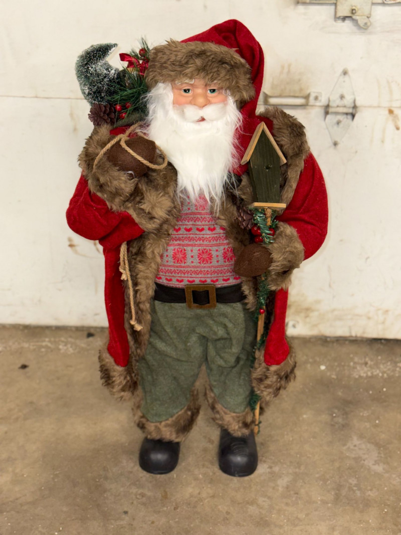 Charming vintage woodland-style Santa Claus figure featuring rich textures and rustic holiday details. This freestanding Santa is dressed in a red coat with faux fur trim, green trousers, and a patterned sweater, carrying a sack over his shoulder and holding a small decorative birdhouse. With its cozy cabin aesthetic and natural tones, this piece fits beautifully into rustic, lodge, or farmhouse-style Christmas décor. A great standalone display or addition to a curated holiday scene. Features: Condition: Approx Measurements: Historical Note & Estimated Value: Estimated value: $40–$100