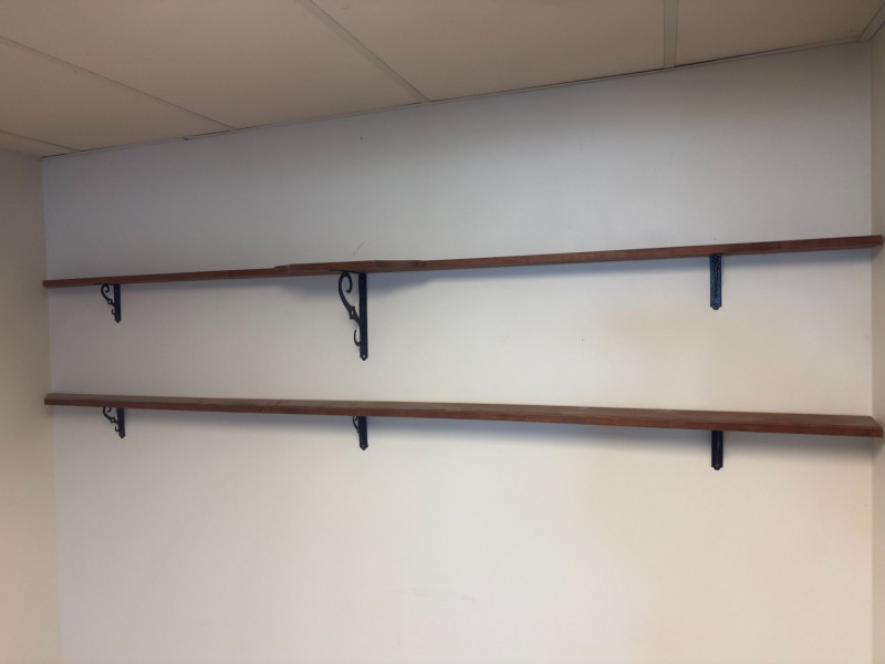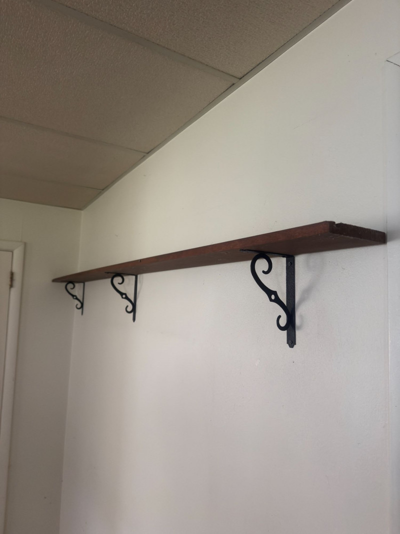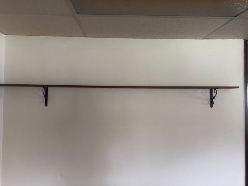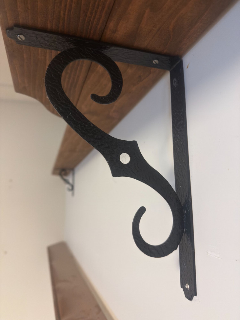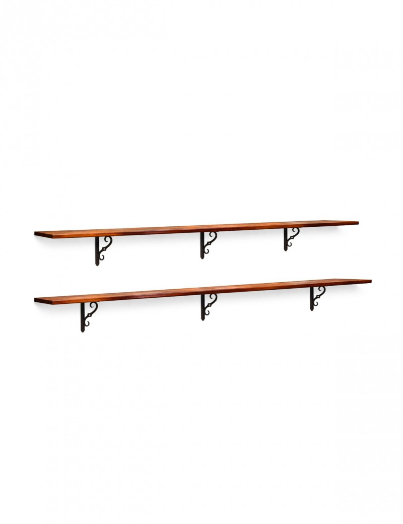 Set of four rustic wall-mounted wood shelves featuring rich dark-stained wood and decorative black metal brackets with a scroll design. These shelves have a clean, functional look with a touch of farmhouse/industrial style—perfect for display, storage, or retail use. Great for books, décor, plants, or organizing a space while adding warmth and character. Ideal for home, office, or shop display setups. Features: Approx Measurements: Condition: Notes: