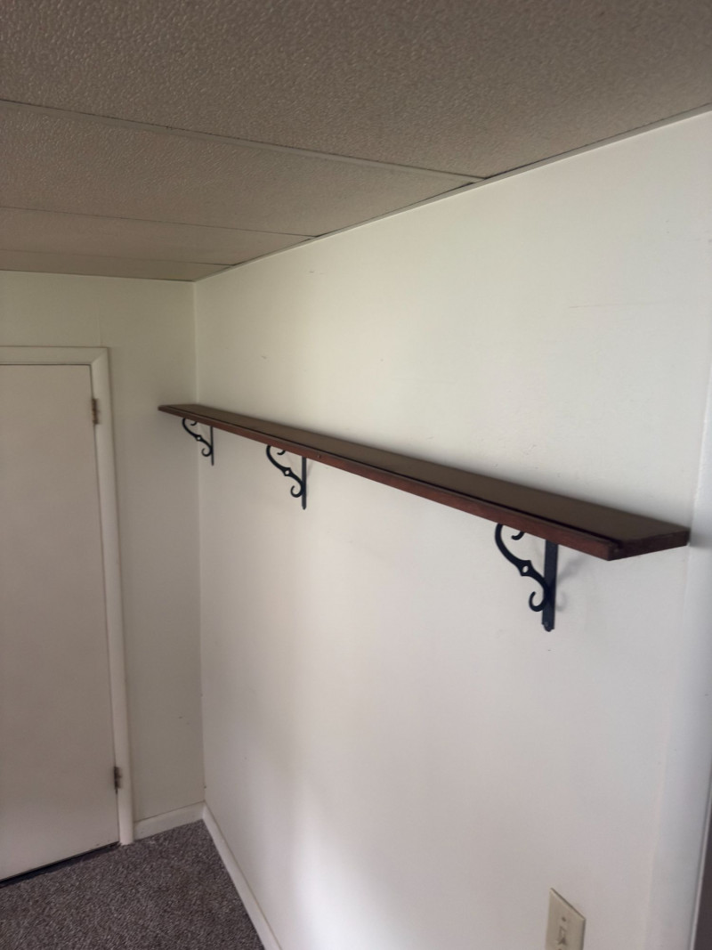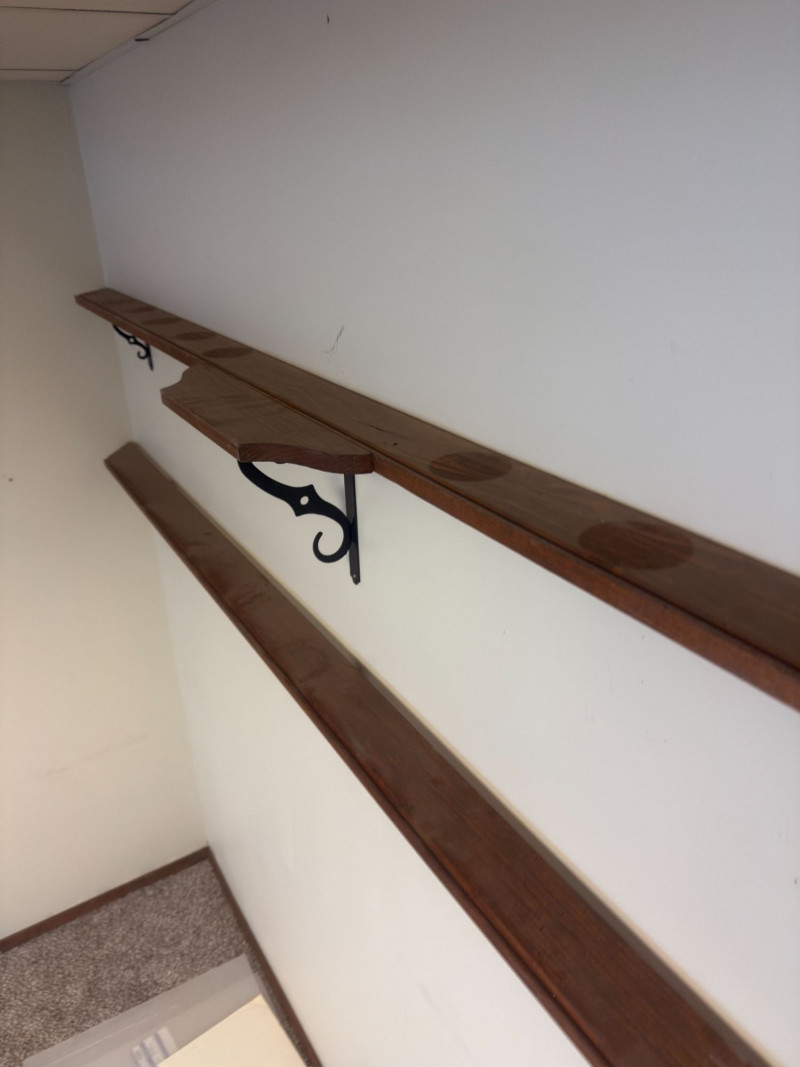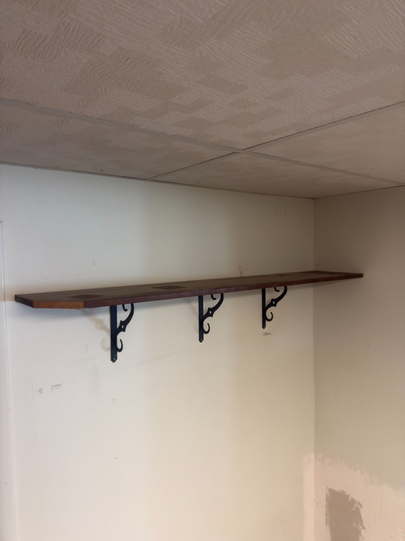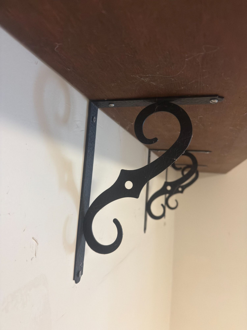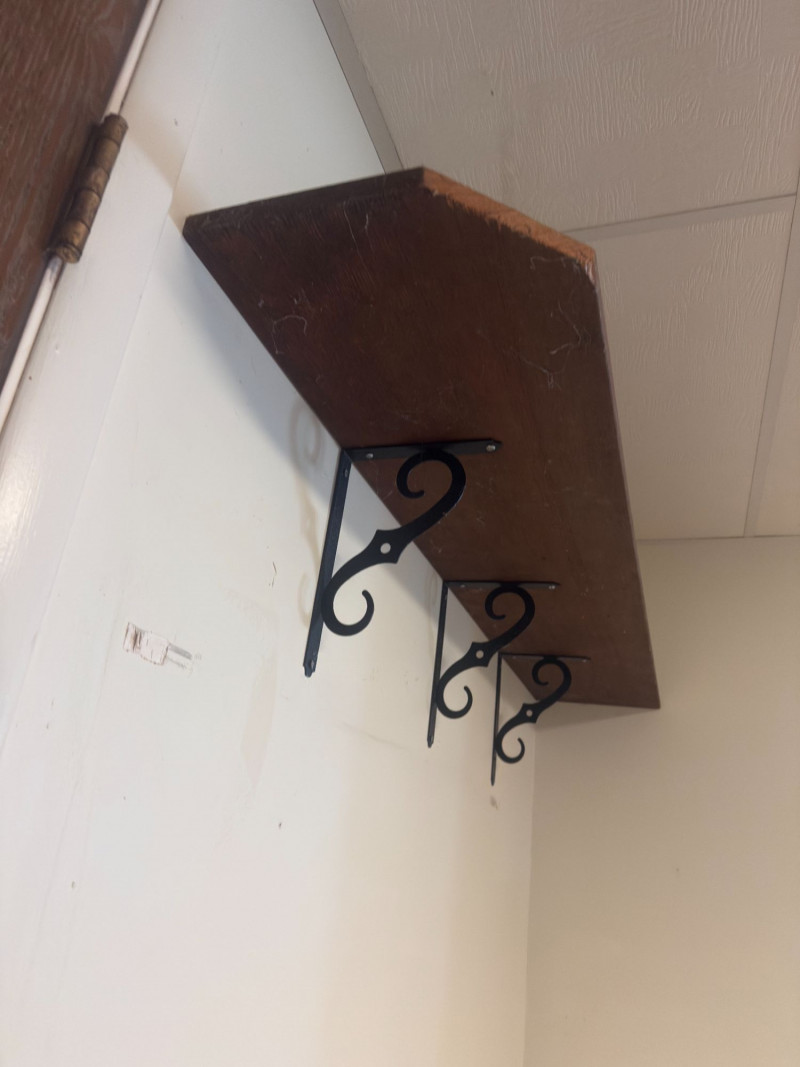 Set of four rustic wall-mounted wood shelves featuring rich dark-stained wood and decorative black metal brackets with a scroll design. These shelves have a clean, functional look with a touch of farmhouse/industrial style—perfect for display, storage, or retail use. Great for books, décor, plants, or organizing a space while adding warmth and character. Ideal for home, office, or shop display setups. Features: Approx Measurements: Condition: Notes: