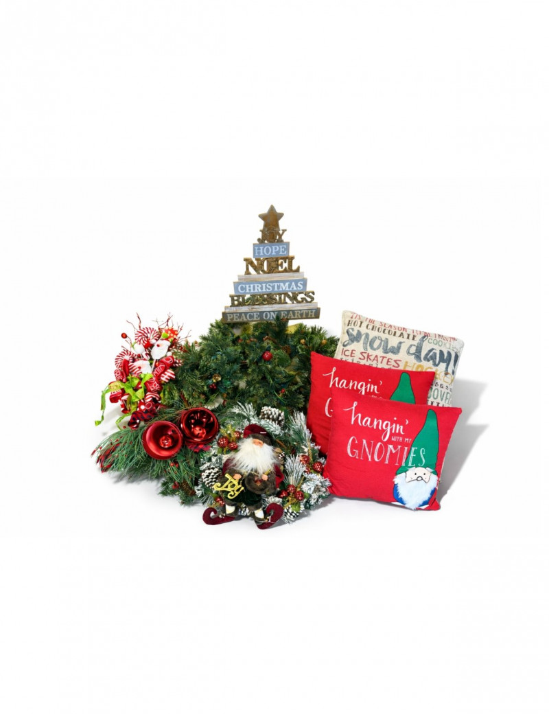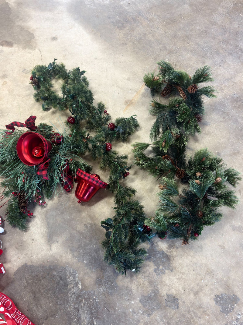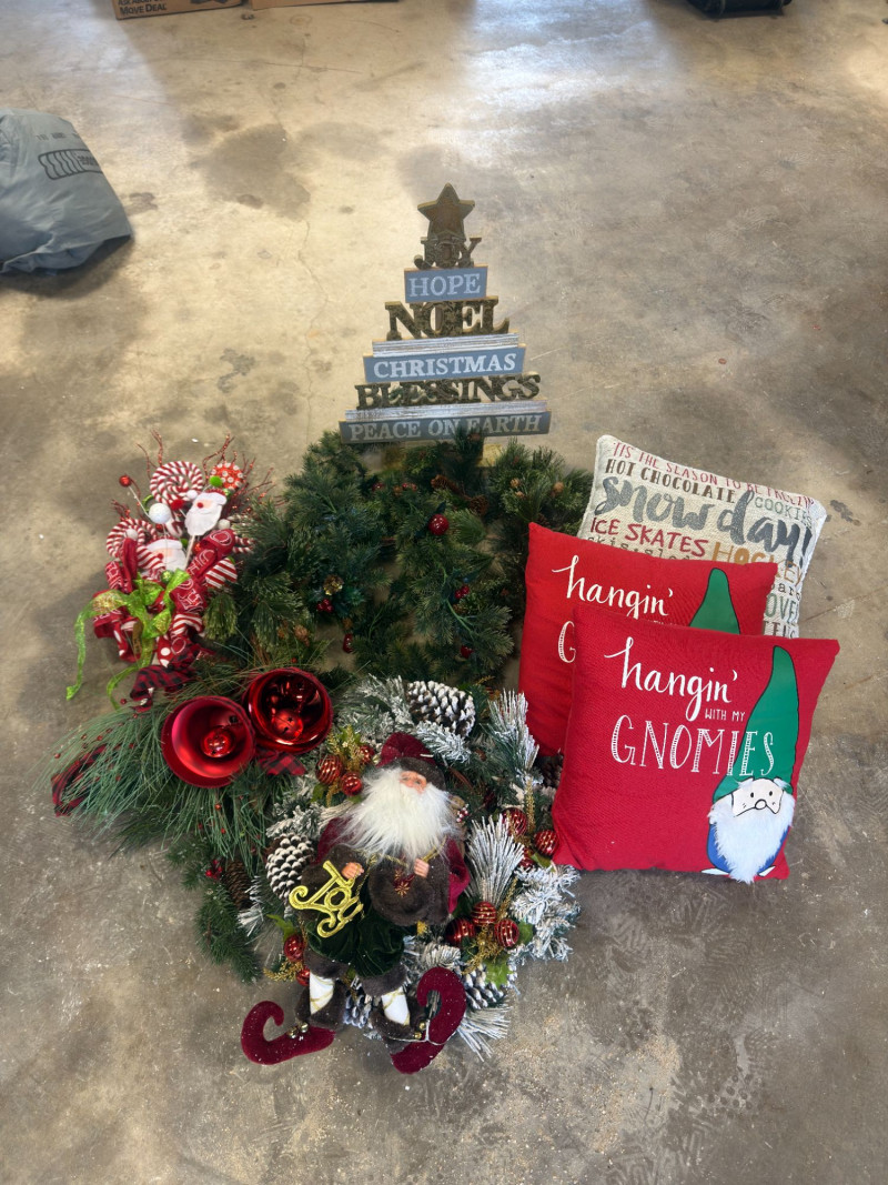 Mixed Christmas décor lot featuring a variety of festive pieces perfect for holiday decorating or resale. Includes wreaths, garland, decorative picks, and a seasonal pillow—great for adding a cozy holiday touch to any space. Style: