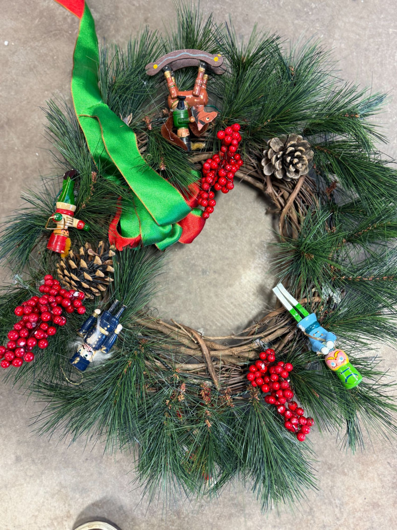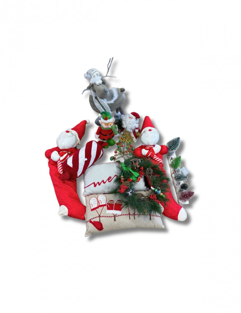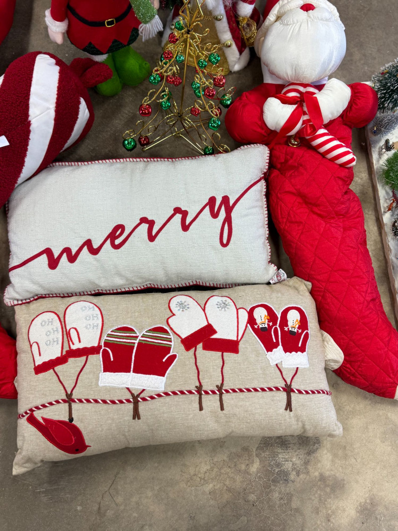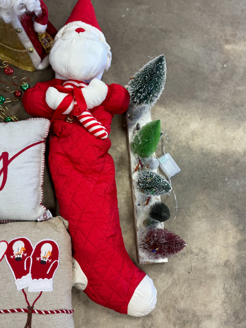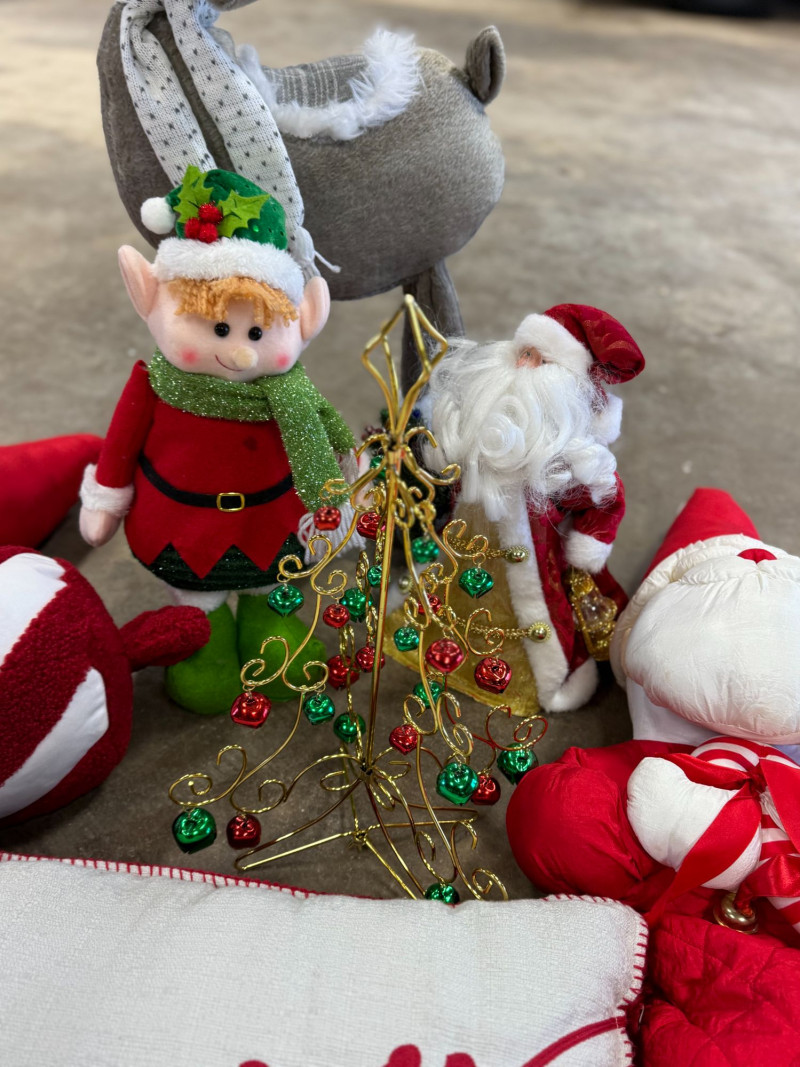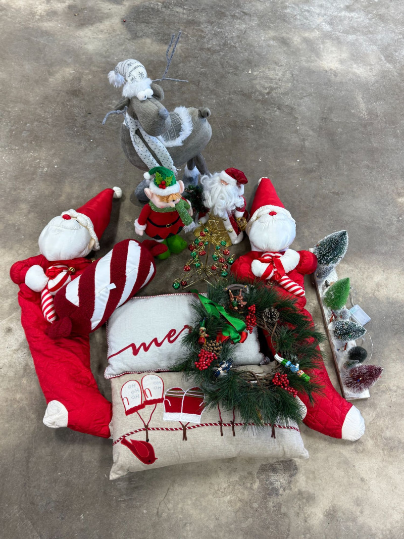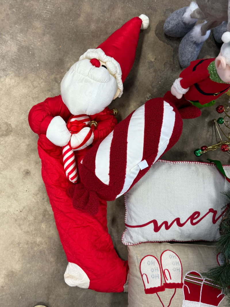 Festive mixed vintage Christmas décor lot featuring a coordinated collection of holiday pieces in classic red, green, and neutral tones. This set includes plush Santa figures, a standing reindeer, decorative pillows, wreaths, and assorted holiday accents. Notable items include multiple Santa plush figures, a soft reindeer figure, embroidered/printed holiday pillows (“merry” and mitten design), a decorated wreath with berries and greenery, and small decorative accents like mini trees and tabletop pieces. A great ready-to-style bundle for cozy holiday decorating, staging, or resale. Condition: Approx Dimensions: Historical Note & Estimated Value: Estimated value: $60–$150+