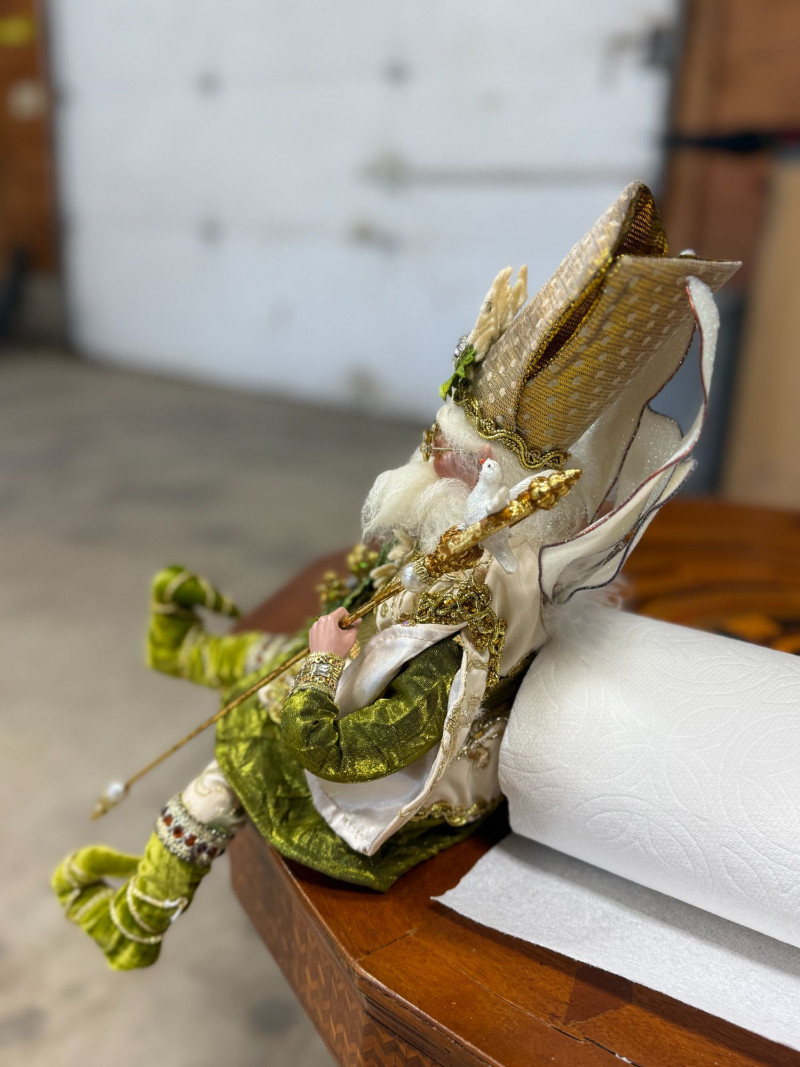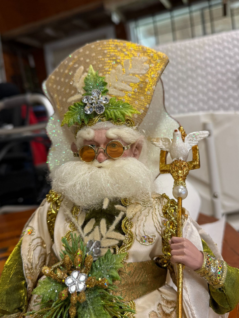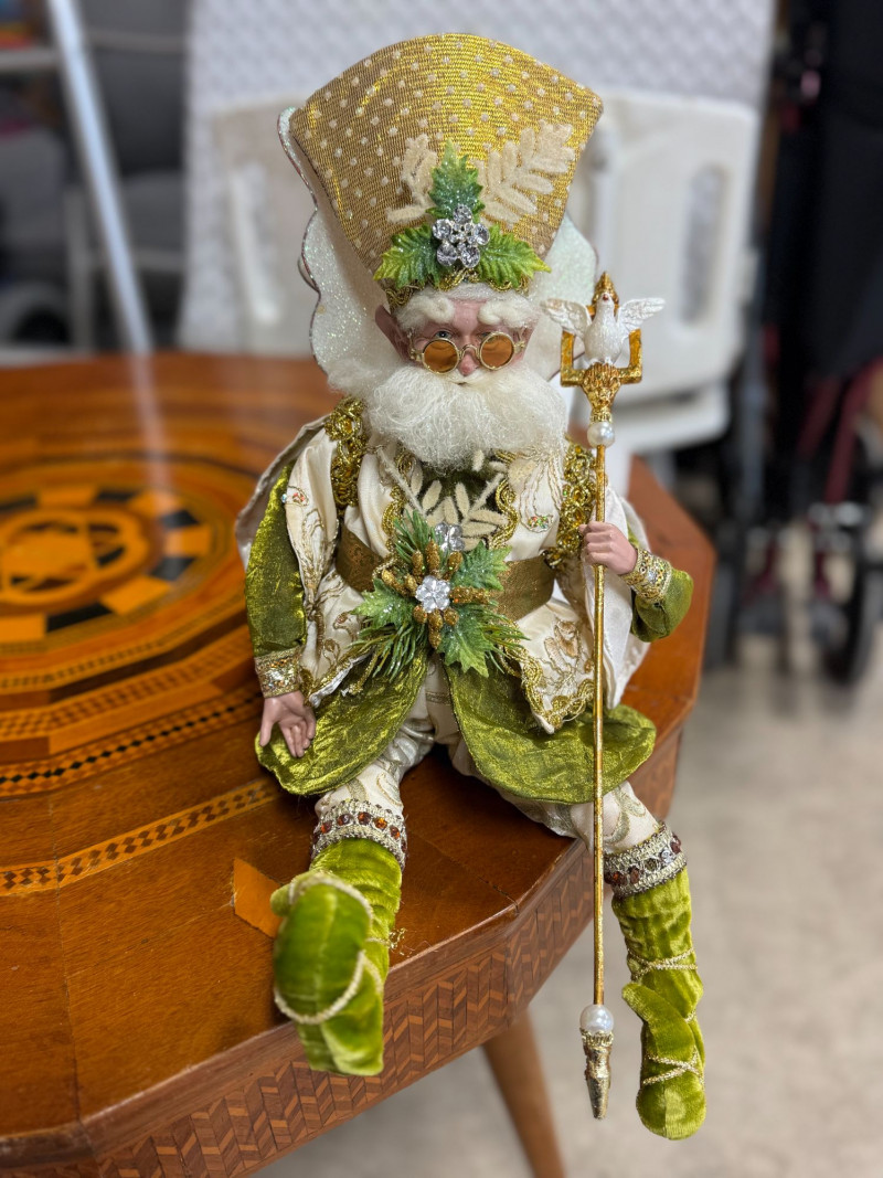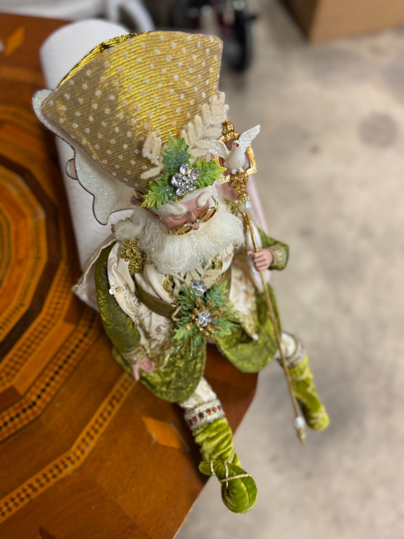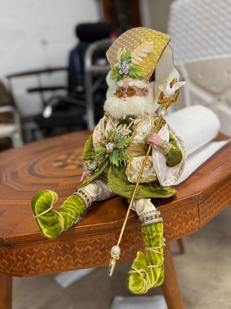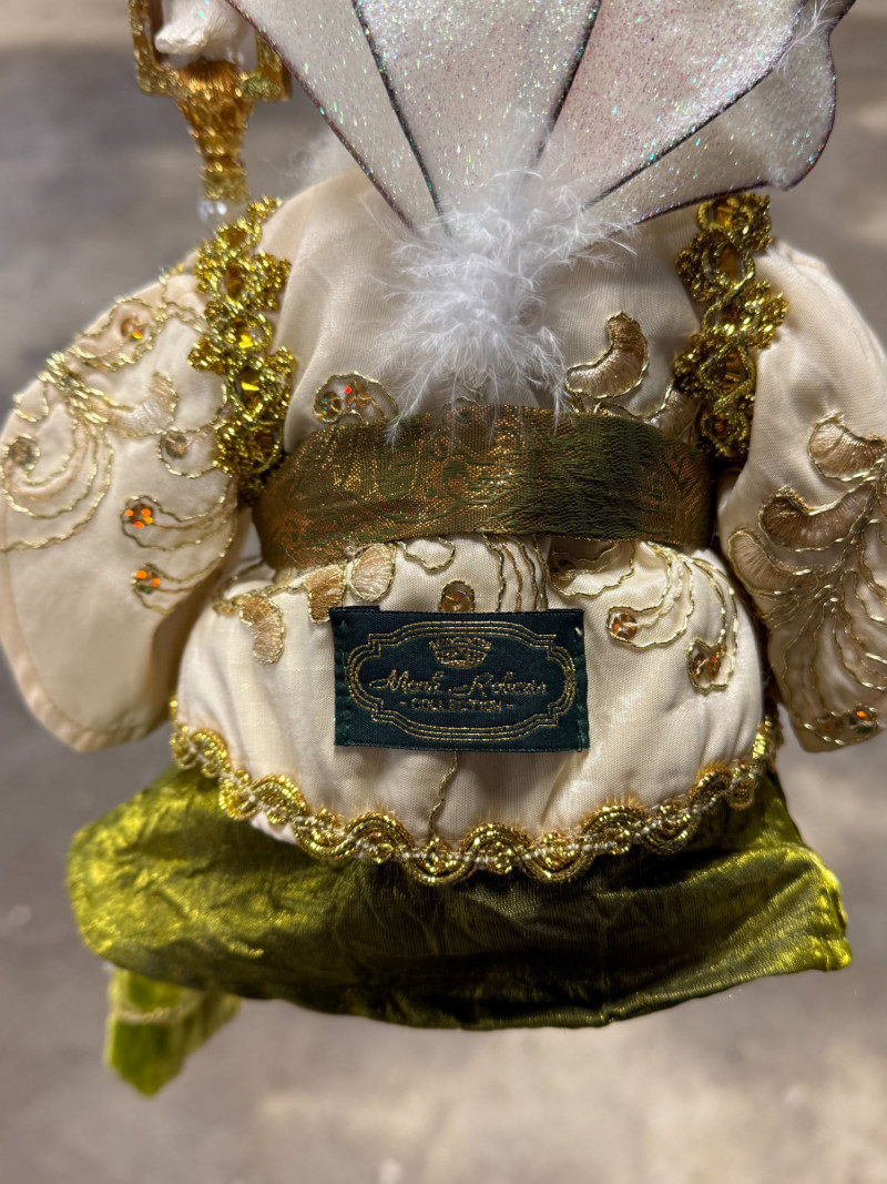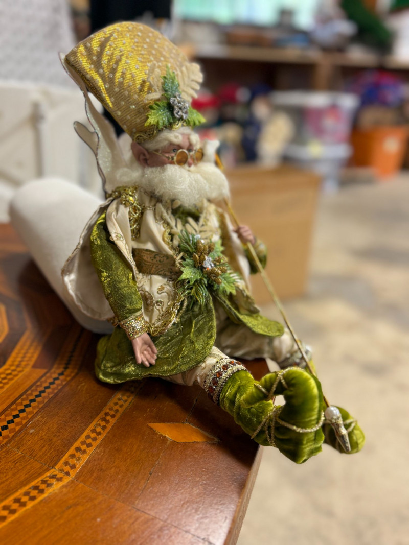 Mark Roberts Fairy Santa Figurine – Limited Edition Christmas Collectible w/ Box Highly collectible Mark Roberts Fairy Santa figurine, known for its intricate craftsmanship and heirloom-quality design. This elegant piece features a whimsical Santa figure dressed in rich green, gold, and ivory tones, adorned with detailed trims, embellishments, and hand-finished accents. The figure includes signature Mark Roberts elements such as wired, posable limbs, layered textiles, and ornate accessories, making it perfect for styling on shelves, mantels, or holiday displays. Comes in original box, adding to its collectibility and value—ideal for collectors or as a standout holiday décor piece. Condition: Approx Dimensions: Historical Note & Estimated Value: Estimated value: $95–$150