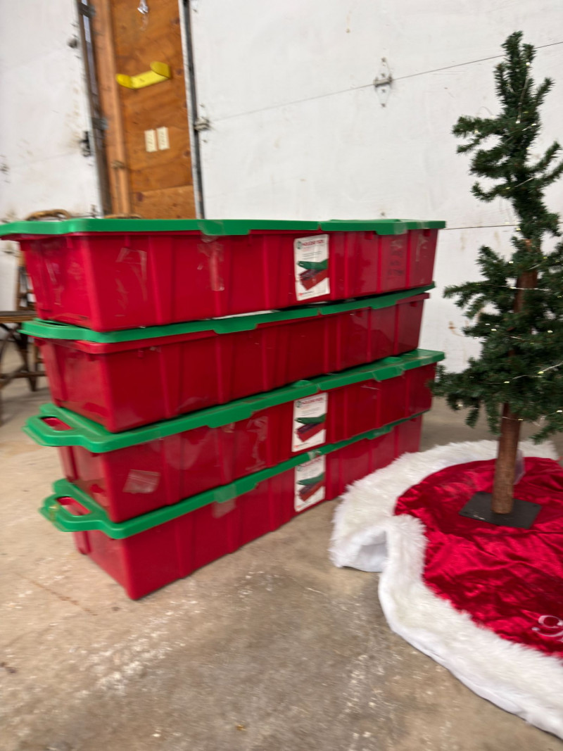 Good pre-owned condition. Items show light wear consistent with seasonal use but remain functional and display nicely. Storage bins are sturdy and clean.