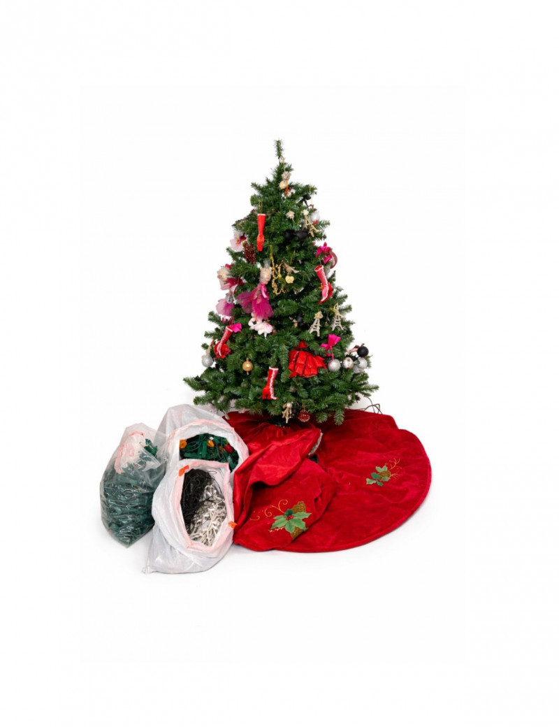 Good pre-owned condition. Tree and lights are untested but appear complete. Ornaments show light wear consistent with age and use. Tree skirt is clean with minor wear.