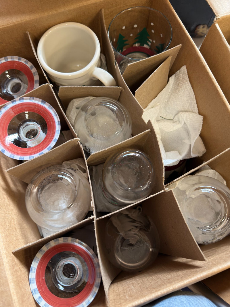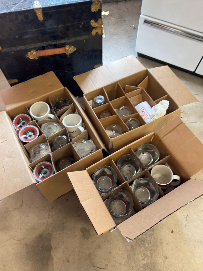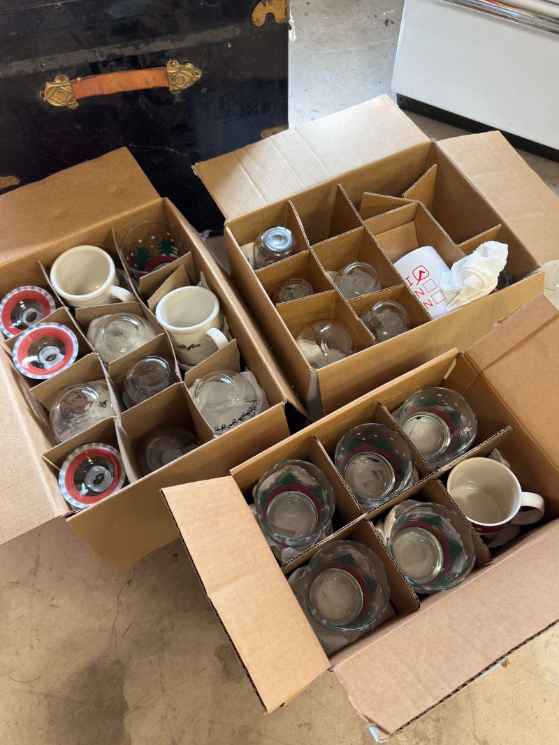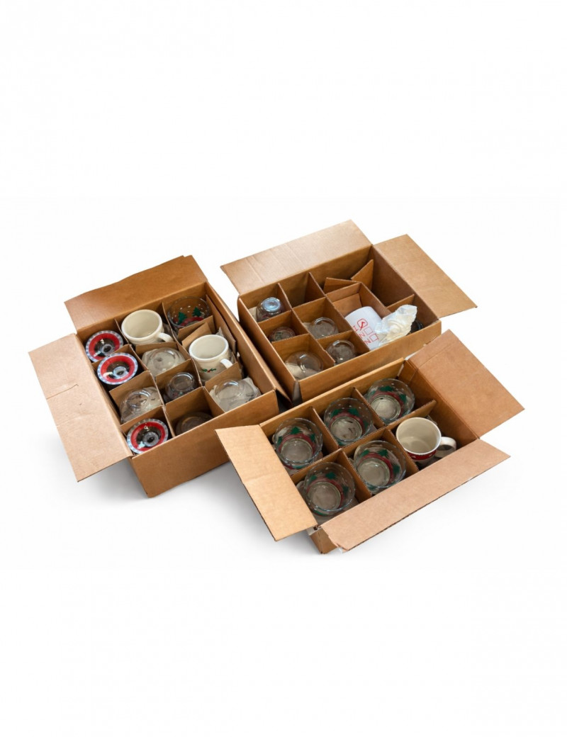 Fun vintage Christmas glassware bundle featuring a mixed assortment of holiday-themed drinking glasses and mugs, many still stored in original partitioned boxes. This lot includes: A great lot for collectors, holiday entertaining, or resale, with a variety of classic seasonal patterns and styles. Condition: Approx Dimensions: Historical Note & Estimated Value: