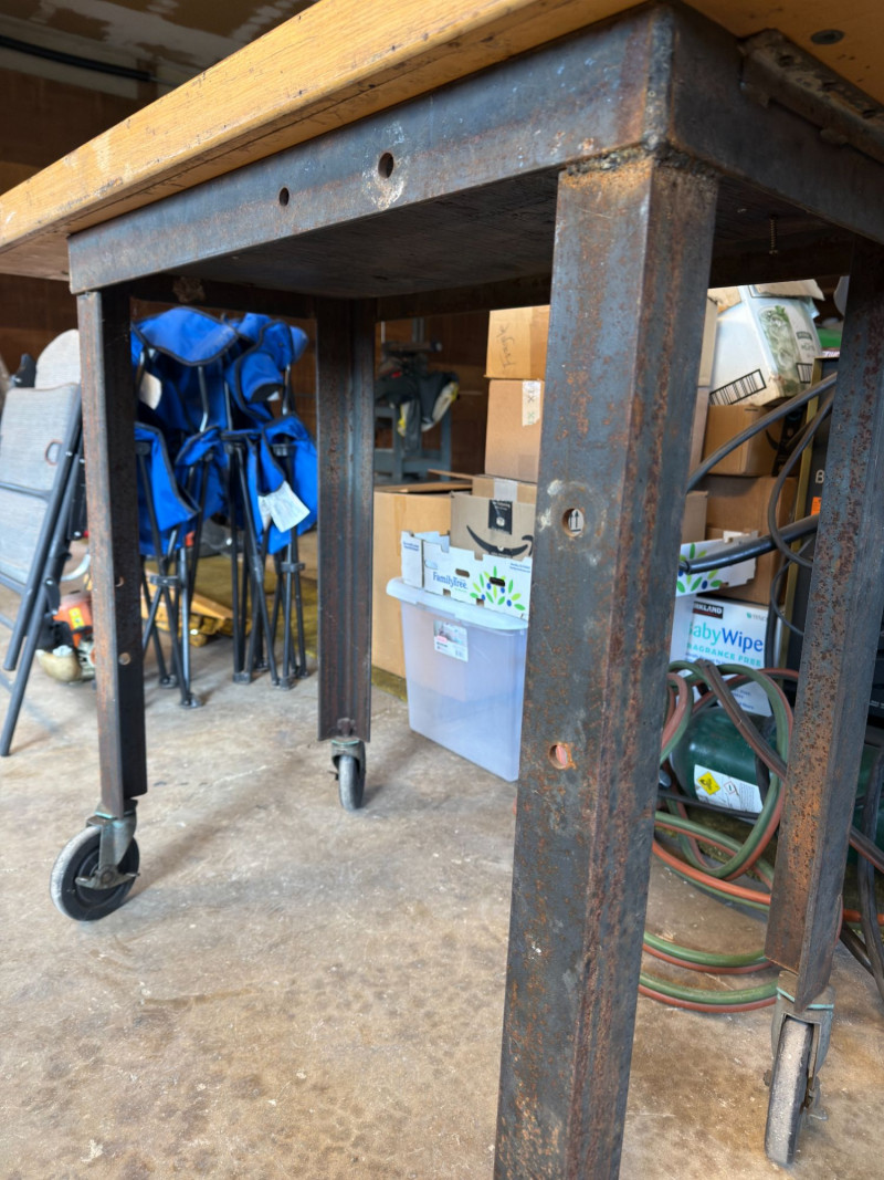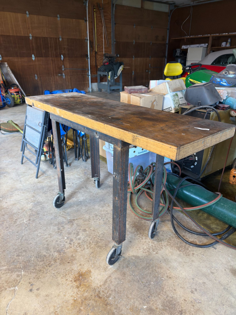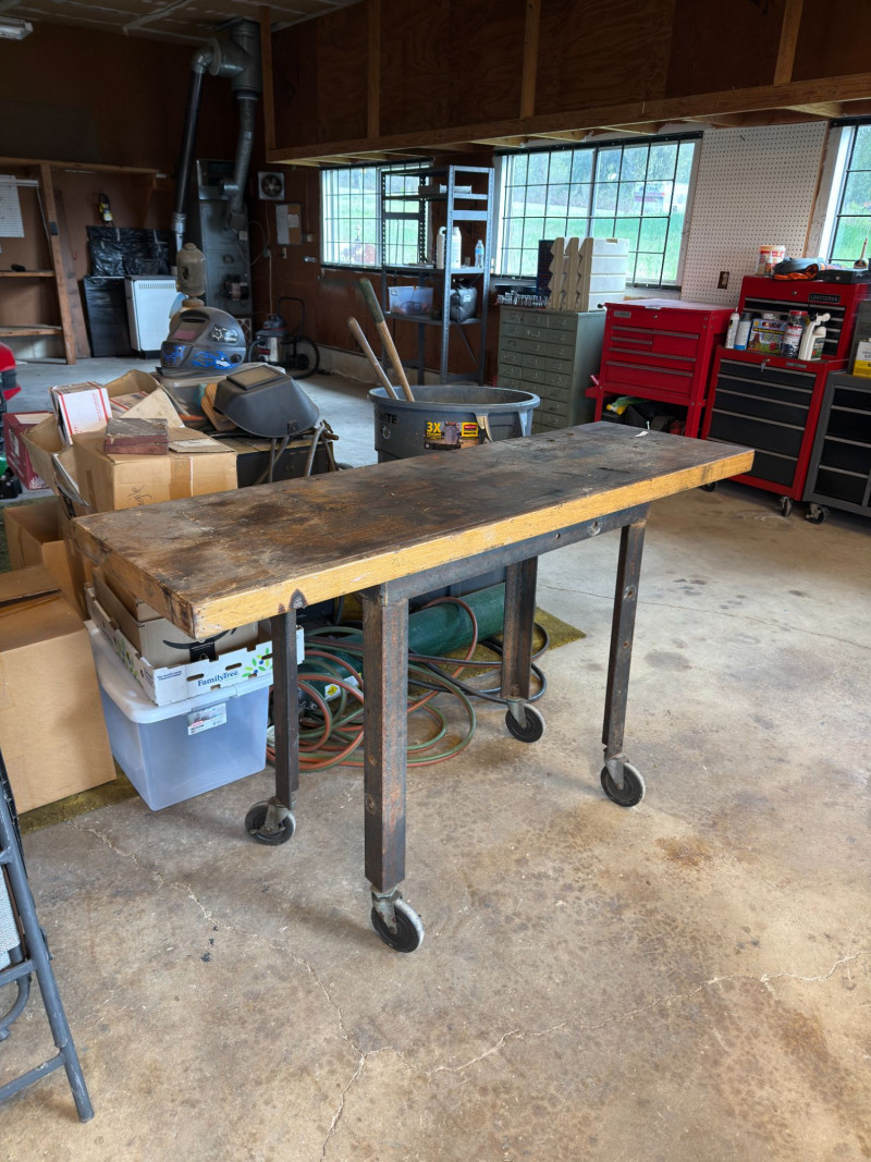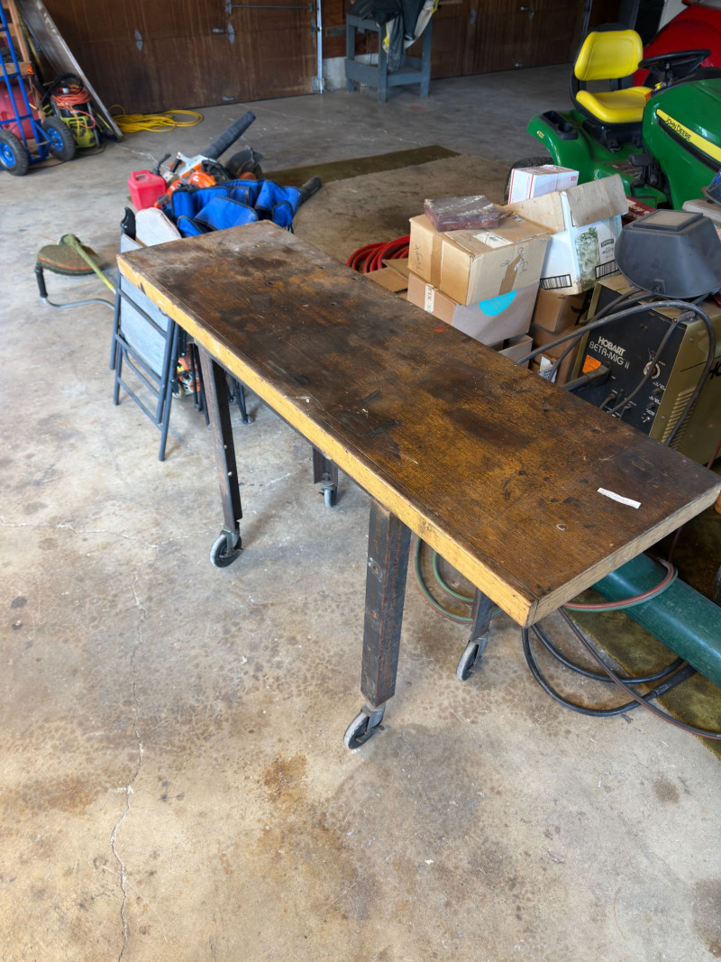 Authentic vintage industrial workbench featuring a solid wood top and heavy-duty metal frame, complete with rolling casters for mobility. This piece has a beautifully worn patina that adds character and history—perfect for both functional and decorative use. Features include: Perfect as a: Condition: Approx Dimensions: Historical Note & Estimated Value: Estimated value: $150–$350