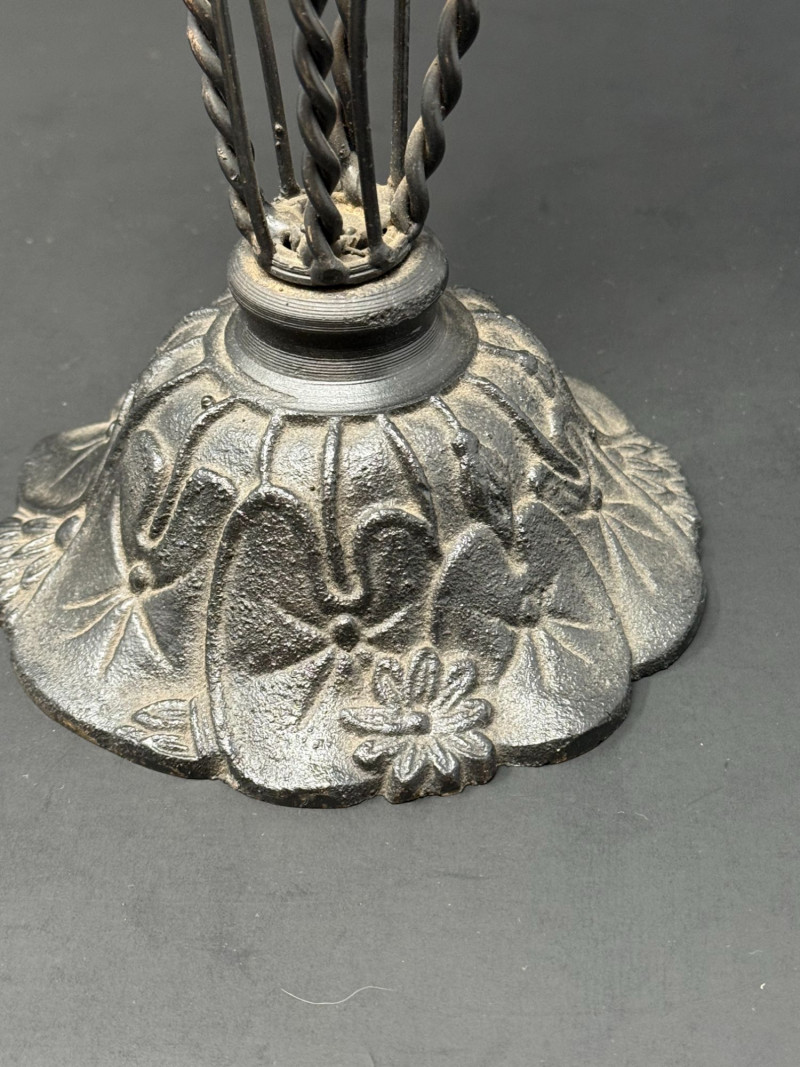 Vintage Caged Glass Flower Vase — Cast Iron Base, Italian / Moroccan Style This striking vintage flower vase features a clear fluted glass vessel encased in an ornate wrought-style metal cage, rising from a heavy cast iron base. The sculptural silhouette and scrolling ironwork create a dramatic vertical form with strong old-world and Mediterranean influence. The glass insert is removable and sits securely within the metal framework, making the piece both functional and highly decorative. The cast iron base provides excellent weight and stability, while the caged design allows light to pass through the glass, enhancing its presence whether displayed empty or filled. Type: Decorative flower vase Approximate Measurements: Measurements are approximate and provided for reference. Condition: Historical Note: Value Context: