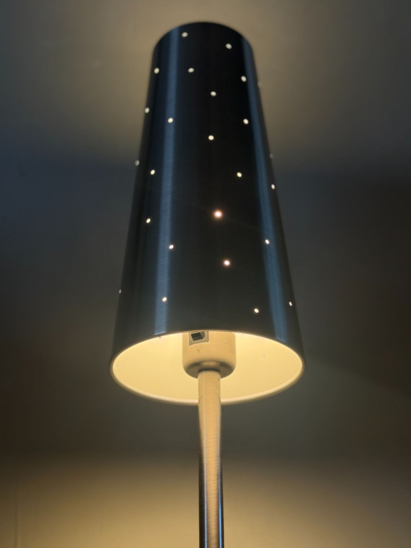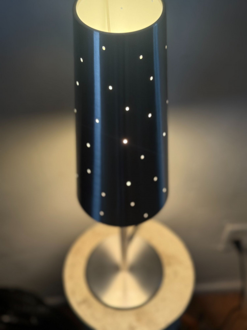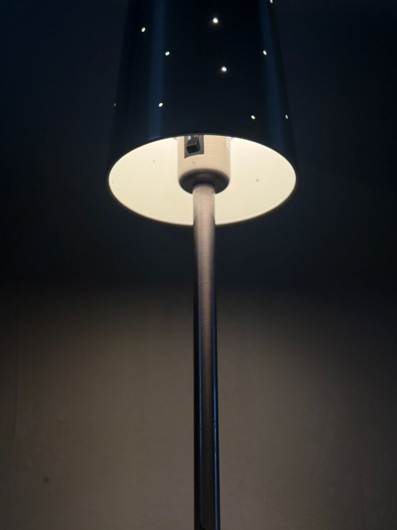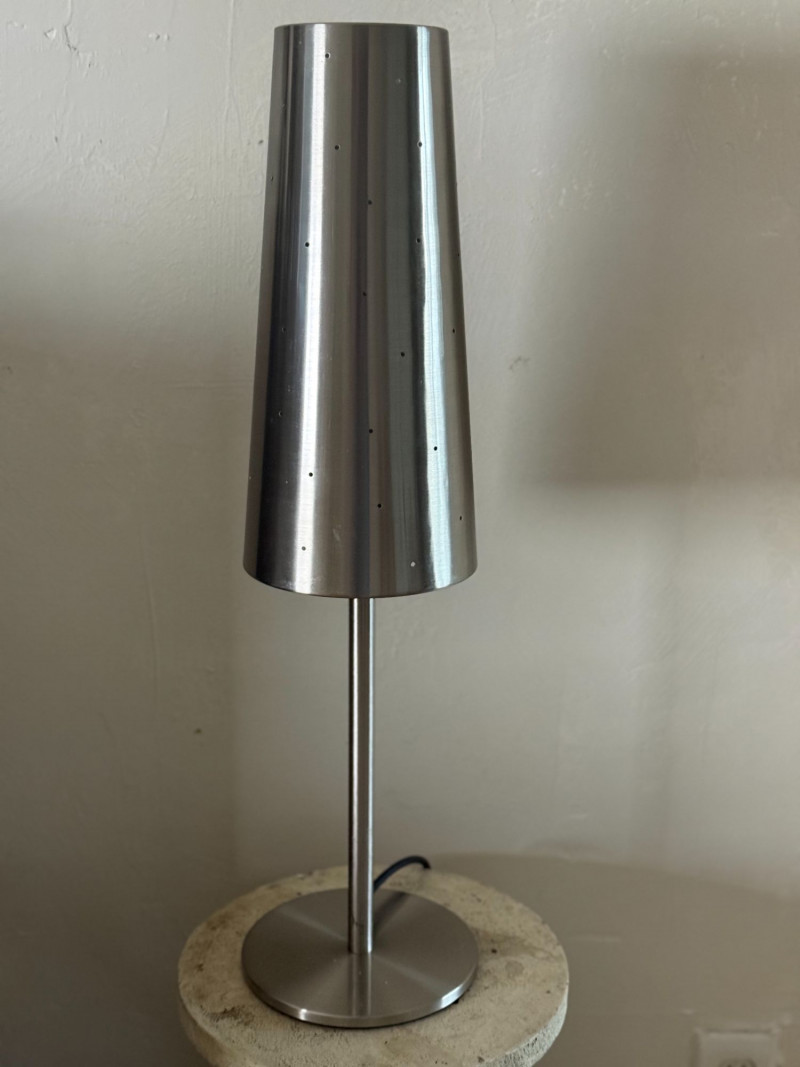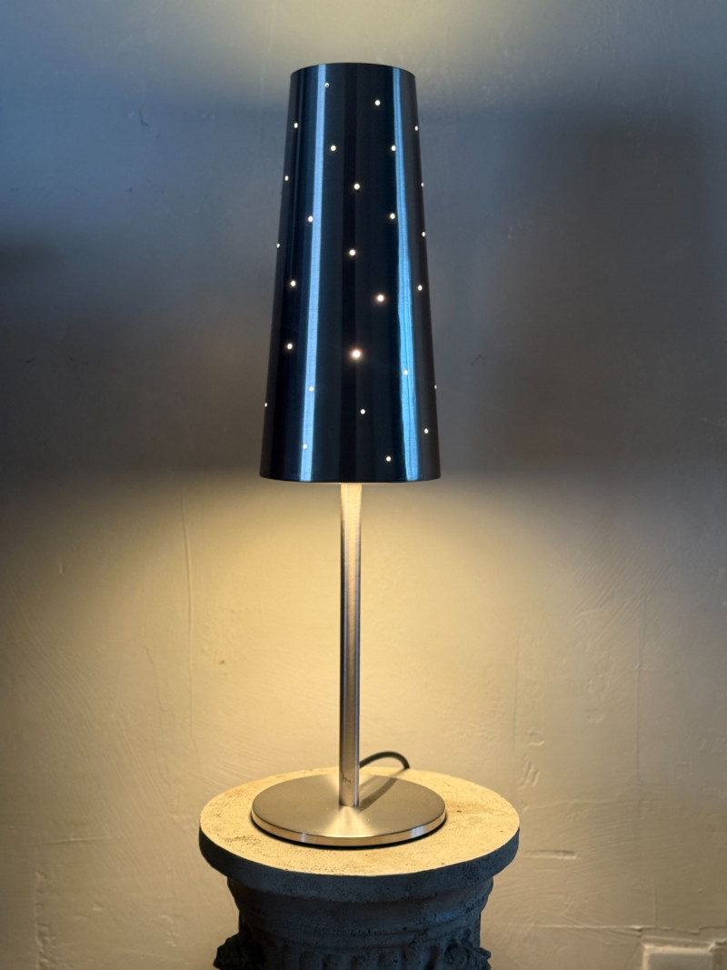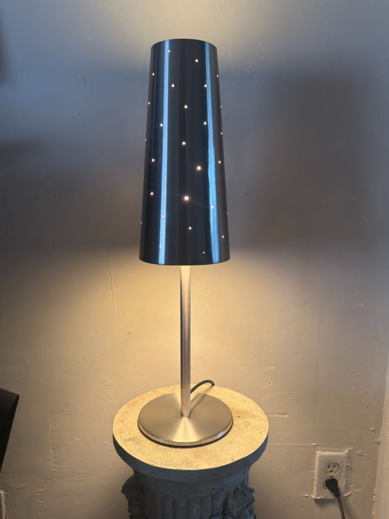 Vintage IKEA Talvik Chrome Table Lamp by Anne Nilsson — Perforated Metal Shade This vintage IKEA Talvik table lamp, designed by Anne Nilsson, features a sleek chrome stem and base paired with a black perforated metal shade. When illuminated, the shade casts a soft, star-like glow through the evenly spaced perforations, creating ambient, atmospheric light. The minimalist silhouette and graphic contrast between chrome and black metal reflect classic late 20th-century Scandinavian design. Well-suited for bedside tables, desks, or accent lighting in modern and vintage-inspired interiors. Type: Table lamp Approximate Measurements: Measurements are approximate and provided for reference. Condition: Historical Note: Value Context: