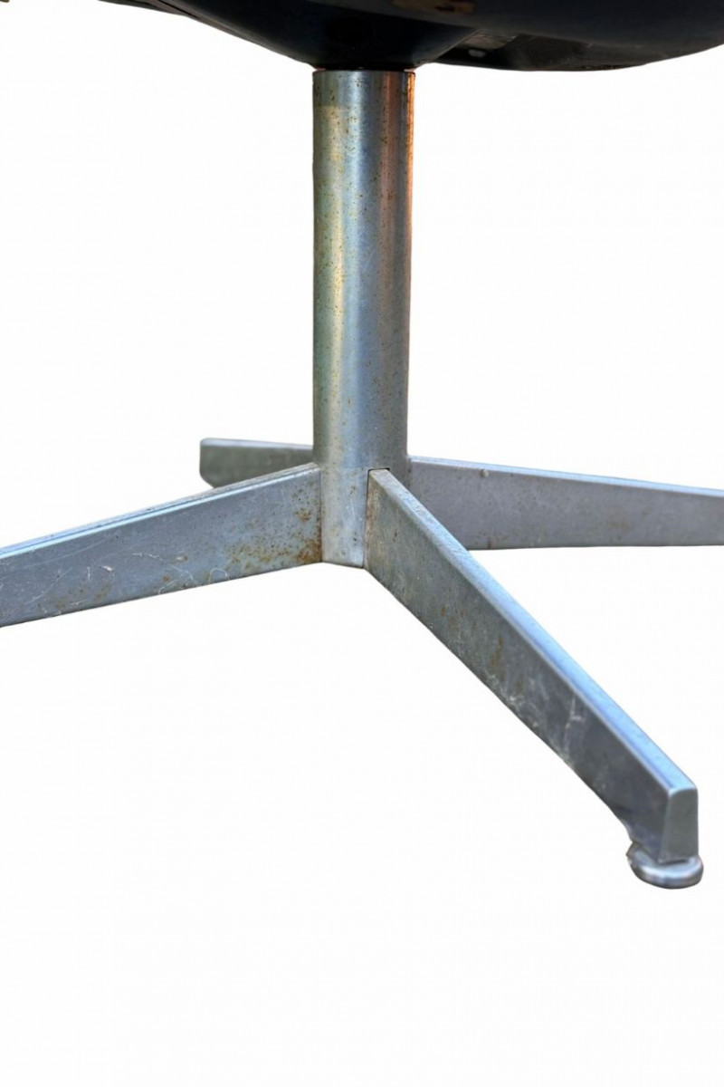 Good vintage condition overall. Upholstery shows visible wear, spotting, and light staining consistent with age and use. Arms and base show minor scuffs and surface wear. Chair swivels properly. No major structural issues observed. Please review photos closely for condition details.