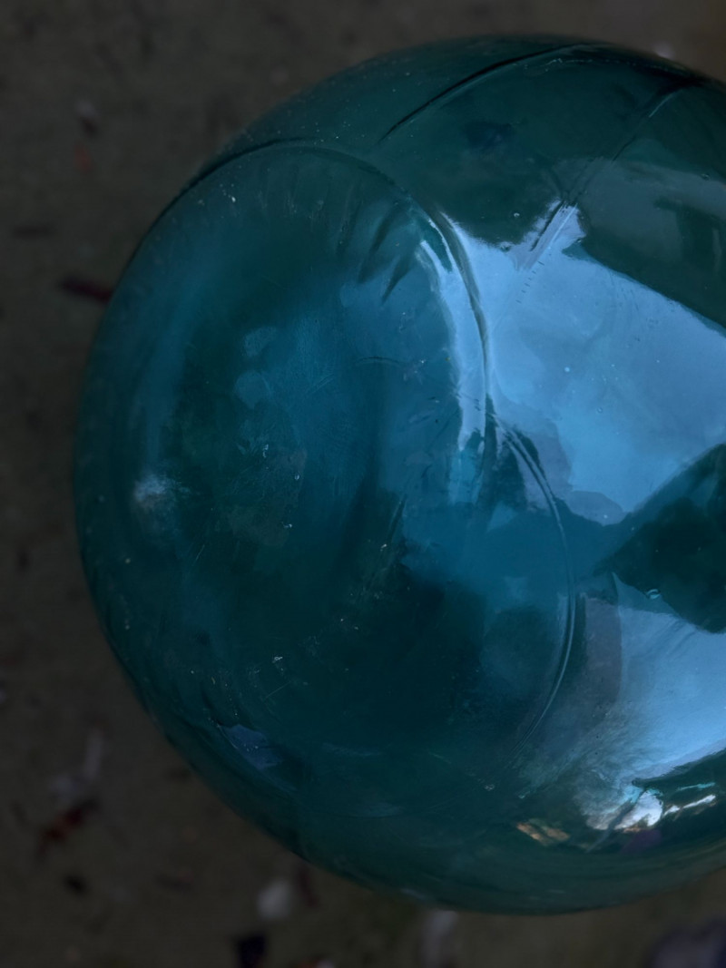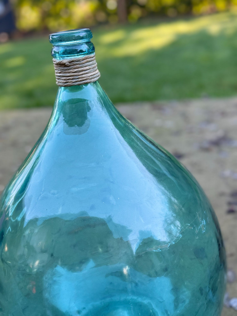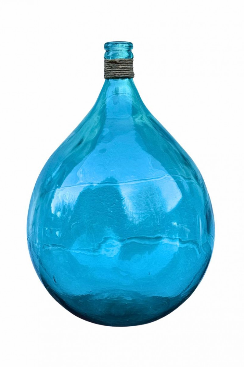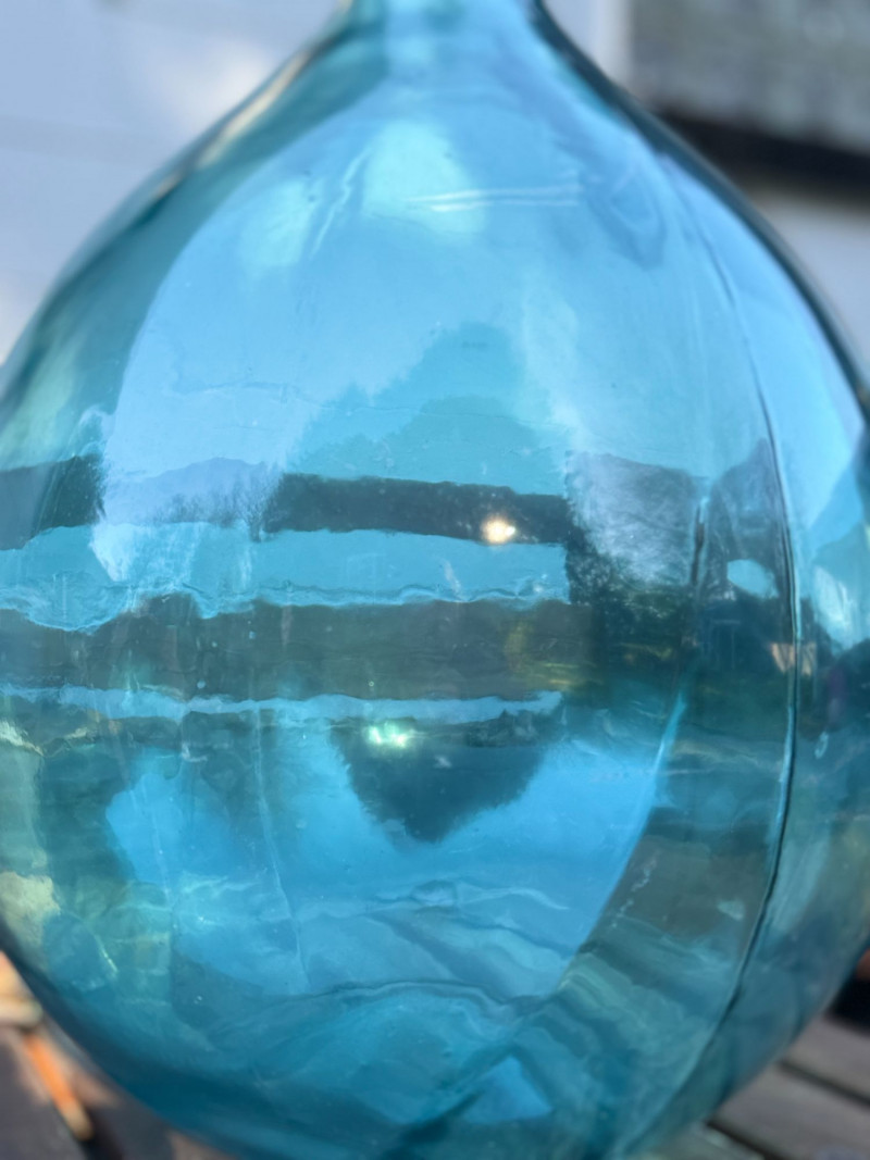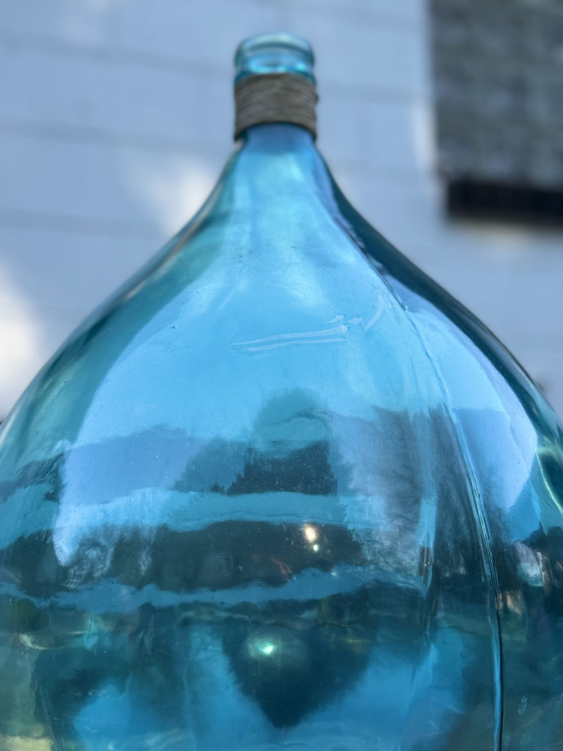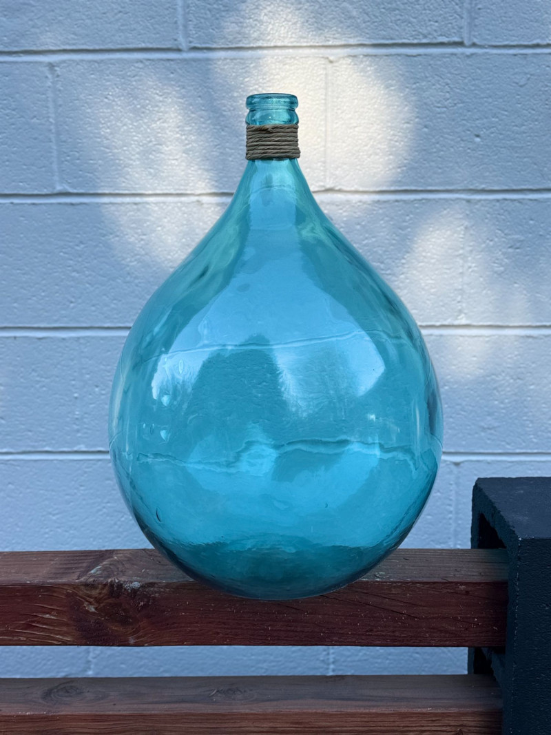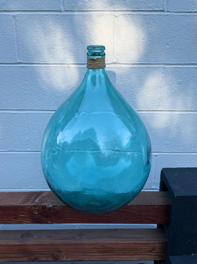 Large Vintage Hand-Blown Blue Glass Demijohn — Spanish or Italian, Turquoise / Aruba Blue This striking large-format vintage glass demijohn features a classic bulbous form with a narrow neck, rendered in a rich turquoise to Aruba blue hue. Hand-blown with visible character and natural variation, the glass displays subtle waviness, thickness changes, and gentle surface imperfections consistent with traditional Mediterranean glassmaking techniques. The saturated blue tone and substantial scale make this piece an exceptional decorative statement for interiors, studios, or garden rooms. Demijohns of this type were historically used for wine, oil, or water storage and are now highly sought after as sculptural decor. The form, color, and craftsmanship closely align with mid-20th-century Spanish and Italian examples. While the exact maker is unknown, the construction and material strongly indicate hand production rather than modern mold-made glass. This piece is one of a kind, with no two examples ever exactly alike due to the hand-blown process. Dimensions (Approximate): Condition: Material: Origin: Date: Historical Note: