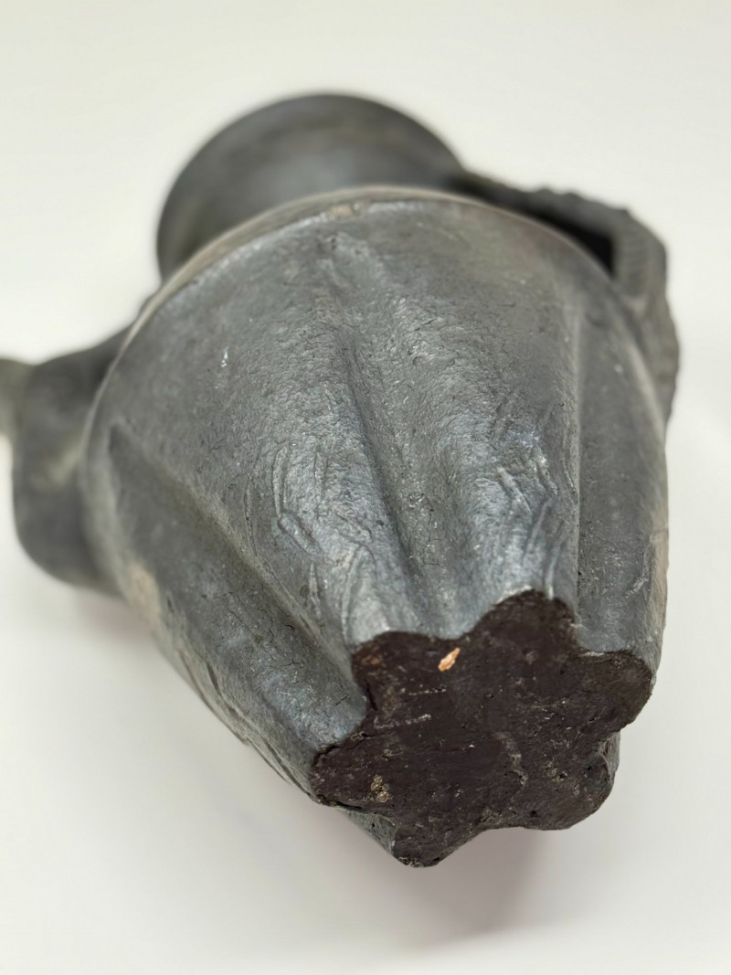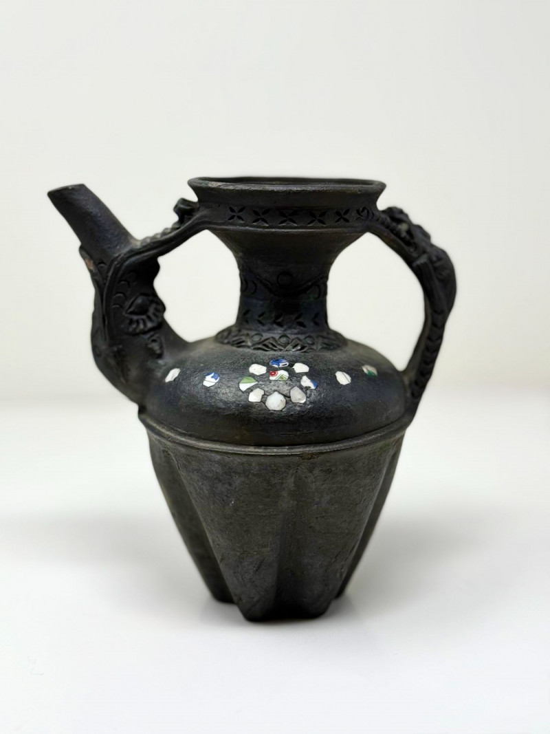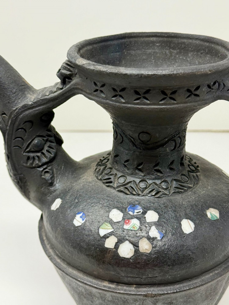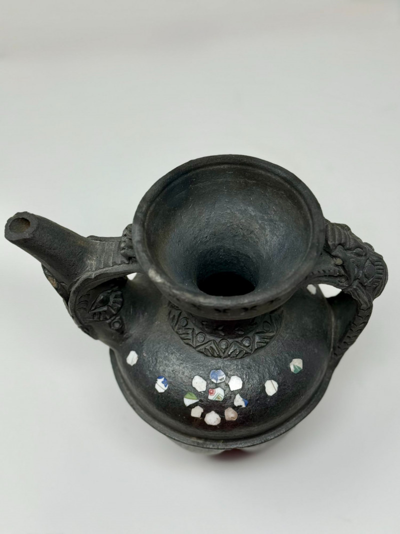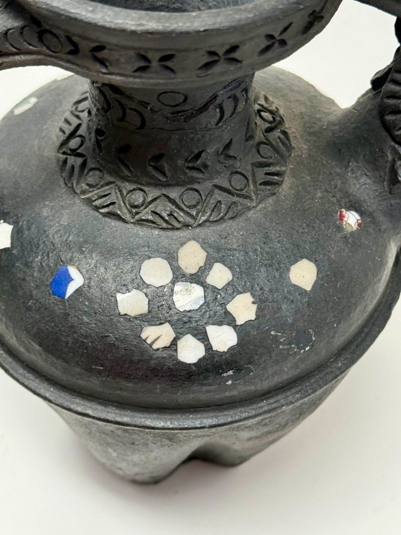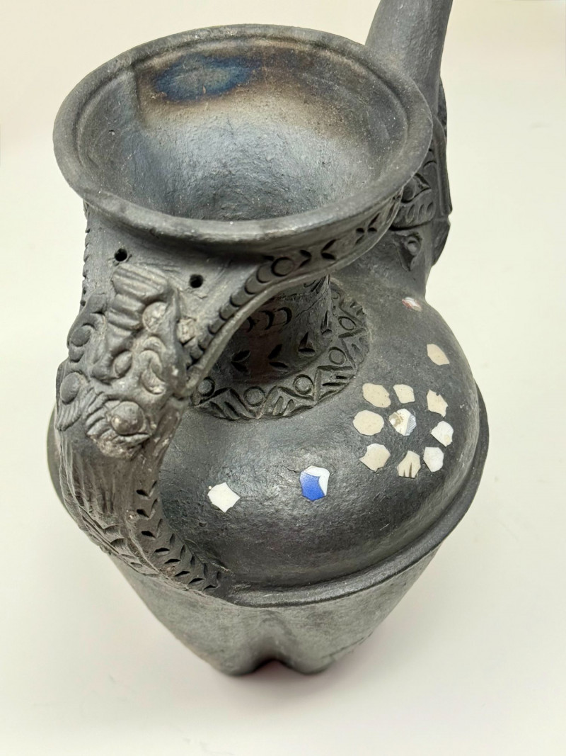 Handcrafted Dangzhen Pichu Tibetan Nixi Black Pottery Dragon Teapot Handcrafted black pottery teapot in the traditional Nixi village Tibetan form, created by Dangzhen Pichu, a known contemporary Nixi pottery artist. This form represents one of the most traditional teapot shapes used in Tibetan households, historically kept over a brazier to maintain heat throughout the day for serving tea. The vessel features elaborate sculptural detailing, including opposing dragon / kirin-style handles, incised decorative bands, pierced detailing near the rim, and inset stone or shell inlay arranged in floral motifs. The dragon figure reflects the Tibetan kirin, a form distinct from the Chinese qilin and traditionally associated with protection and auspicious symbolism. The surface displays natural firing effects consistent with traditional Nixi bonfire firing techniques, including tonal variation and metallic-like surface movement described in Nixi pottery as yaobian, a rare and chance firing effect. The interior is intentionally rough-hewn, consistent with traditional Nixi pottery practices and designed to absorb tea aromas over time, developing a natural patina. This piece is handcrafted and signed by the artist, and is best represented as a decorative and cultural object, rather than for modern daily tea service. Dimensions: Approx. 6.5" H x 6" W x 4.5" D Condition: Good condition. Surface wear and minor variations consistent with hand-crafted pottery and traditional firing methods. Inlay elements appear intact. No major cracks or repairs observed. Please review photos carefully for details. Notes: Nixi pottery originates from Yunnan Province and Tibetan cultural regions and is known for its black clay body, hand-carved decoration, and traditional firing techniques. Dangzhen Pichu is recognized for preserving traditional Nixi forms while producing individually signed works. Teapots of this style have historically been used to brew pu’er tea, often prepared with butter and salt in Tibetan tradition. Estimated Value: $350–$600