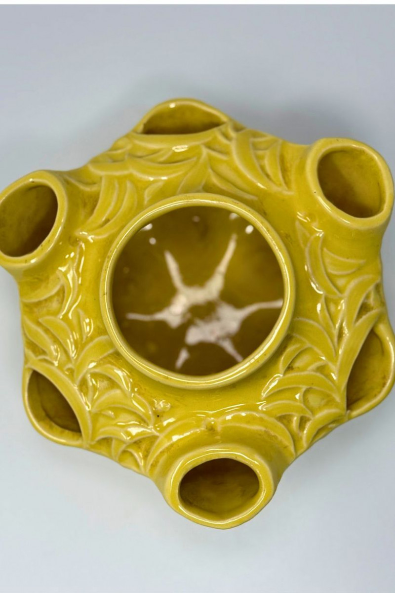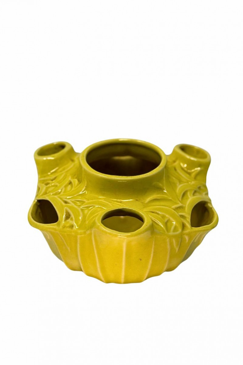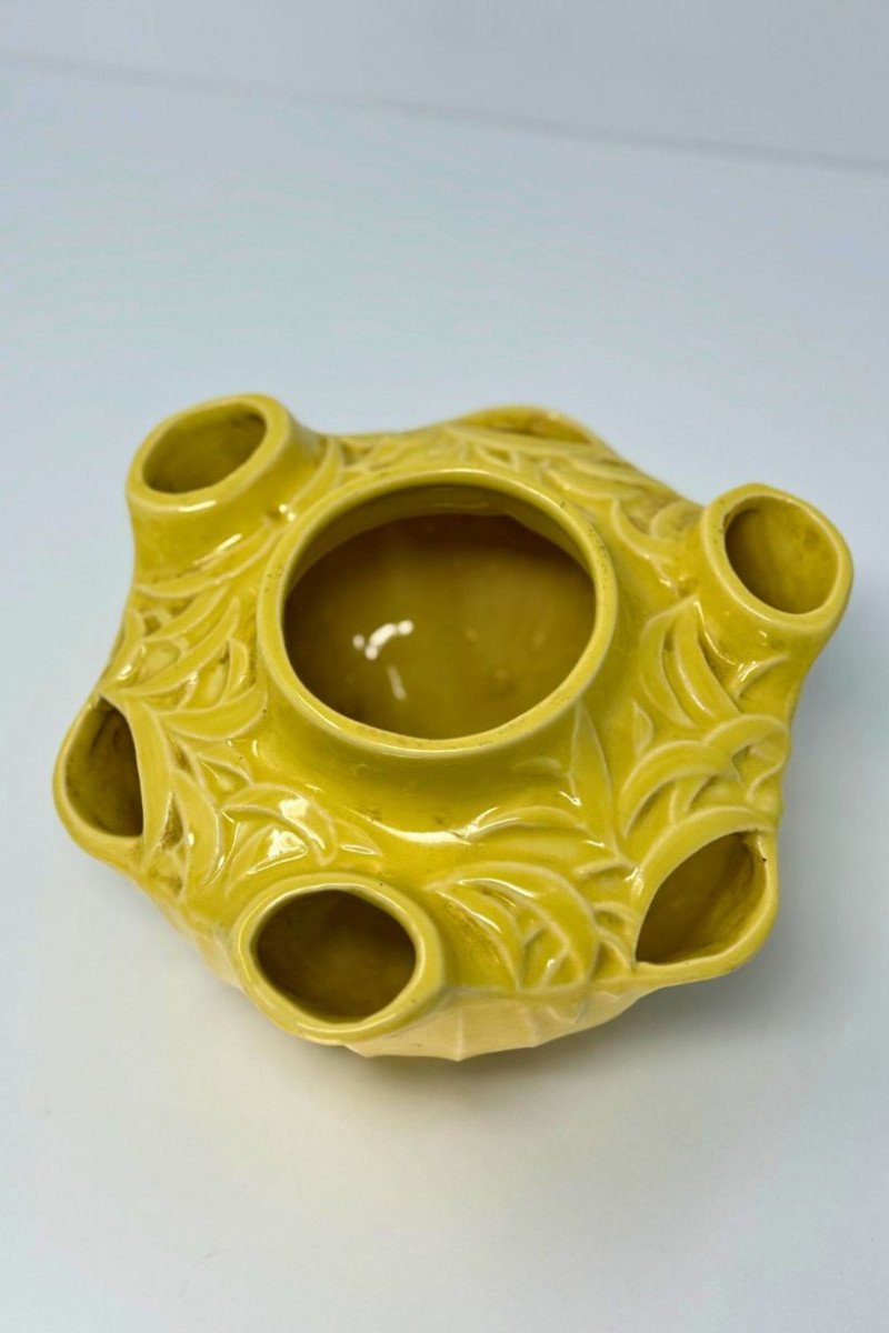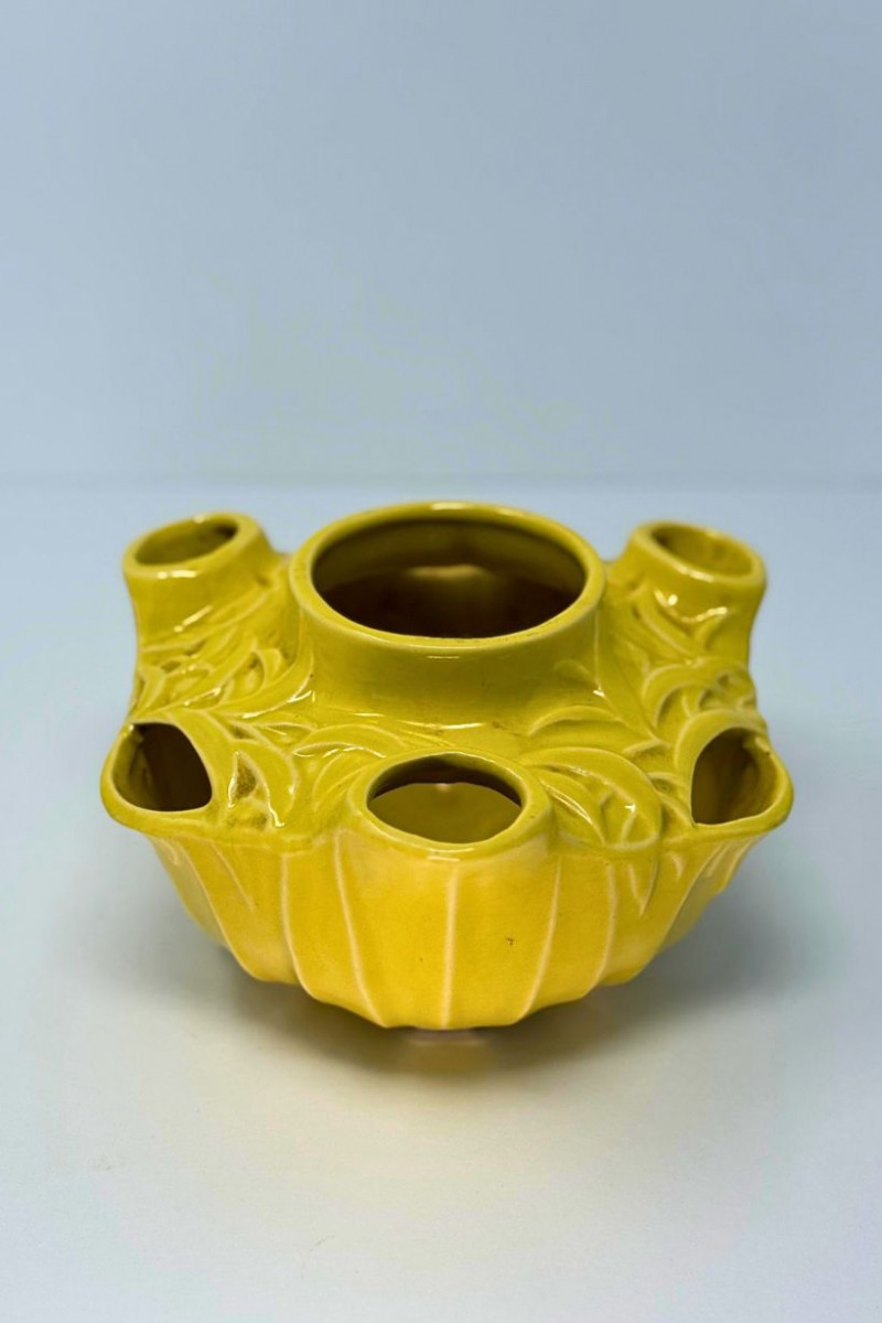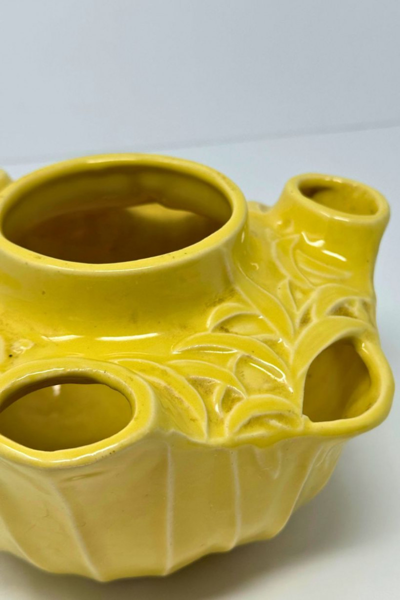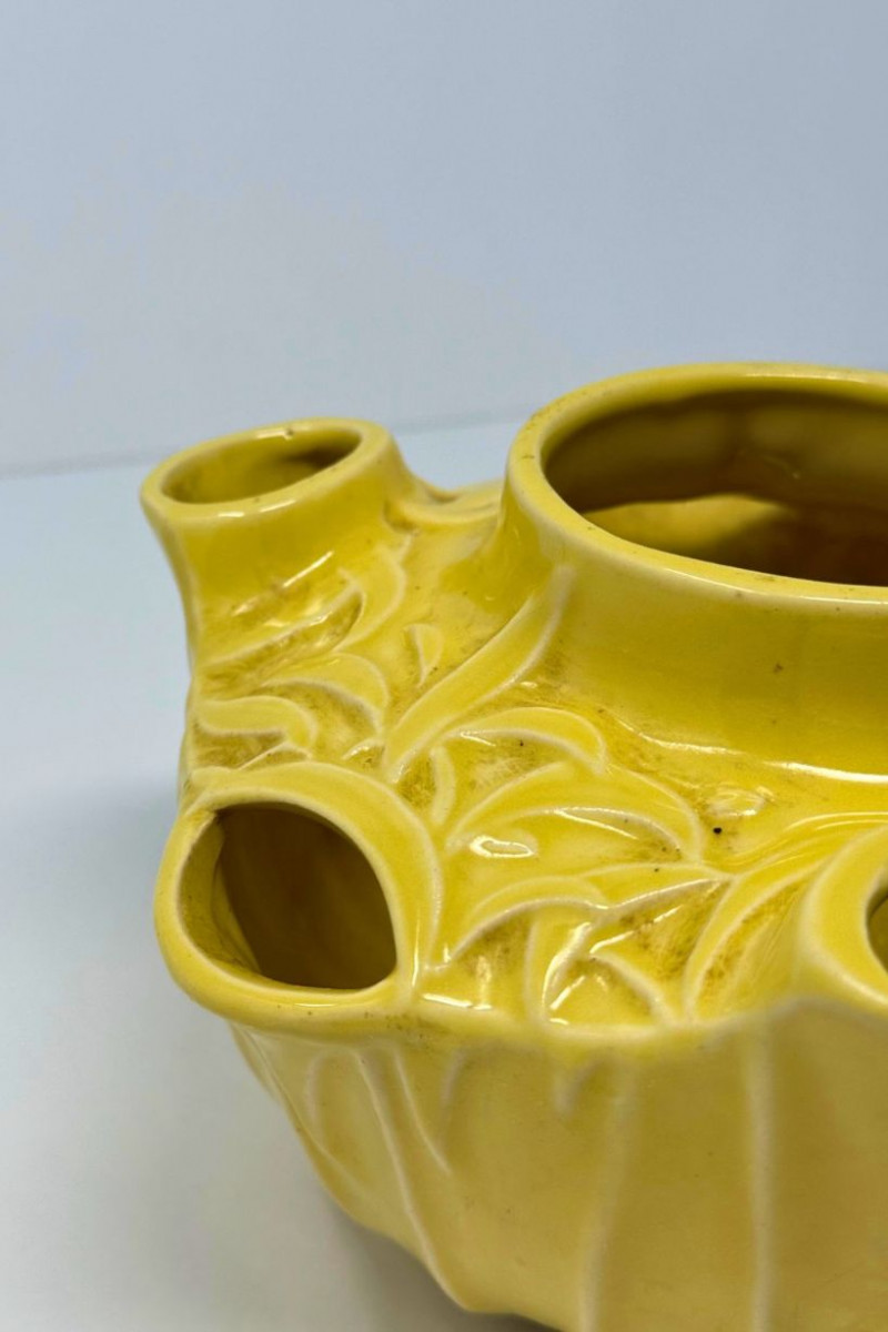 Vintage McCoy Yellow Embossed Art Pottery Floral Centerpiece Bowl This vintage American art pottery centerpiece bowl is attributed to McCoy and features a sculptural, multi-opening form with softly rounded contours and raised floral and foliate embossing throughout. Finished in a warm mustard-yellow glaze, the piece reflects classic mid-century design with organic detailing and decorative versatility. The bowl’s distinctive configuration includes a central vessel surrounded by multiple smaller openings, making it ideal for floral arrangements, candle display, or use as a statement decorative object. Its glossy glaze and dimensional relief work give it visual depth while maintaining the approachable charm McCoy pottery is known for. Type: Art pottery centerpiece / flower bowl Approximate Measurements: Measurements are approximate and provided for reference. Condition: Historical Note: Value Context: