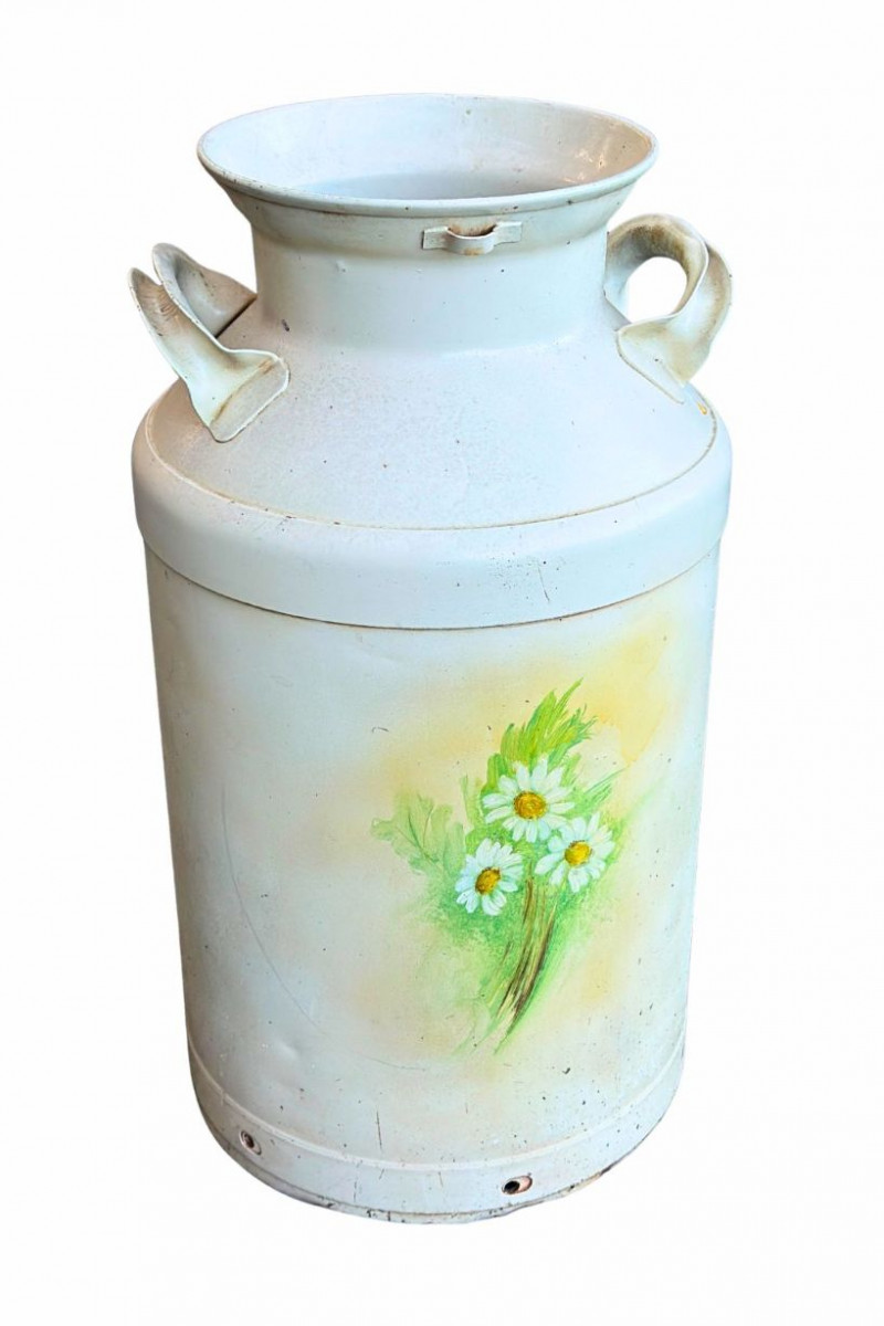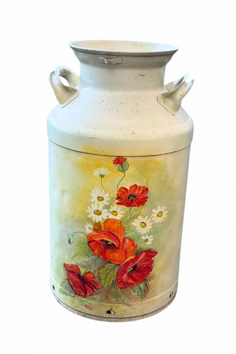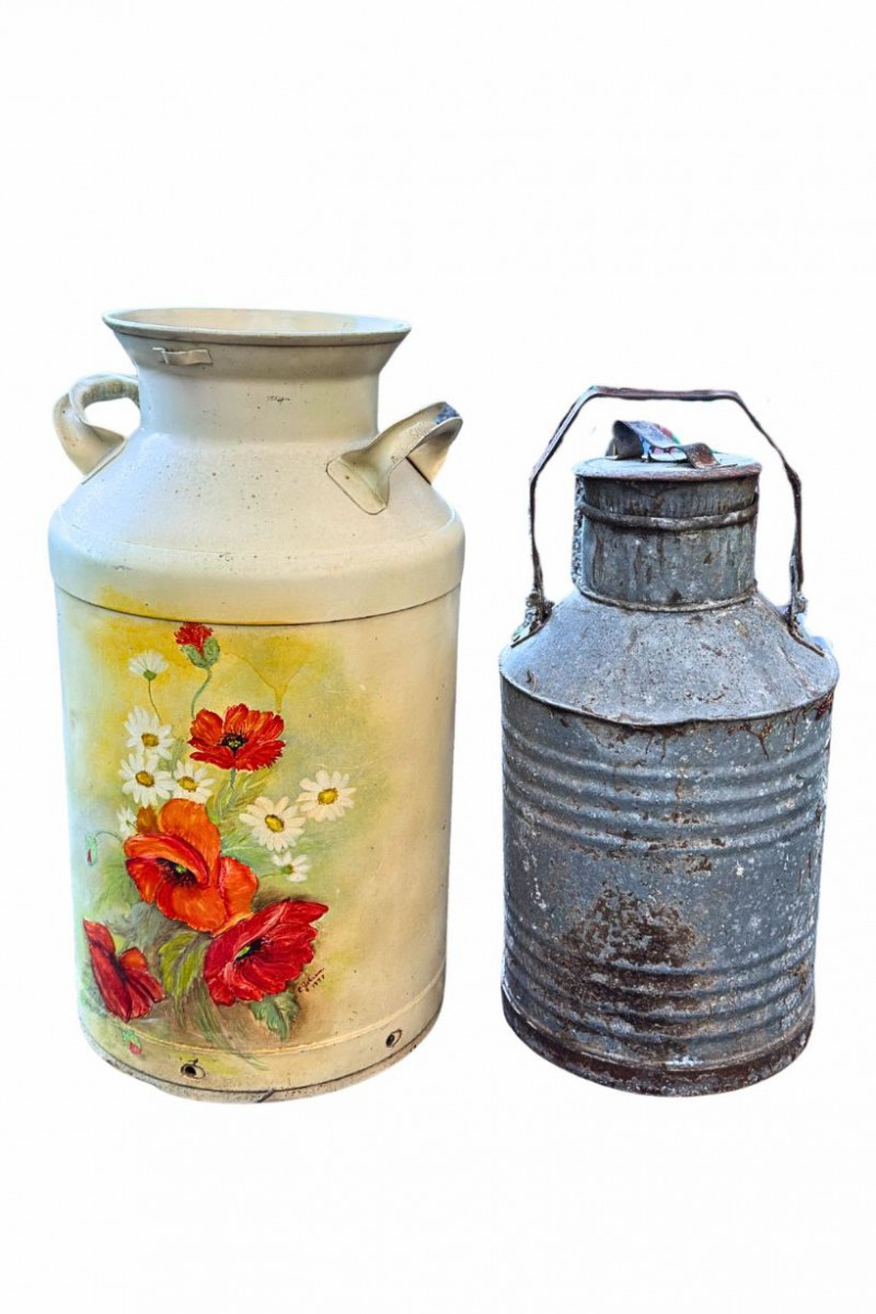 Vintage Milk Can Pair — Hand-Painted Floral Enamel & Galvanized Steel, Farmhouse Decor This vintage pair of milk cans includes one hand-painted enamel can with floral decoration and one galvanized steel milk can with original surface patina. Together, they offer a compelling contrast of decorative folk art and utilitarian farm equipment, making them ideal for farmhouse styling, garden display, or rustic interior décor. The painted enamel milk can features a soft cream ground with hand-painted red poppies and white daisies, giving it a charming, pastoral presence. The galvanized steel can retains its weathered surface, ribbed body, and wire handle, reflecting authentic agricultural use and age. Displayed together, the pair tells a visual story of functional rural life meeting decorative tradition. Type: Milk cans / decorative vessels Approximate Measurements: Measurements are approximate and provided for reference. Condition: Historical Note: Value Context: