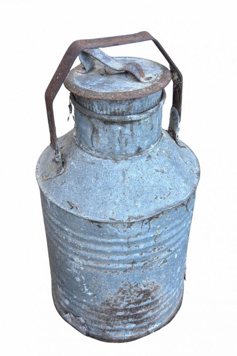 Both pieces show visible age, wear, and surface imperfections consistent with vintage agricultural items. Painted can shows scuffs, paint wear, and small areas of loss; floral decoration remains intact and visually strong. Galvanized can shows rust, oxidation, dents, and surface wear throughout. Structurally solid overall. No active leaks tested. Please review photos closely for condition details.