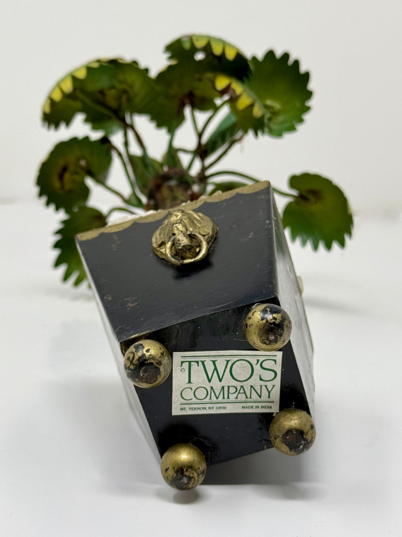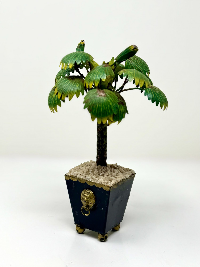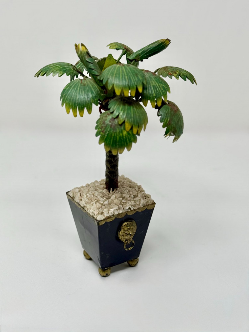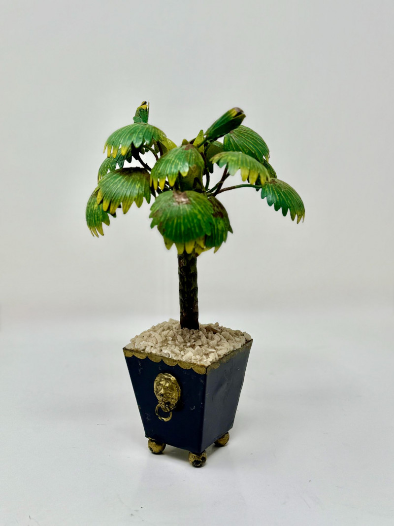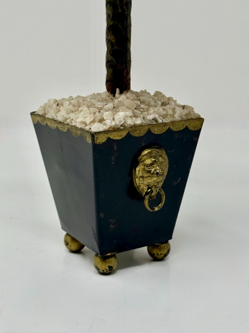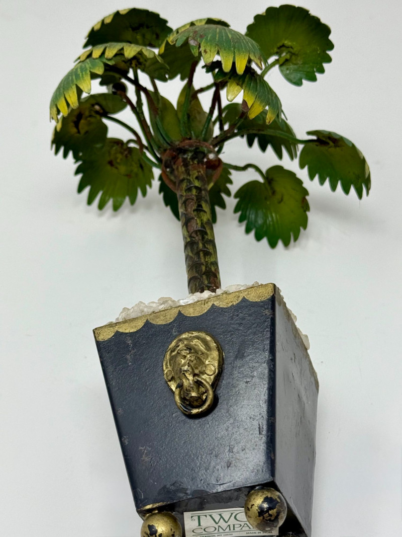 Vintage Hollywood Regency Italian Tole Palm Tree Candlestick in Planter Vintage Hollywood Regency style tole palm tree candlestick crafted in painted metal and presented in a square decorative planter. The piece features layered, hand-formed palm fronds in graduated green tones, mounted on a textured trunk that terminates in a shallow cup designed to hold a single taper candle. The square metal planter is finished in a dark painted surface with gilt scalloped trim, raised ball feet, and a decorative lion-head ring motif on the front. The top is filled with white crushed stone, typical of Italian tole candlestick planters of the mid-20th century, providing both stability and visual contrast. Examples of this form were produced in Italy and widely used as accent lighting or decorative objects in Hollywood Regency and neoclassical-inspired interiors. The piece displays beautifully whether used as a candlestick or as a sculptural decorative object. Dimensions: Approx. 9.5" H x 5" W x 5" D Condition: Good vintage condition with light surface wear, minor paint loss, and age-appropriate patina throughout. Some wear to edges, raised details, and gilt accents consistent with decorative use. No major bends, breaks, or repairs observed. Please review photos carefully. Notes: Italian tole palm tree candlesticks became popular in the mid-20th century for their association with glamour, travel, and resort-style living. Palm motifs were especially favored in Hollywood Regency interiors and remain highly collectible today. Estimated Value: $200–$400
