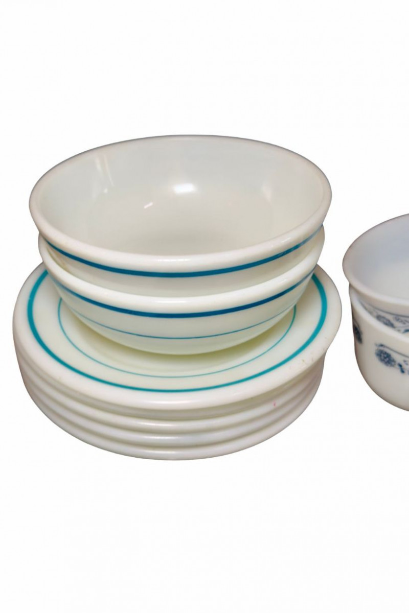 Good vintage condition overall. Light surface wear, utensil marks, and minor scuffing consistent with age and use. No cracks observed. Some pieces may show small manufacturing marks or light discoloration typical of vintage milk glass. Please review photos closely for full condition details.