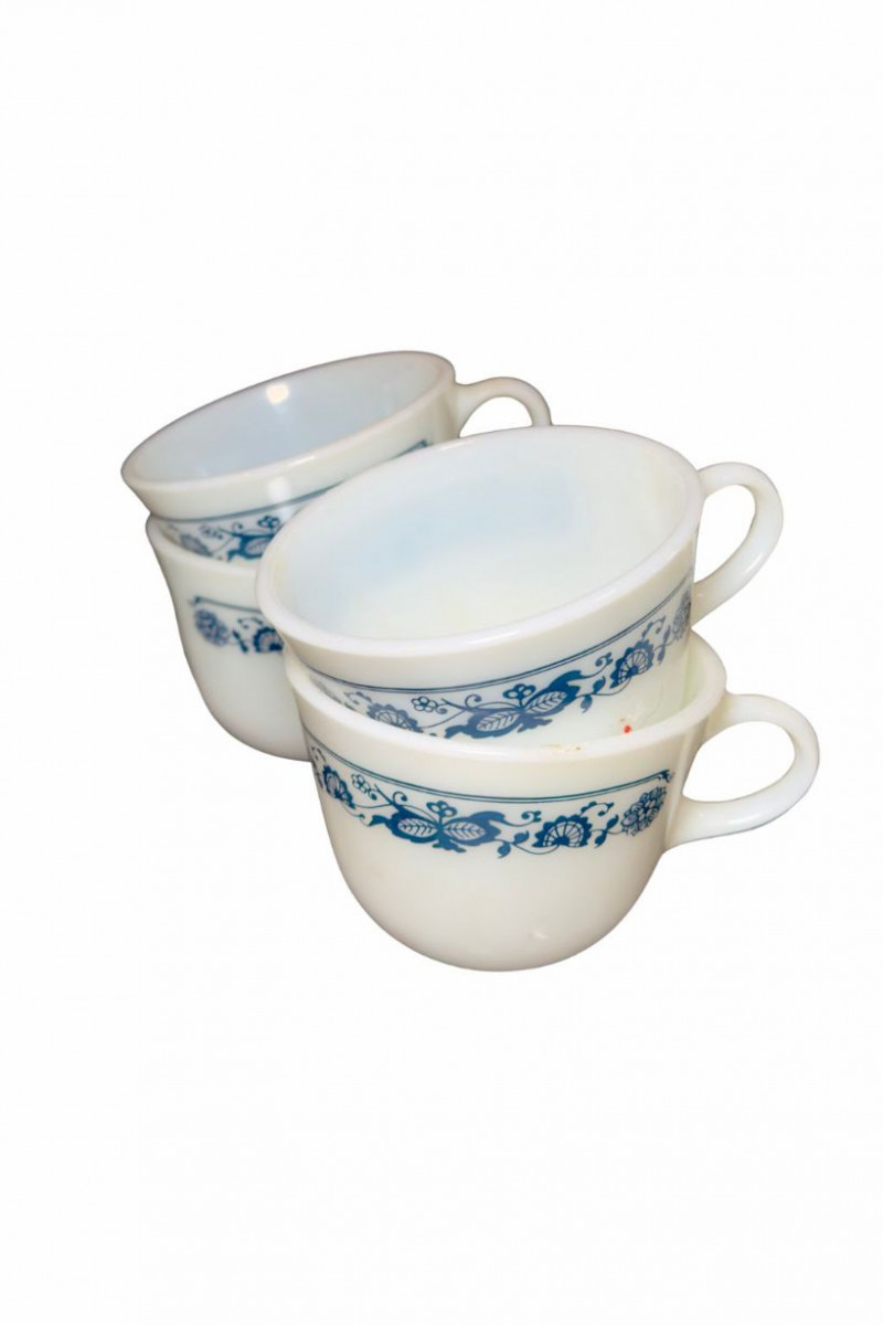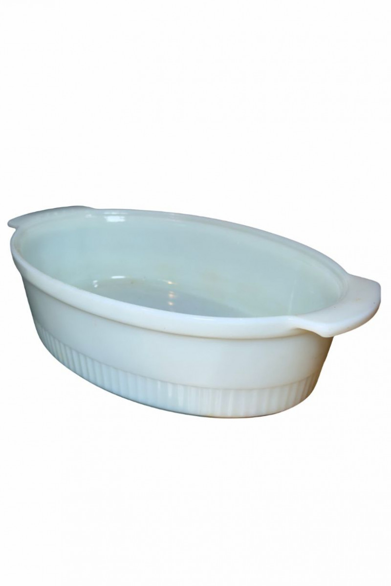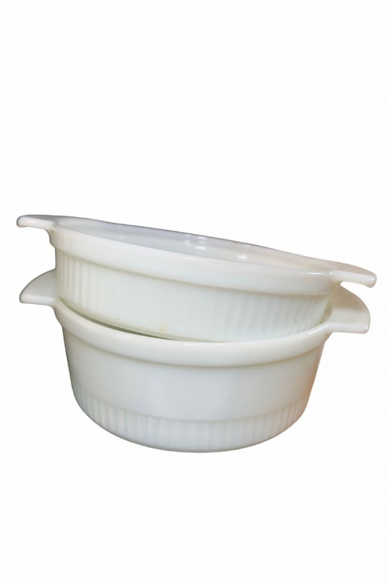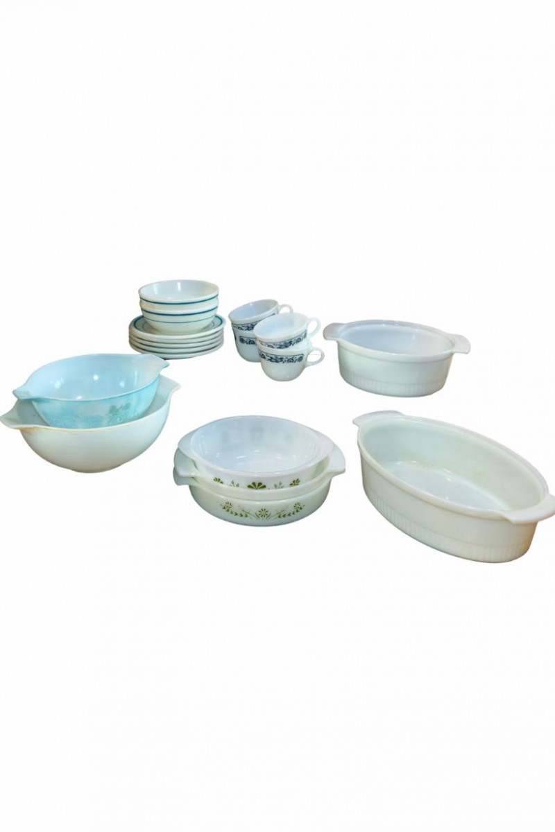 Vintage Pyrex & Fire-King Milk Glass Bakeware and Tableware Mixed Lot This vintage mixed lot features a coordinated assortment of Pyrex and Fire-King milk glass bakeware and tableware, showcasing classic mid-century American kitchen design. The collection includes handled casseroles, nesting bowls, cups and saucers, and coordinating serving pieces, unified by durable milk glass construction and understated decorative detailing. Several pieces display hallmark Pyrex and Fire-King forms, including oval and round casseroles with integrated handles, ribbed exteriors, and select green floral or botanical motifs. Additional items include matching cups and saucers and small bowls, reflecting the practical yet elegant aesthetic that defined mid-century household glassware. Designed for both everyday use and oven-to-table serving, these pieces were staples of American kitchens from the postwar era onward. The lot offers versatility for functional use, display, or collection building. Type: Mixed bakeware and tableware lot Approximate Measurements: Measurements are approximate and provided for reference. Condition: Historical Note: Value Context: