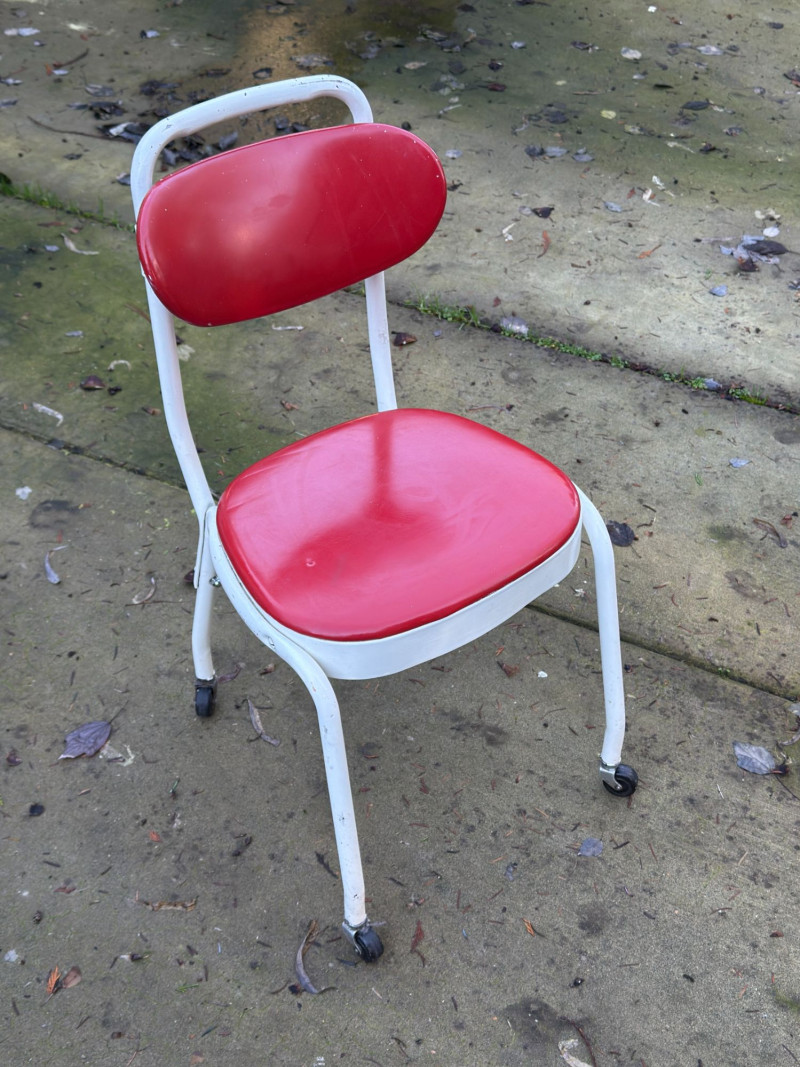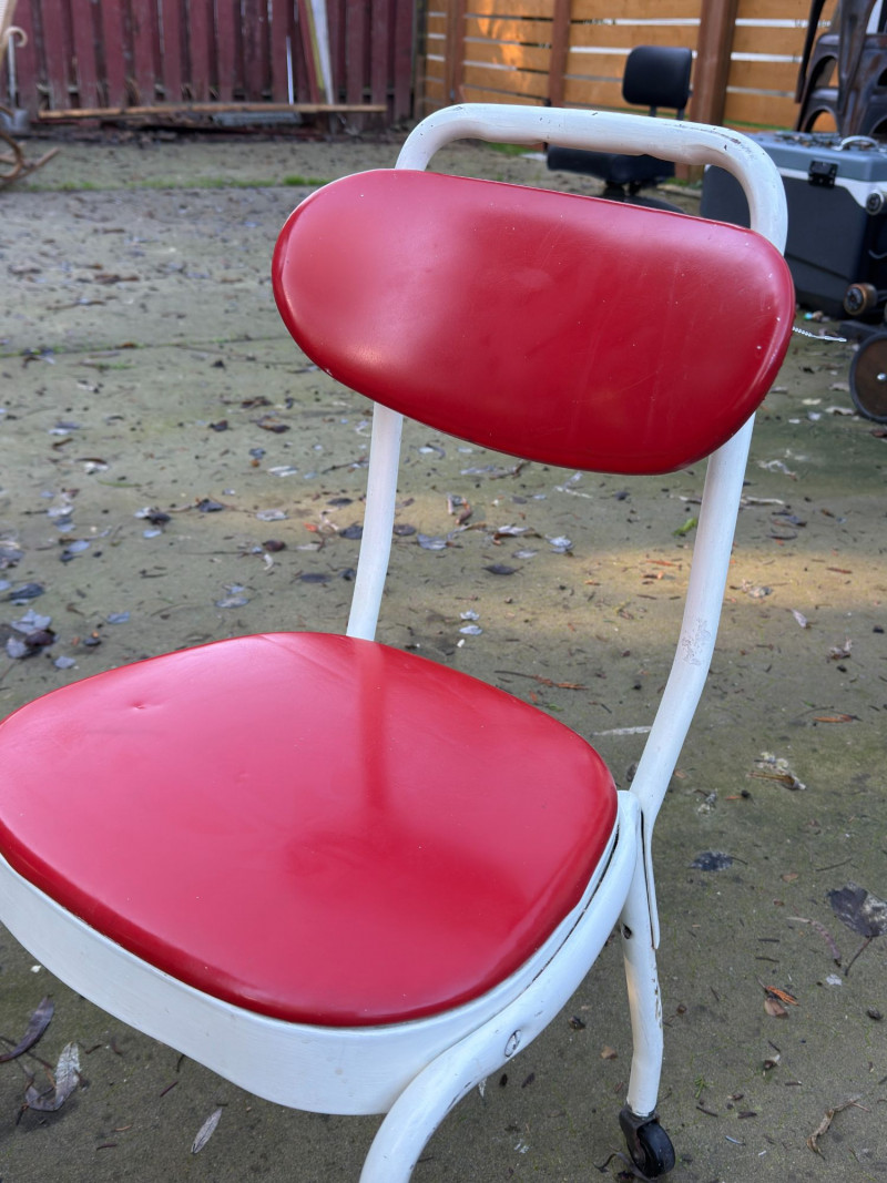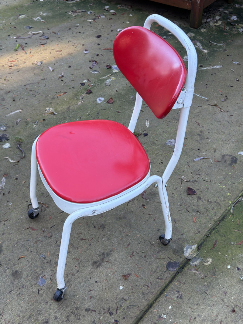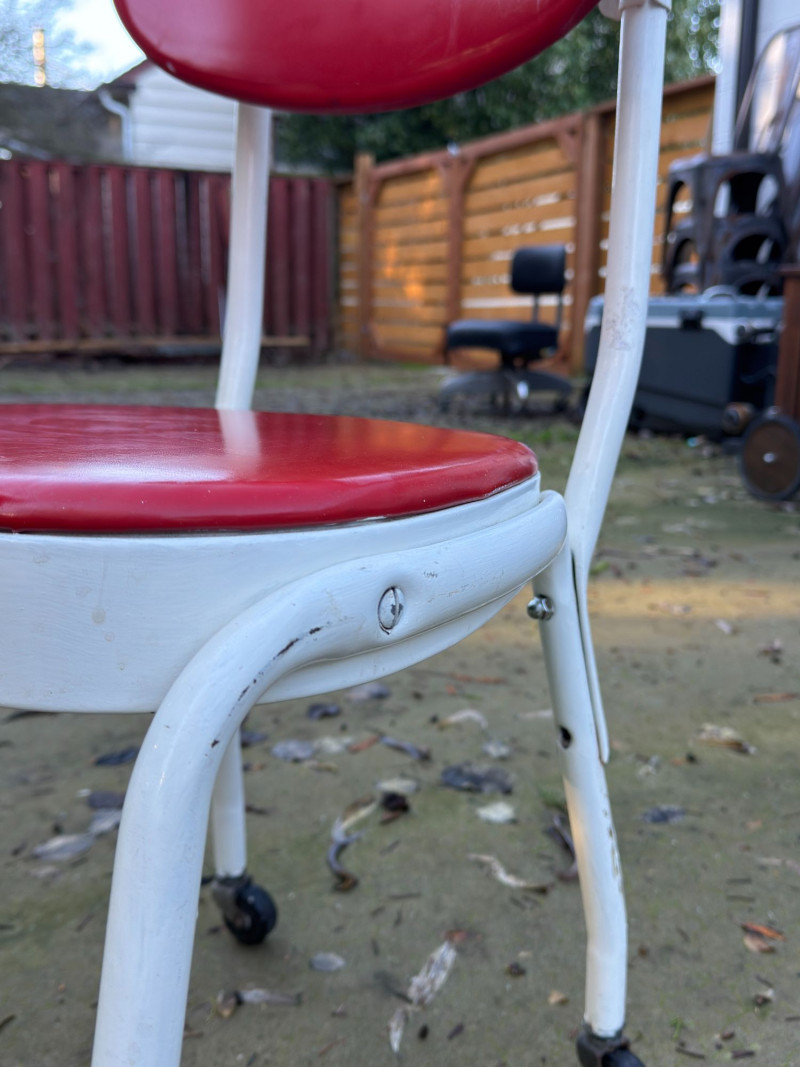 This vintage mid-century industrial chair is attributed to Westinghouse Cosco and is commonly referred to as a mangle chair, originally designed for use in laundry rooms, utility spaces, and light industrial or institutional settings. The chair features a white-painted tubular metal frame with a molded red vinyl seat and backrest, offering both durability and classic mid-century styling. Designed with simplicity and function in mind, this chair reflects the practical aesthetics of postwar American manufacturing. The gently curved backrest, compact proportions, and bold red-and-white color combination make it an excellent accent chair for a kitchen, studio, workspace, or vintage-inspired interior. Type: Industrial chair / mangle chair Approximate Measurements: Measurements are approximate and provided for reference. Condition: Historical Note: Value Context:Vintage Westinghouse Cosco Mangle Chair — Red Vinyl, White Metal Frame, Mid-Century Industrial