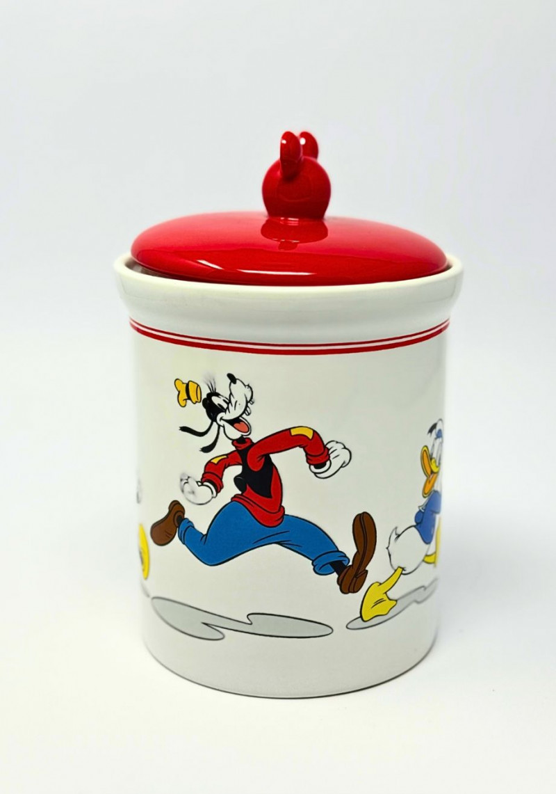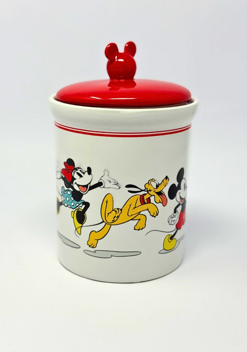 This vintage Disney ceramic tableware set was produced by Gibson and features classic Mickey Mouse graphics rendered in bold primary colors with clean linework and glossy glaze. The set includes a lidded cookie jar topped with a sculptural Mickey finial, paired with coordinating mugs and display plates, creating a cohesive and highly collectible grouping. Finished in a bright white glaze with red, black, and yellow accents, this set reflects late 20th-century Disney merchandising that blended everyday household function with nostalgic character design. Originally produced for kitchen use, Gibson Disney ceramics are now widely collected for display, themed décor, and pop-culture appeal. Type: Ceramic tableware and kitchen décor set Approximate Measurements: Measurements are approximate and provided for reference. Condition: Historical Note:Vintage Disney Mickey Mouse Gibson Ceramic Tableware Set — Cookie Jar, Plates & Mugs