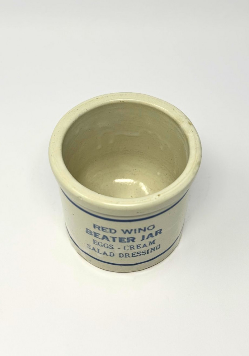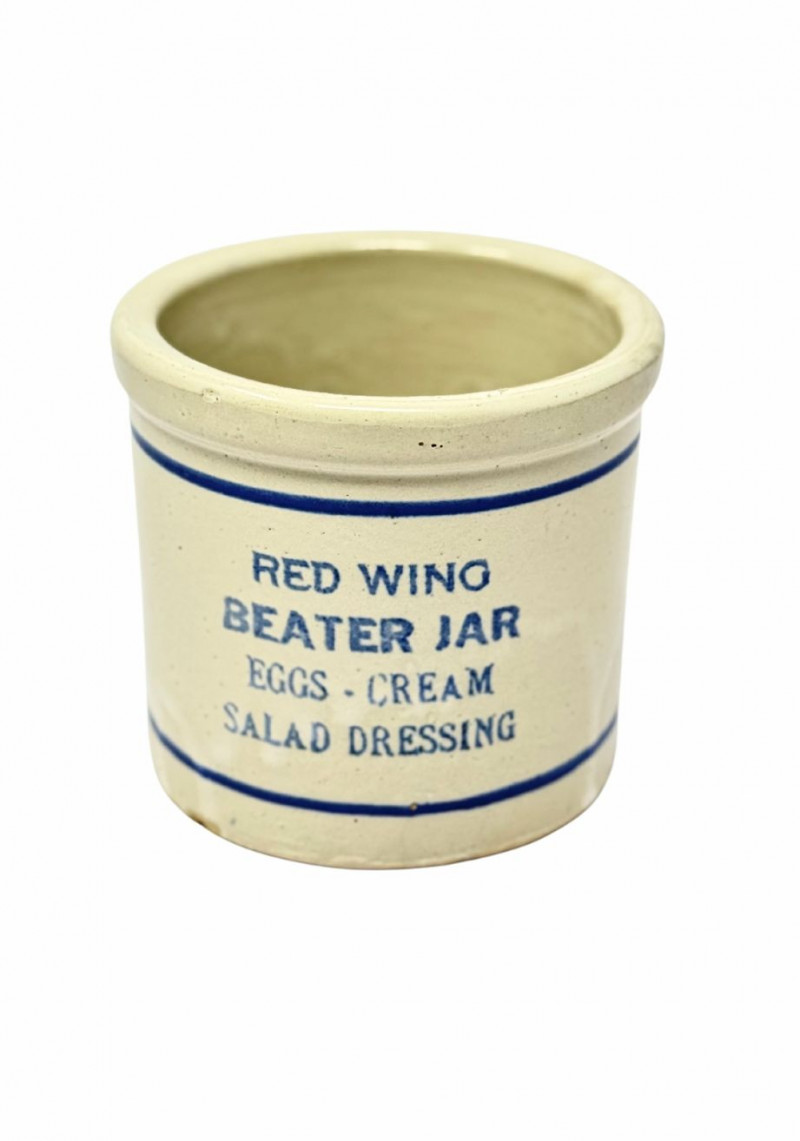 Antique Red Wing Stoneware Beater Jar — Eggs, Cream & Salad Dressing This antique American stoneware beater jar is attributed to Red Wing Pottery and features the classic cylindrical form with bold cobalt-blue stenciled lettering reading “Red Wing Beater Jar – Eggs • Cream • Salad Dressing.” Designed for early 20th-century kitchen use, this utilitarian vessel was intended to hold hand mixers or beaters for preparing eggs, cream, and dressings. Finished in a warm cream glaze with blue banding and stencil decoration, this piece exemplifies Red Wing’s renowned craftsmanship and functional design. Today, original Red Wing beater jars are highly collectible, prized for their graphic typography, historical kitchen context, and strong display appeal. Type: Stoneware beater jar Approximate Measurements: Measurements are approximate and provided for reference. Condition: Historical Note: Value Context: