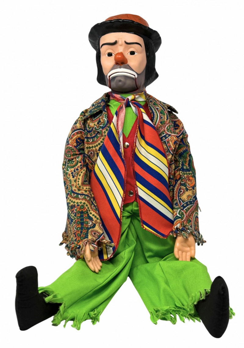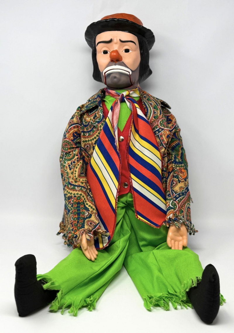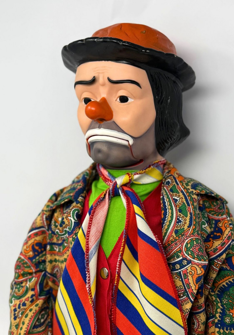 Emmett Kelly Jr. was one of the most recognizable American clown figures of the mid-20th century, and his likeness heavily influenced novelty and performance dolls produced during the 1950s–1960s. Juro Novelty Co. was a prolific manufacturer of ventriloquist dummies and character figures, many of which were inspired by popular entertainers of the era.