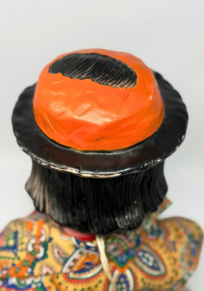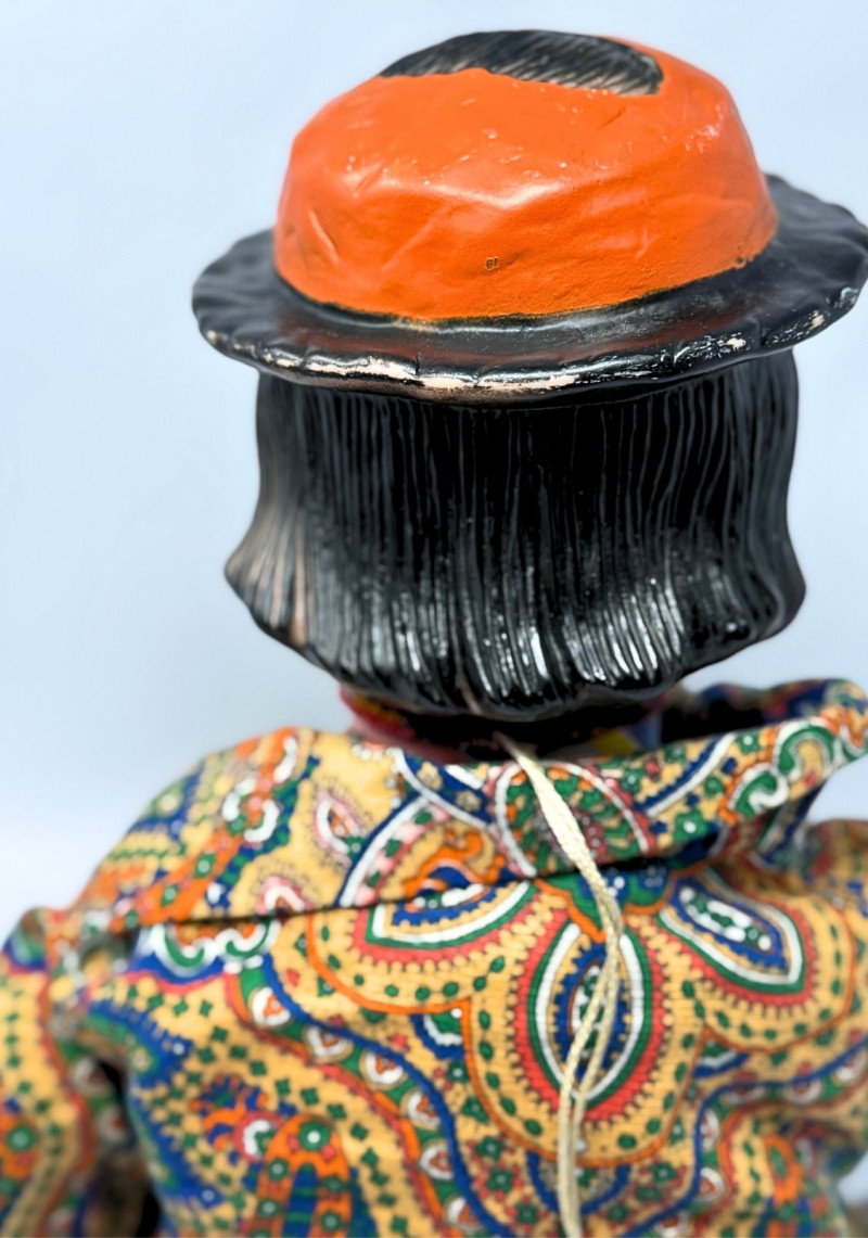 Good vintage condition overall. Light surface wear to the painted face consistent with age. Fabric costume shows minor fraying and wear at cuffs and edges, particularly at the pant hems. Mouth mechanism present; operational status not tested. No major cracks or structural damage observed. Please review photos closely for full condition details.