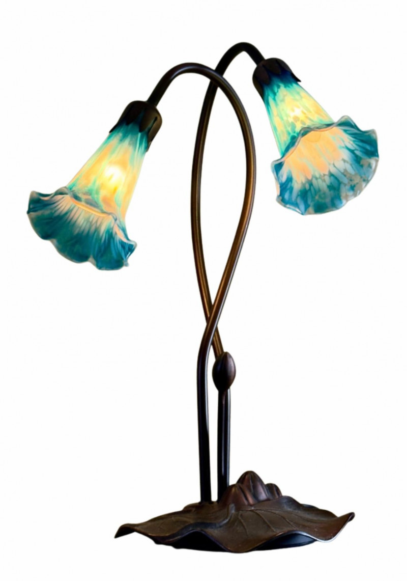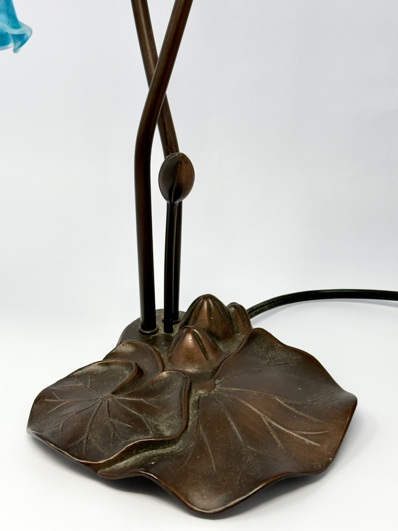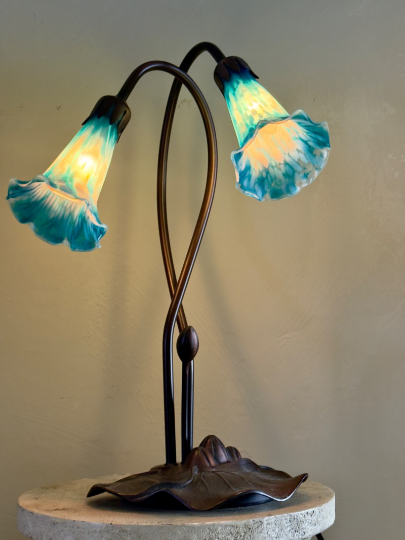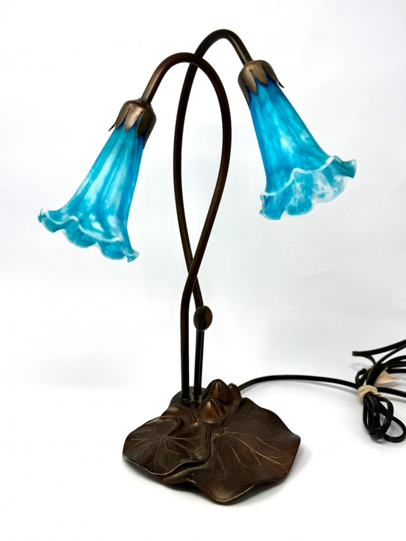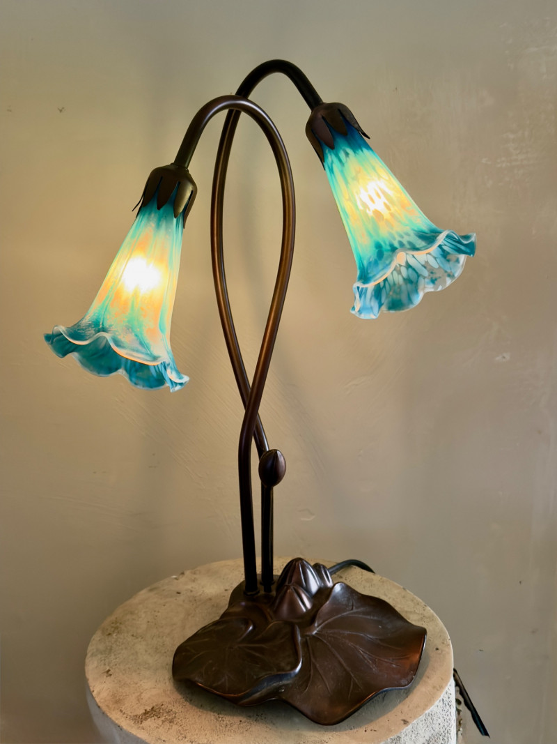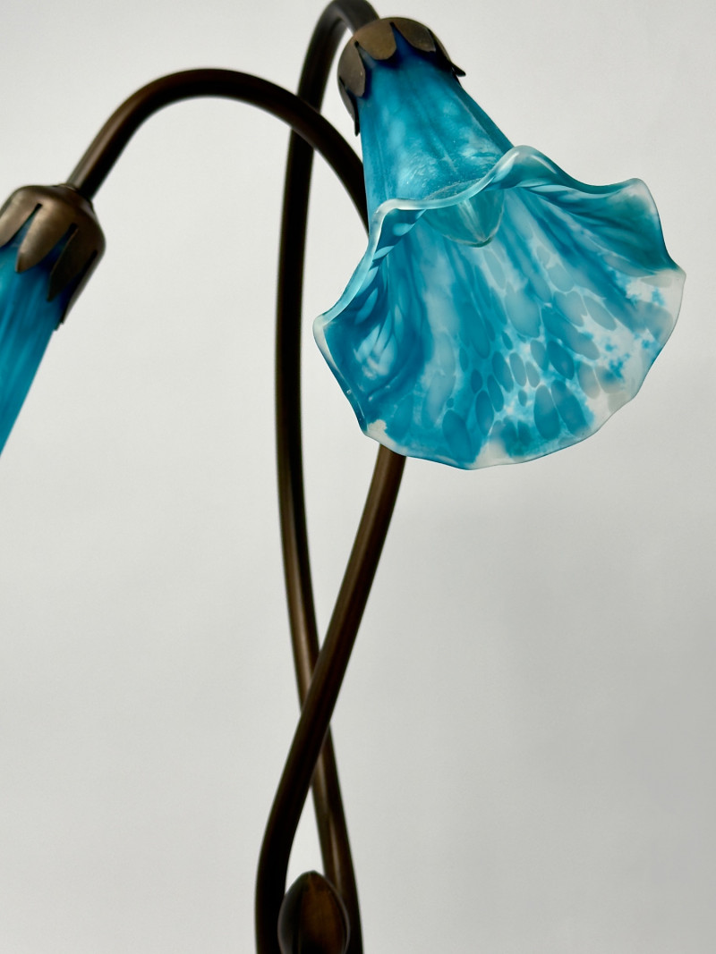 Art Nouveau–Style Dual Arm Table Lamp with Handblown Blue Art Glass Shades This sculptural table lamp features an elegant dual-arm silhouette inspired by Art Nouveau floral forms. The dark metal frame rises from a leaf-form base and curves upward into two sweeping stems, each fitted with a handblown glass shade shaped like an open blossom. The glass shades display a striking blue and aqua mottled pattern that glows warmly when illuminated, creating a soft, atmospheric light. The organic lines, floral detailing, and decorative base give the lamp a refined, turn-of-the-century aesthetic while remaining versatile for modern interiors. Type: Table lamp Approximate Measurements: Measurements are approximate and provided for reference. Condition: Historical Note: Value Context: