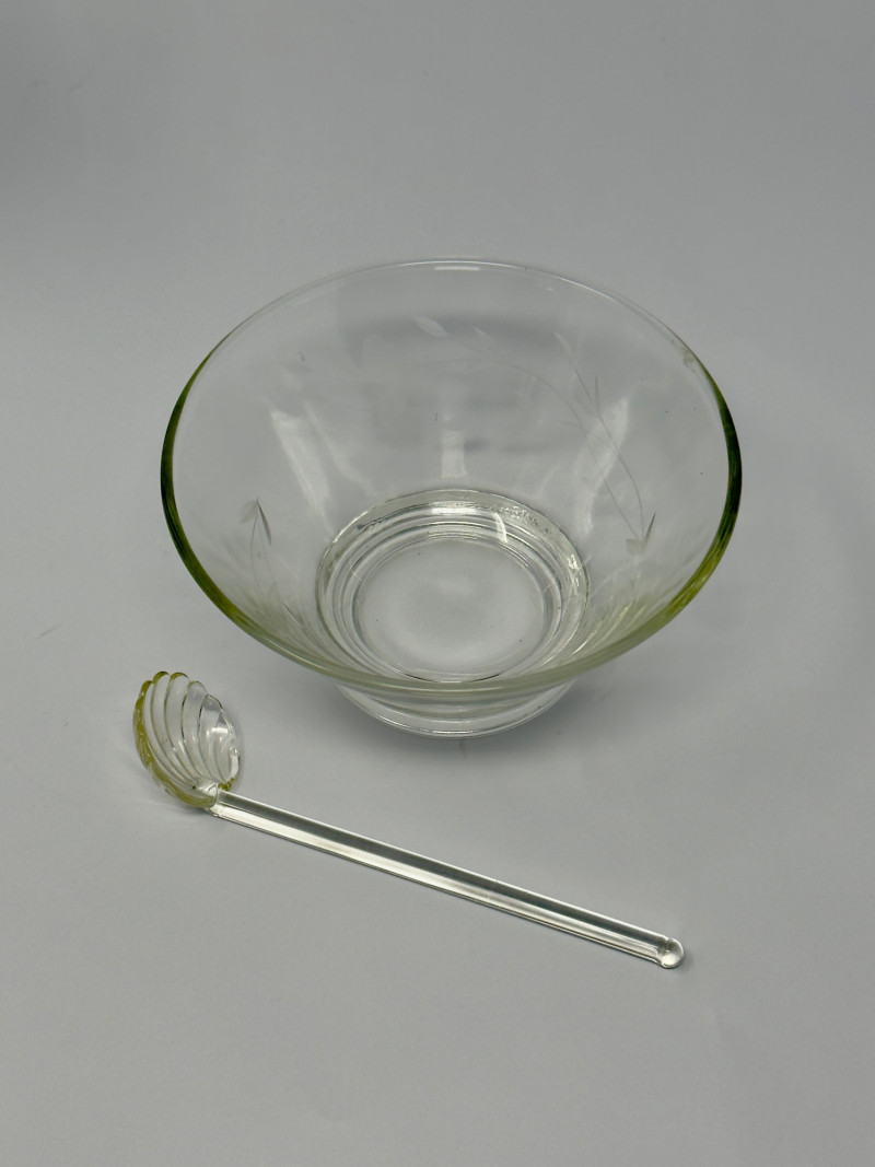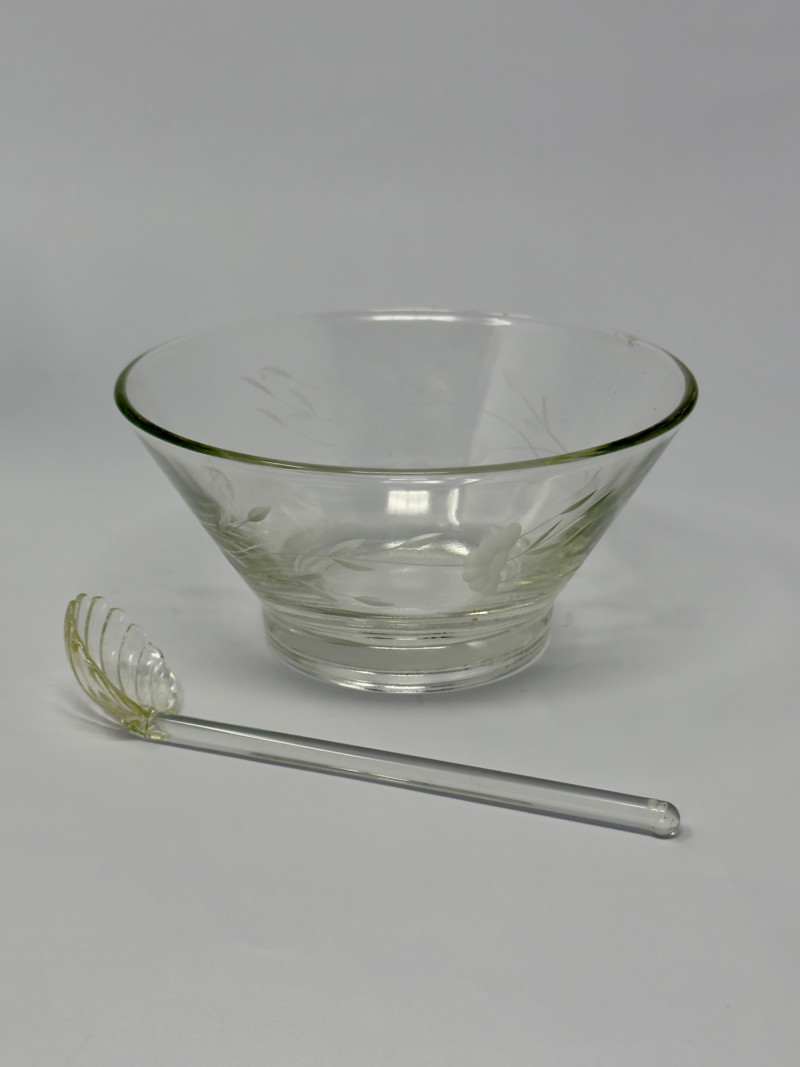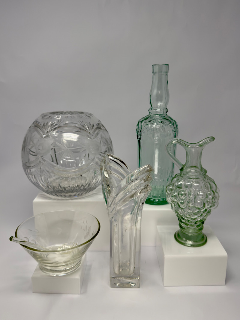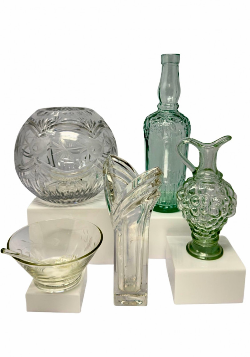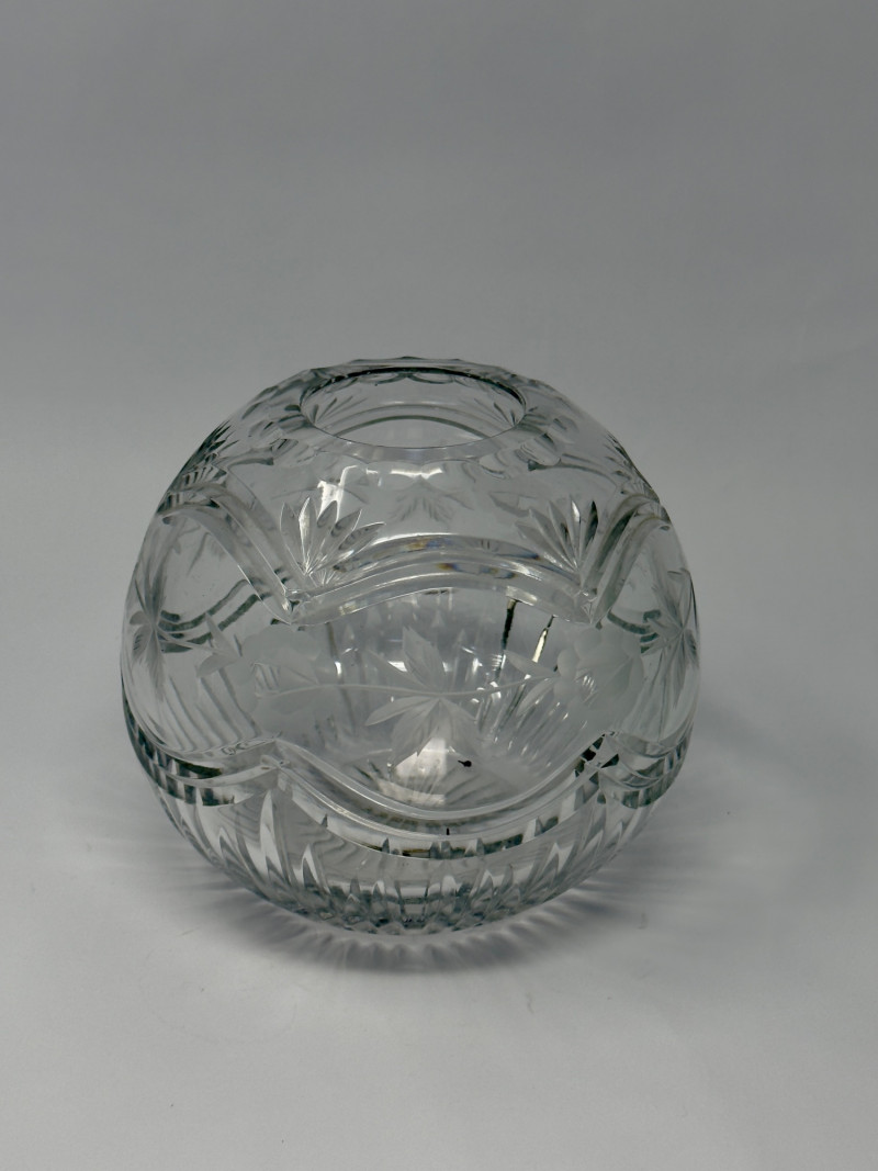 Princess House crystal became widely popular in the late 20th century for its elegant yet accessible etched designs, often sold as serving and hostess pieces. Grape-motif glassware and green pressed bottles were especially fashionable in mid-century home and bar décor, prized for their texture and sculptural presence. Cut crystal rose bowls and fluted vases have long been used as centerpiece or accent pieces, valued for their light-catching qualities and timeless appeal.