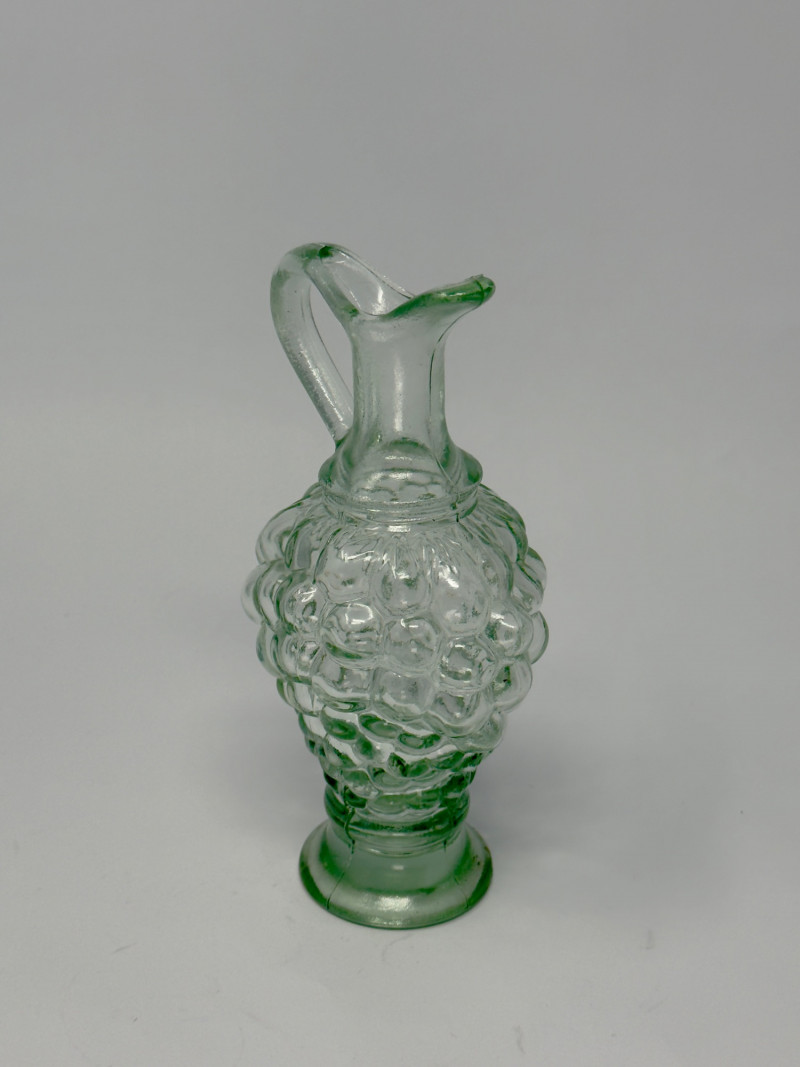 Vintage Glassware Lot with Princess House Crystal, Grape Carafe & Mid-Century Bottles This curated vintage glassware lot includes five distinct decorative and functional pieces spanning mid-century to late 20th-century design. The assortment features pressed, etched, and cut glass forms in both clear and soft green tones, offering a cohesive yet varied collection ideal for display, bar styling, or tabletop use. Included is a Princess House Heritage etched crystal condiment or mayonnaise bowl, known for its delicate floral pattern and classic serving form. Also present are two green glass bottles and carafes, including a grape-cluster relief wine carafe in the style popular during the 1960s–1970s, and a tall green glass bottle with molded detailing reminiscent of oak leaf or botanical motifs. Completing the lot are a clear cut-crystal rose bowl with pinwheel and floral cuts, and a sculptural clear crystal vase with a dramatic fluted, shell-like silhouette. Together, these pieces reflect the enduring appeal of vintage American and European-influenced glass design, blending utility with decorative craftsmanship. Type: Assorted vintage glassware lot Approximate Measurements: Measurements are approximate and provided for reference. Condition: Historical Note: Value Context: